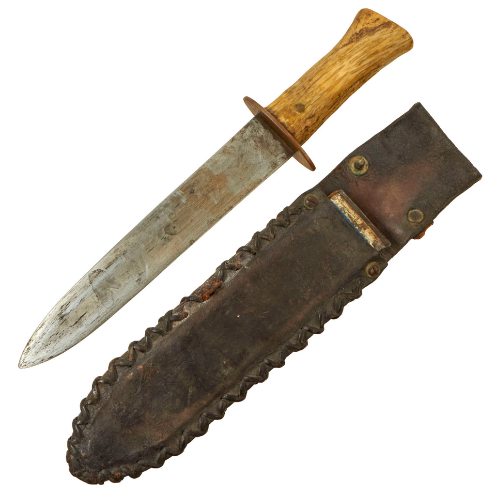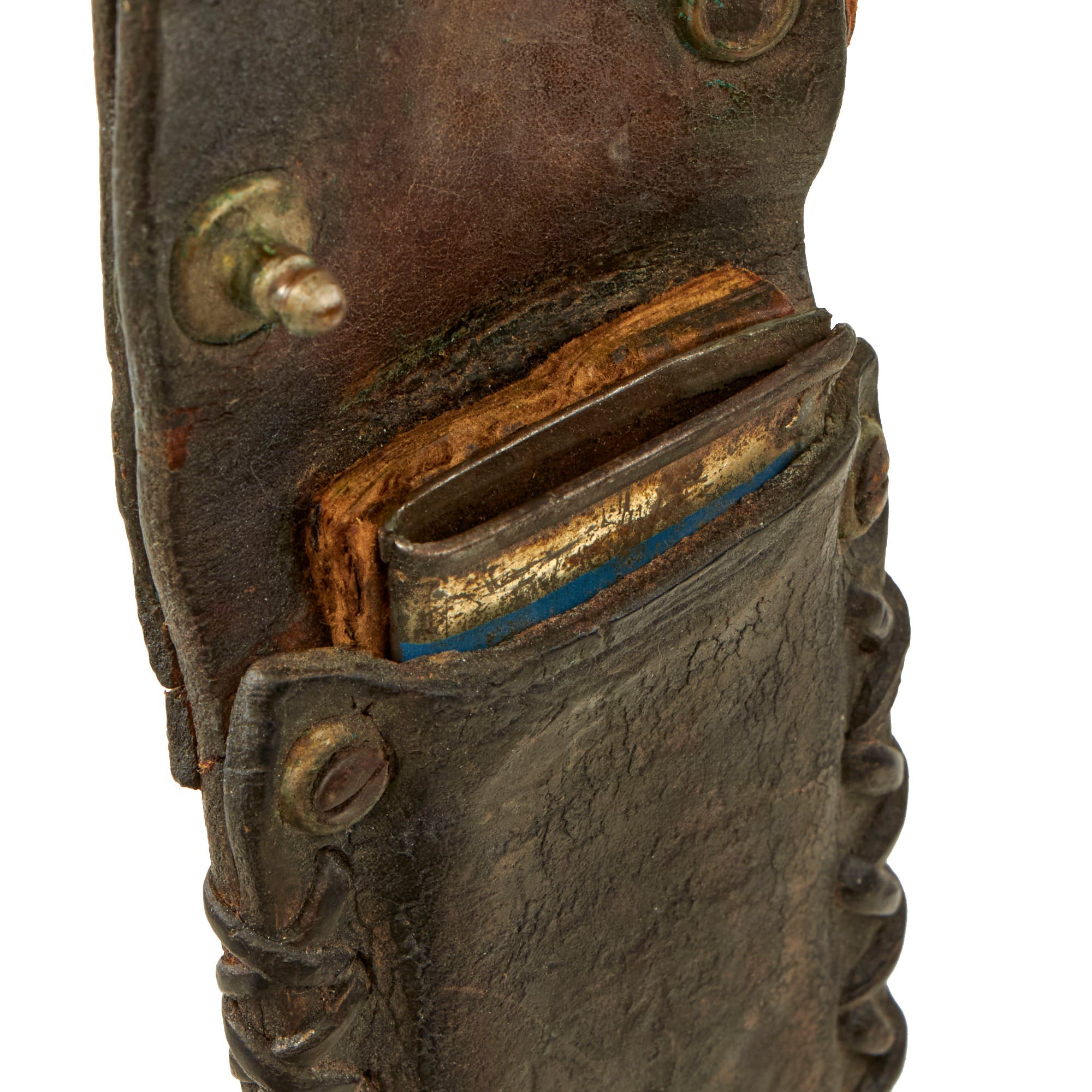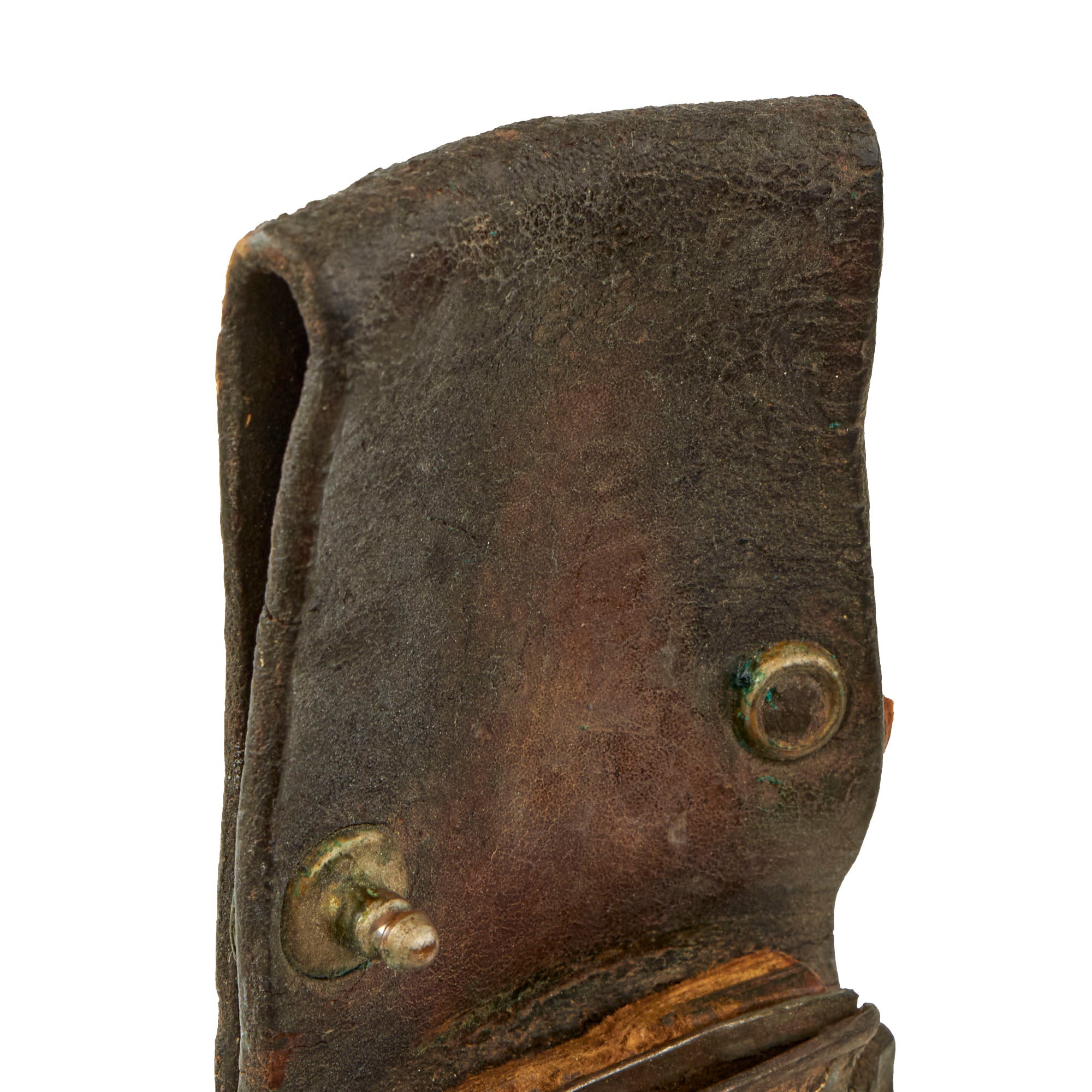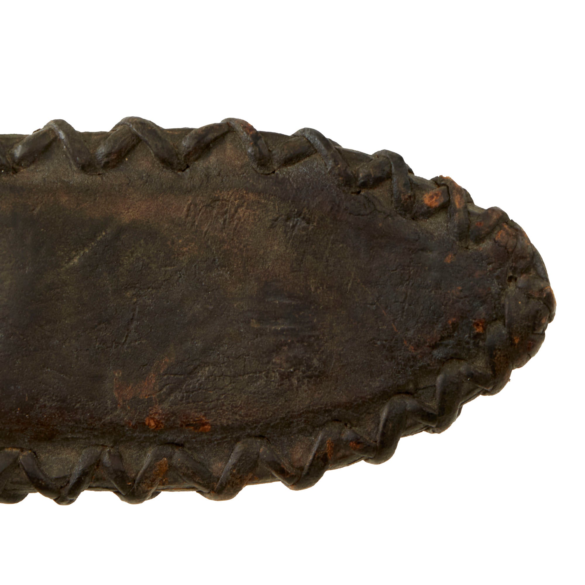The original custom sheath is really a thing of beauty. The leather cover was attached beautifully with leather braids over what looks like a custom-cut tin container for Colgate-Palmolive Glycerine. The inner tin container can still be removed from the outer leather sheath and is just a great custom piece. The sheath is missing the securing strap, and the belt loop is broken off at the back. It measures 13⅝” overall.
