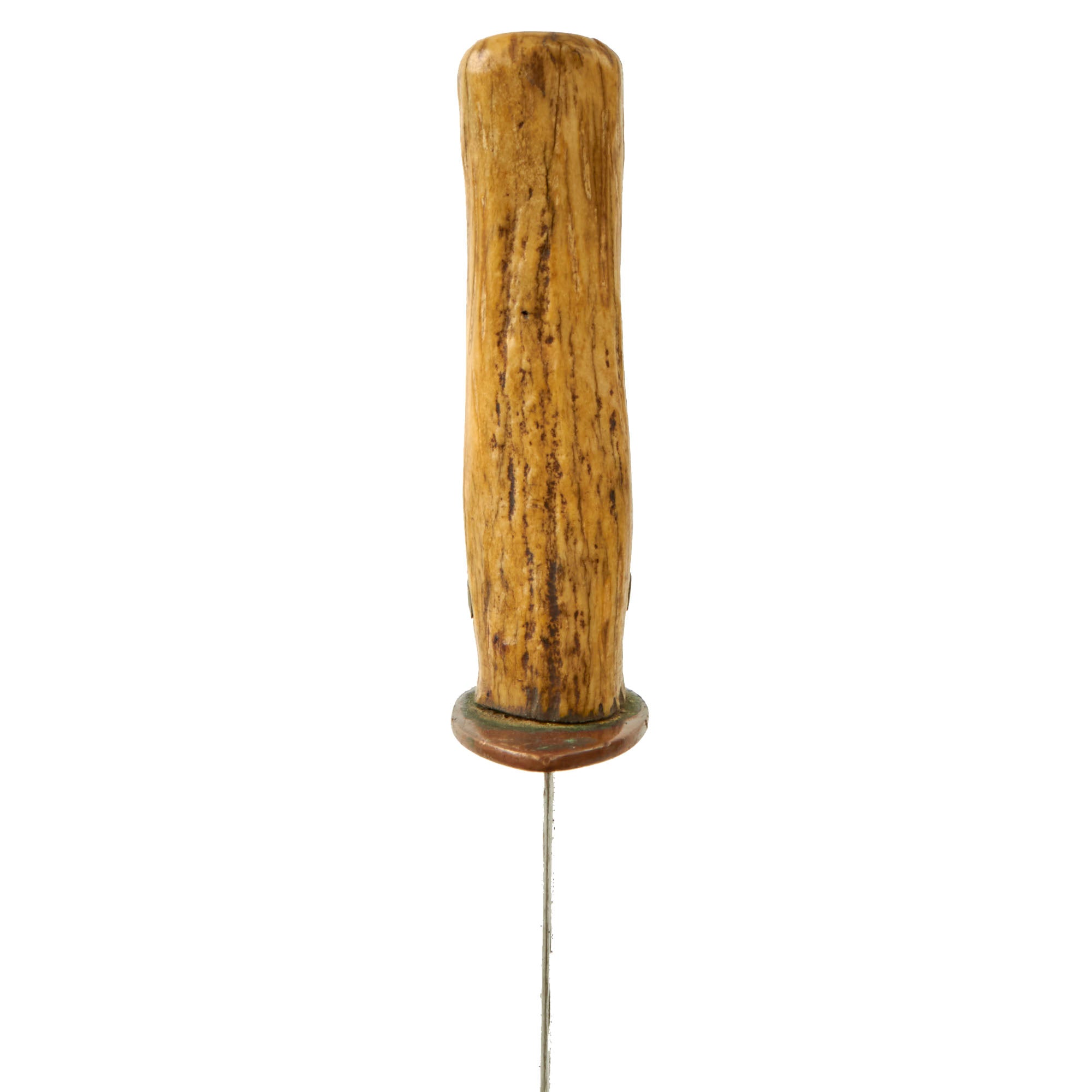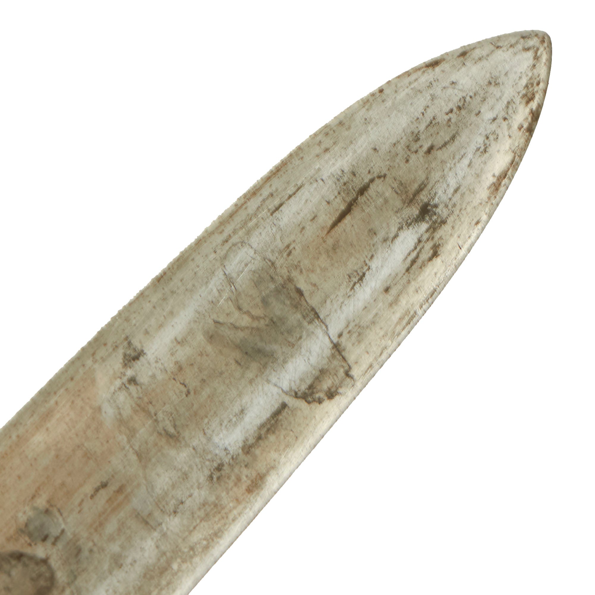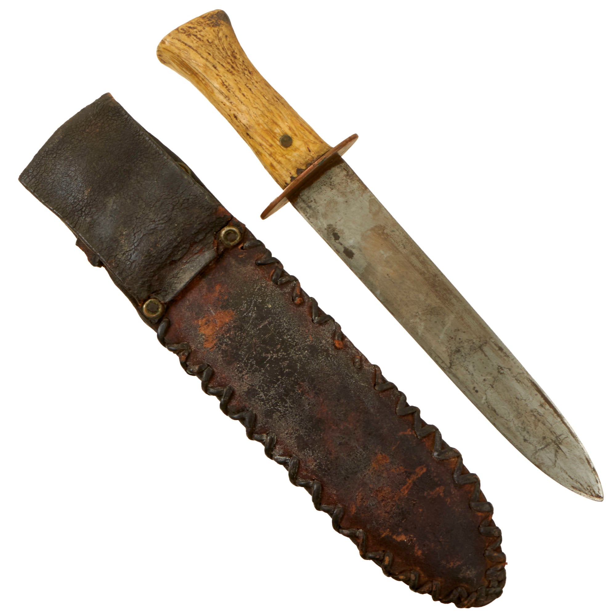The knife is a double-edged bolo style example with a custom ivory grip. The blade measures 9⅜” with an overall length of 13⅞”. The blade shows heavy use and sharpening, and is still extremely sharp on both sides.