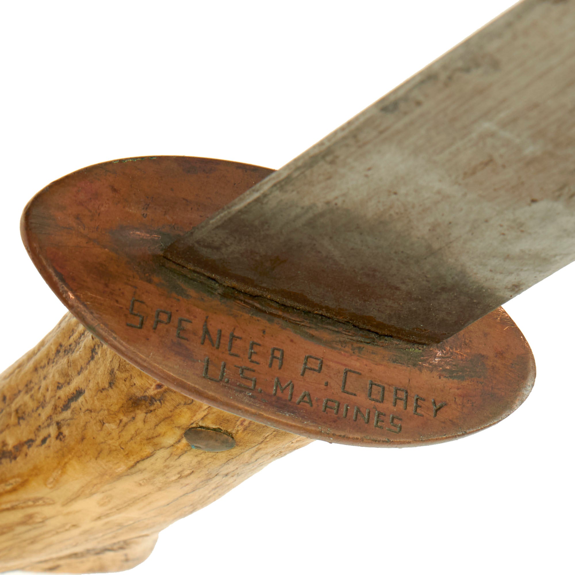 This very interesting theater-made knife was put together by a Marine who inscribed his name on the top of the crossguard:
