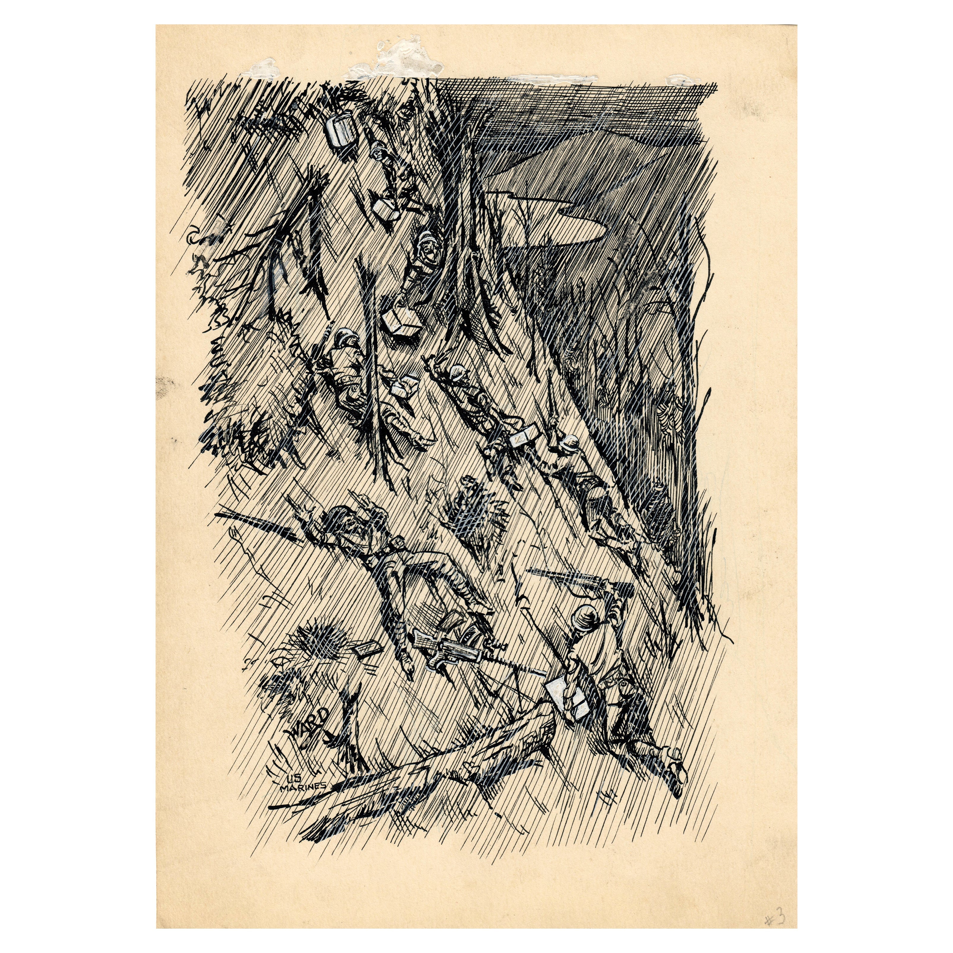 This piece of art was hand drawn by a U.S. Marine named simply as “Ward”. The image is in black and white with accents of blue rain falling. The image depicts US Marine attack uphill with dead, dying and wounded Japanese soldiers. The art measures 10" X 7 1/2".