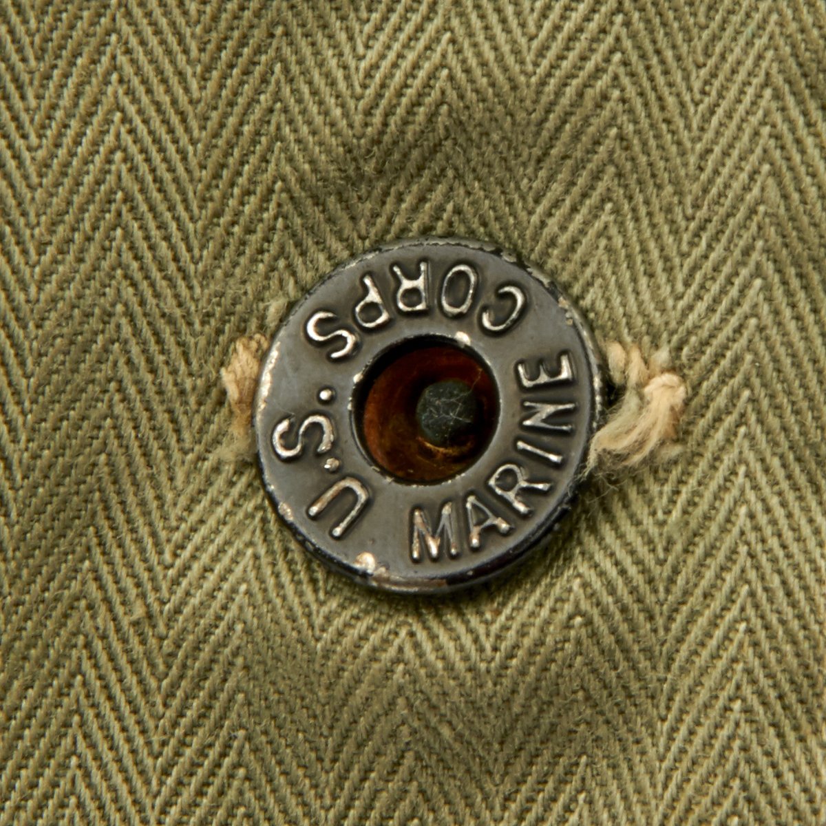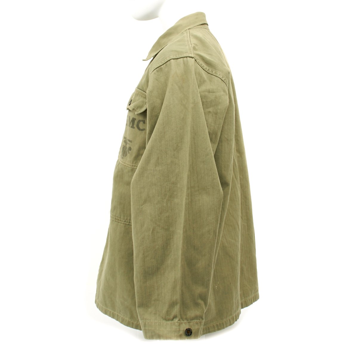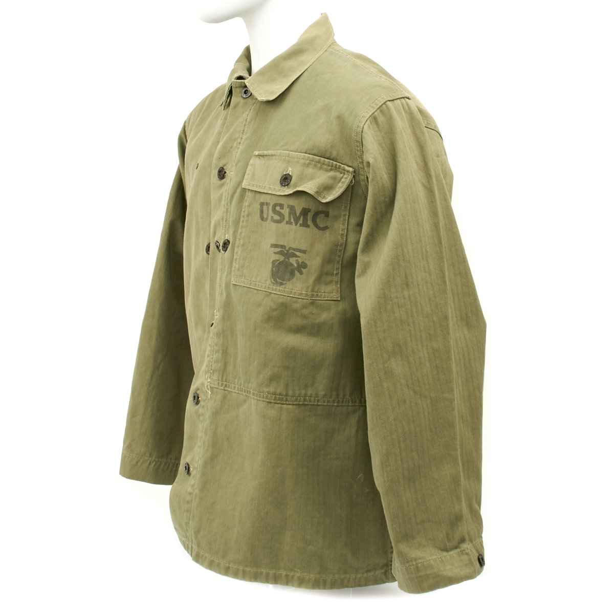 Original Item: Only One Available. Excellent, near unissued condition Size 40 WW2 USMC US Marine Corps P44 USMC Combat Field Utility Jacket in Olive Drab.This loose fitting sage green herringbone twill (HBT) cotton jacket features, original doughnut hole USMC buttons which are still black, breast pocket and stenciled black USMC EGA insignia. Offered in excellent condition.