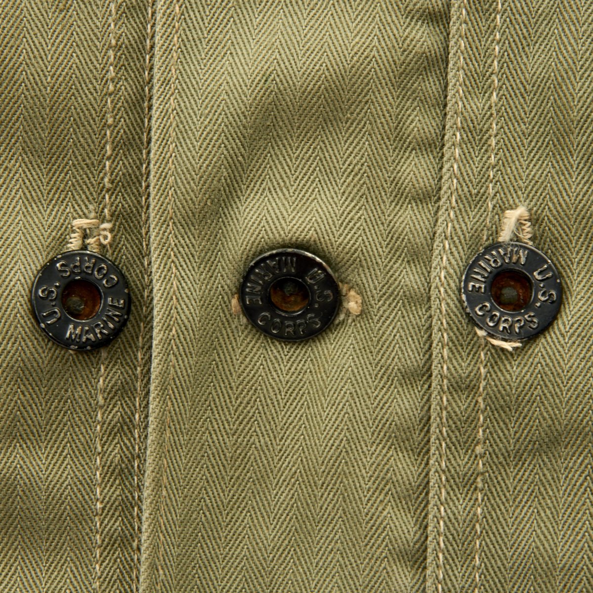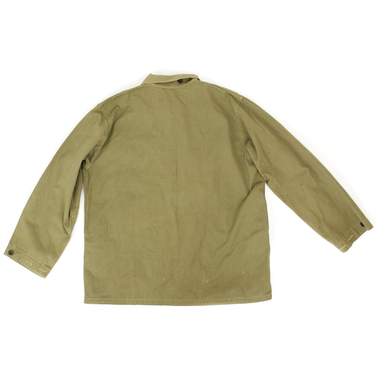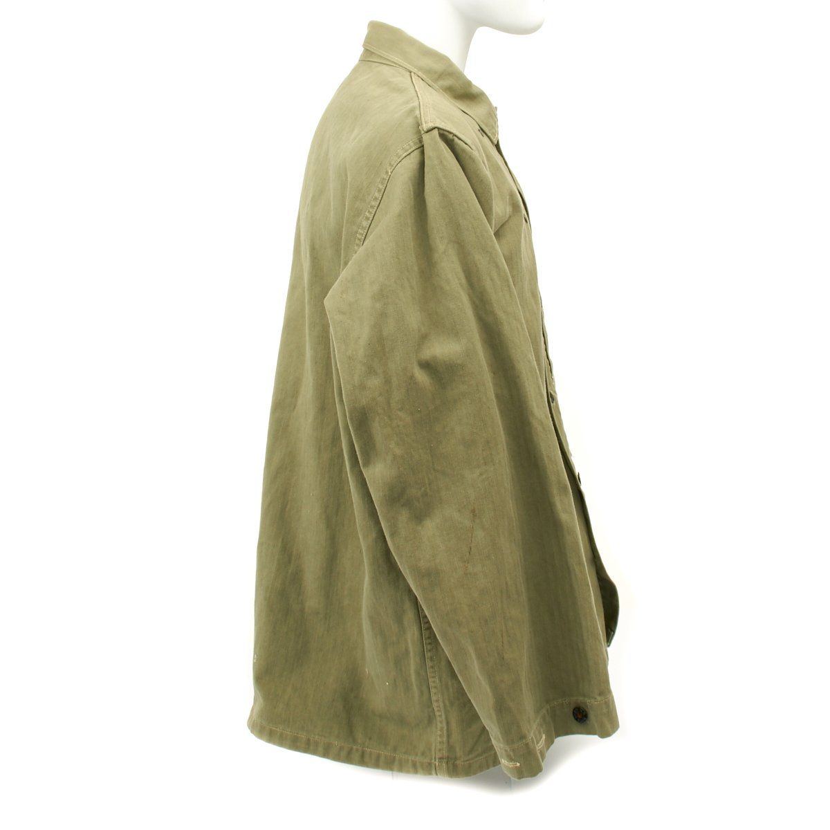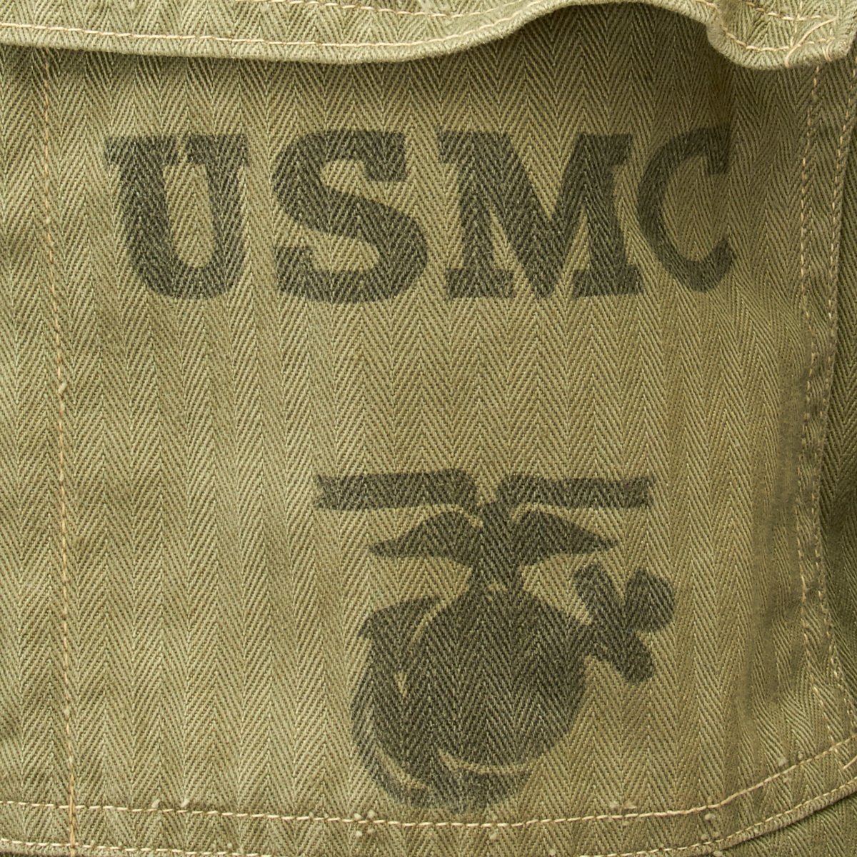 Original Item: Only One Available. Excellent, near unissued condition Size 40 WW2 USMC US Marine Corps P44 USMC Combat Field Utility Jacket in Olive Drab.This loose fitting sage green herringbone twill (HBT) cotton jacket features, original doughnut hole USMC buttons which are still black, breast pocket and stenciled black USMC EGA insignia. Offered in excellent condition.
