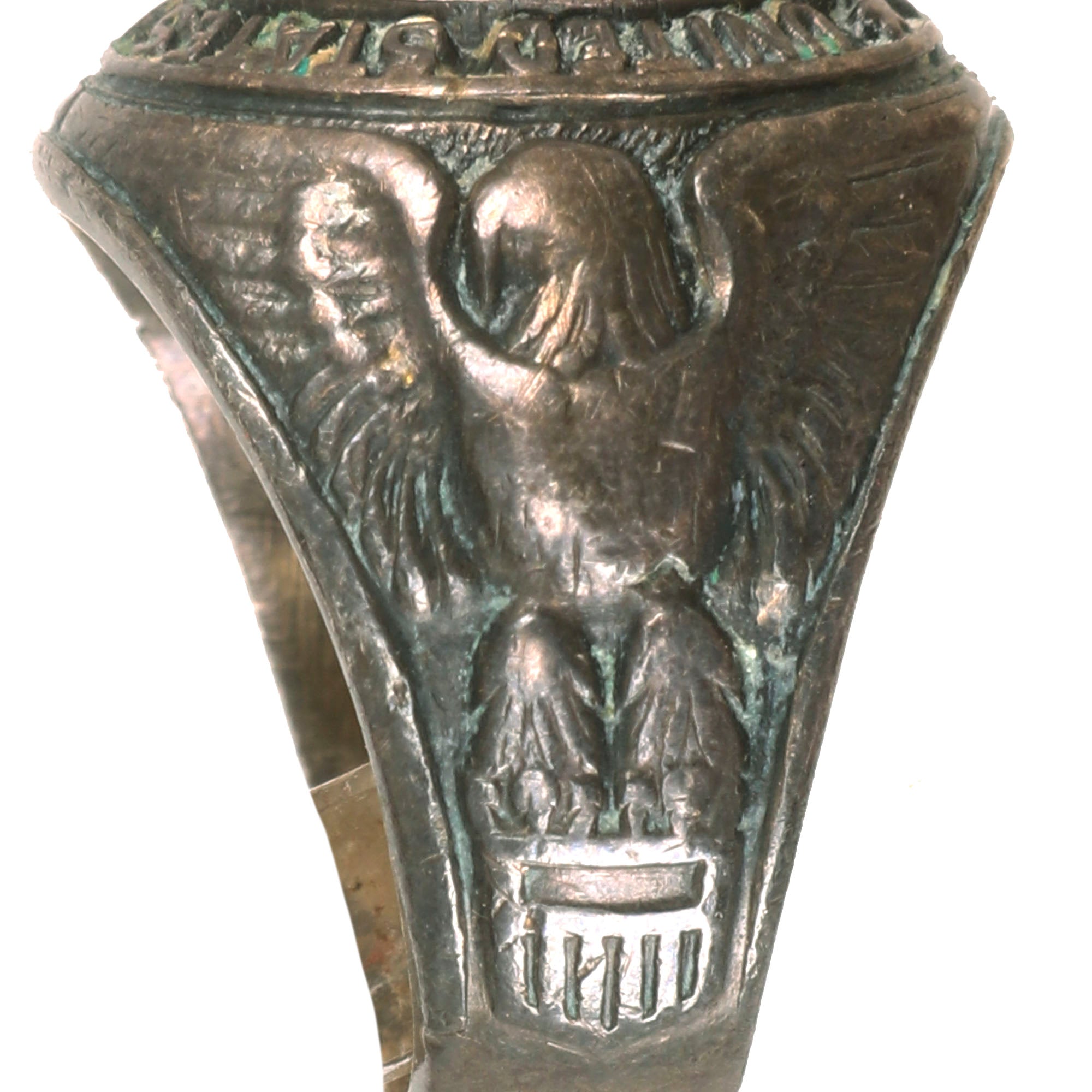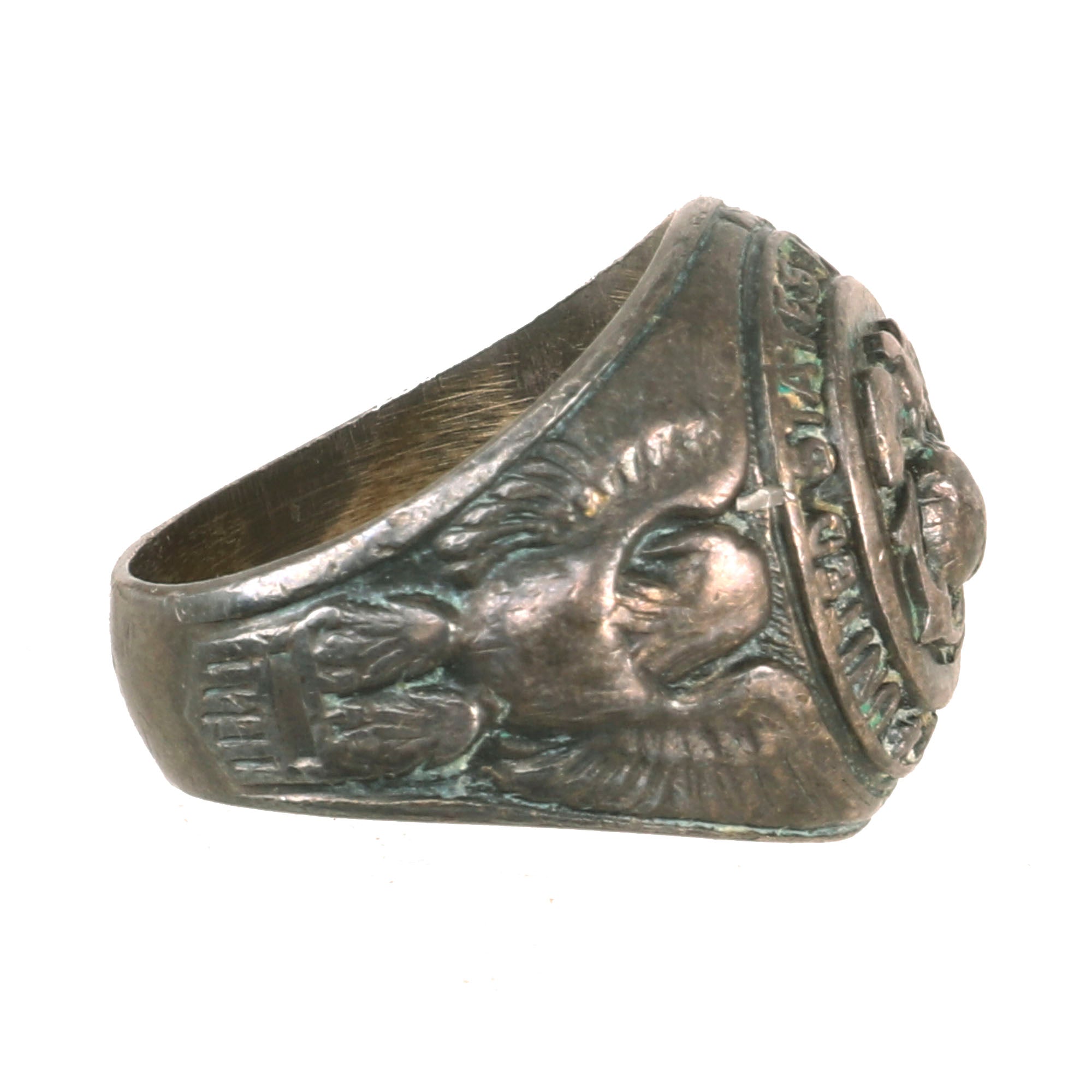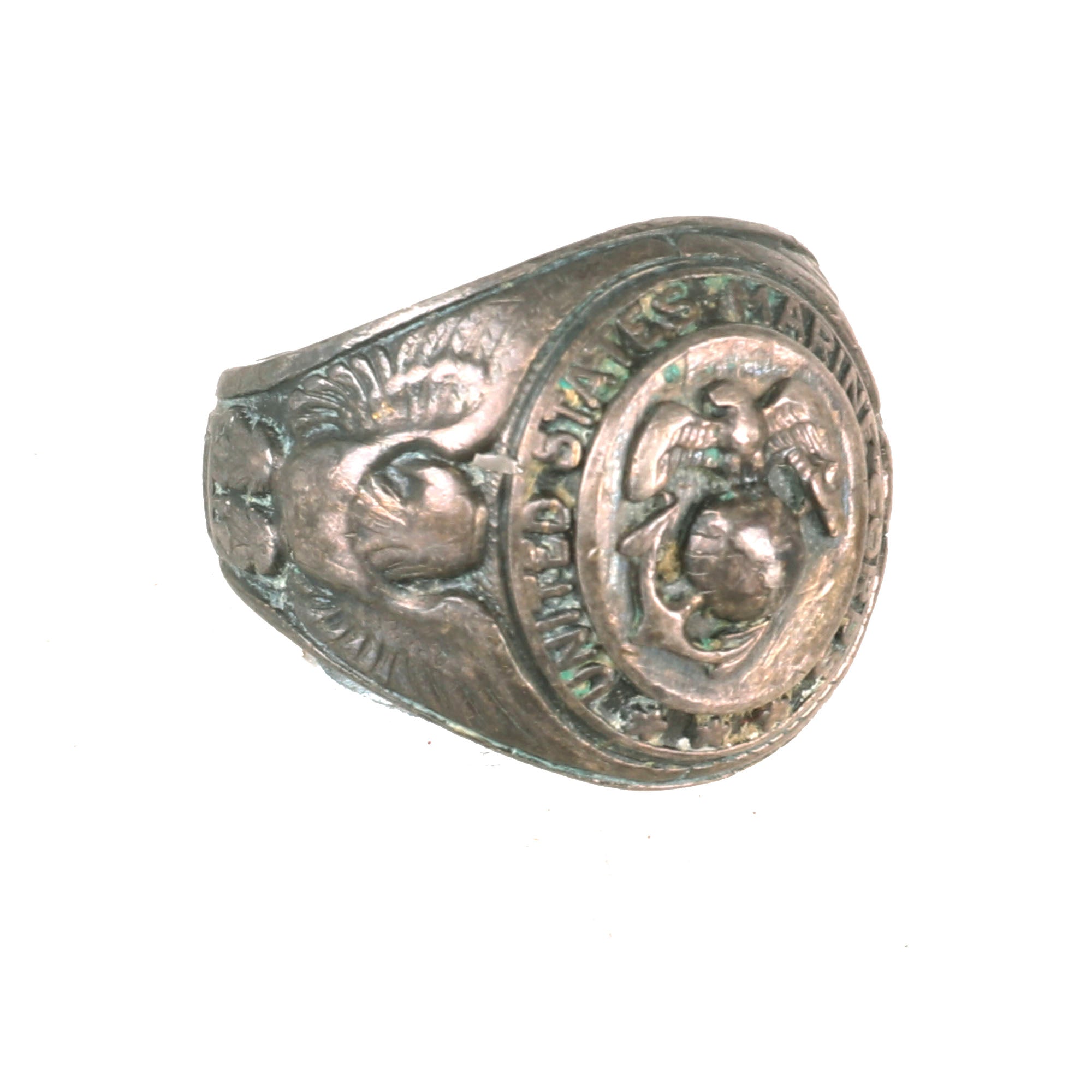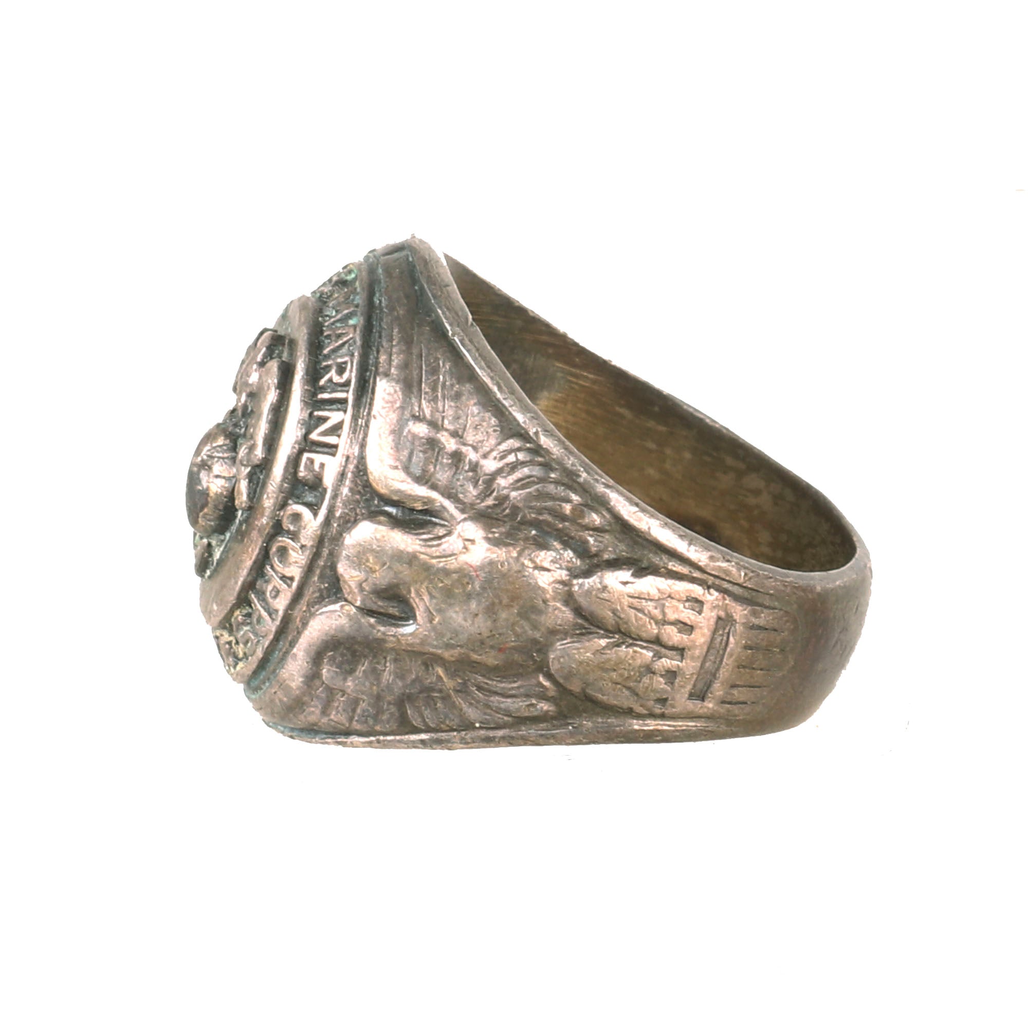 The ring is in excellent condition, despite some loss of finish and tarnishing. The images on the ring are still clear, but they show a smooth, worn appearance, indicating years of faithful wear. This ring was clearly cherished by the Marine who wore it, as it shows the signs of being worn regularly rather than being kept as a static display piece.