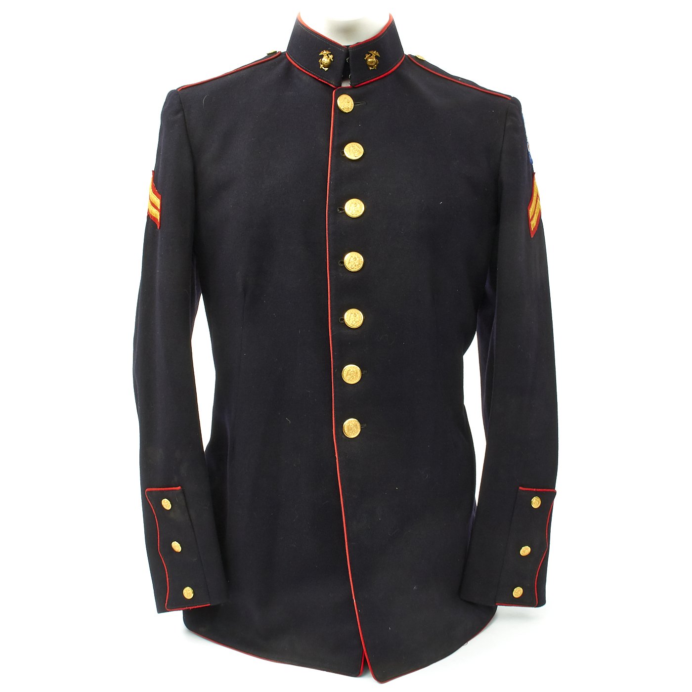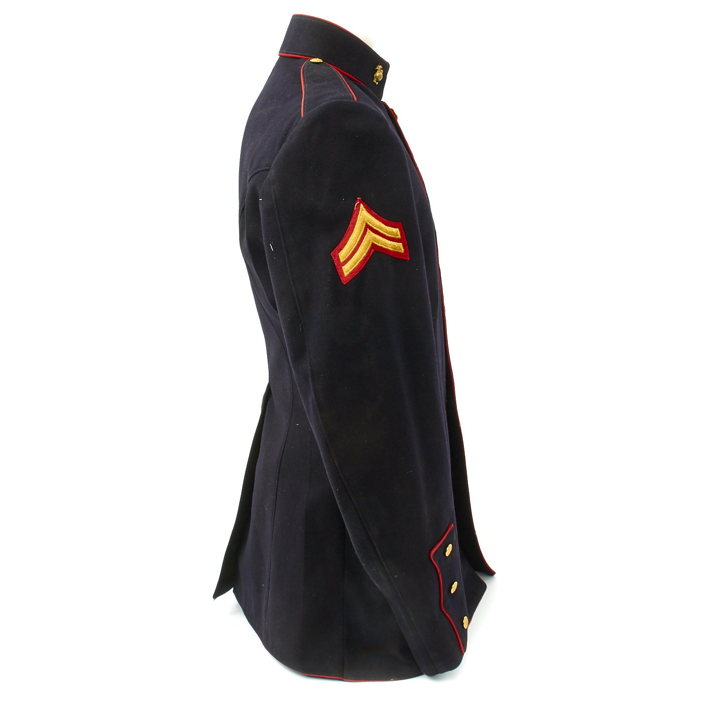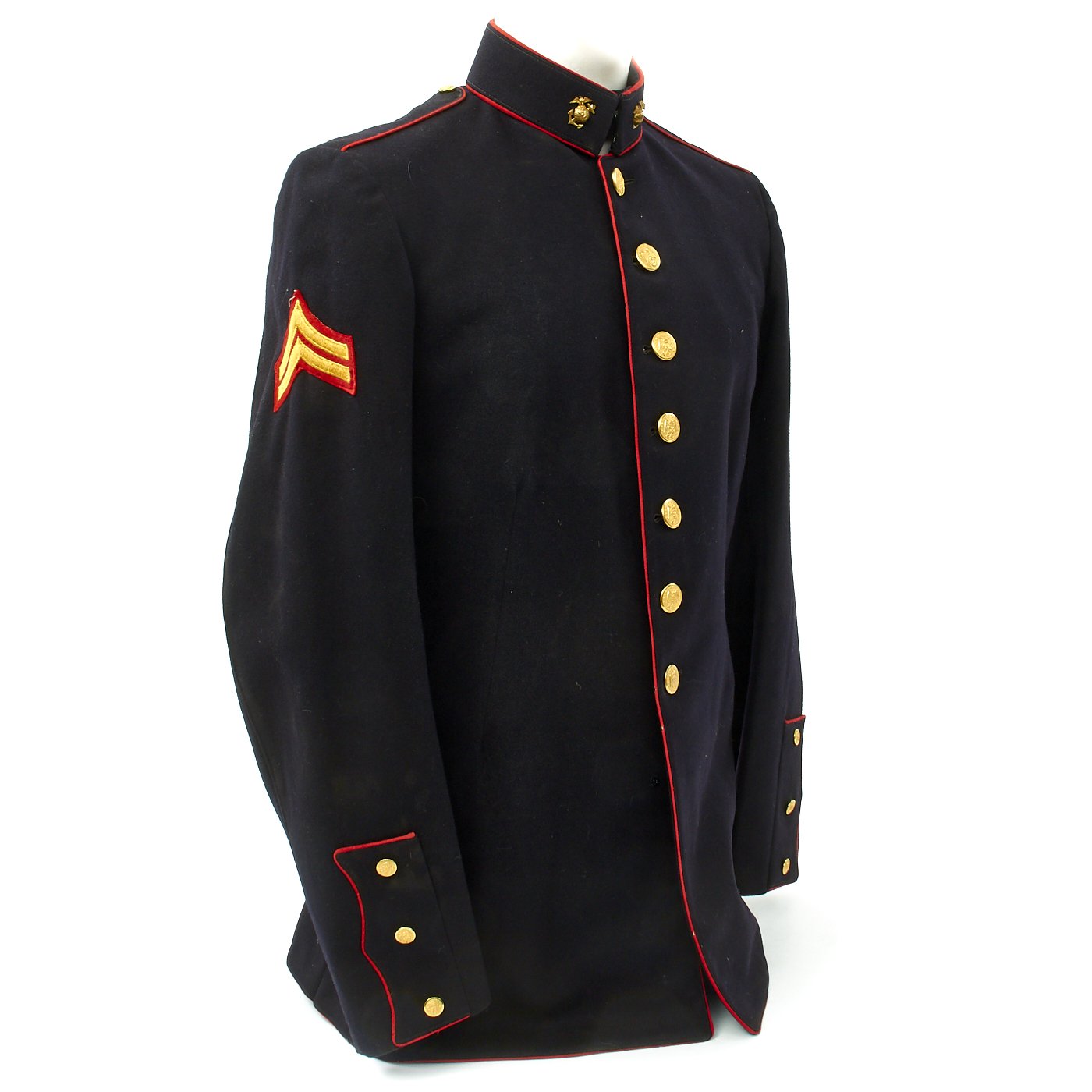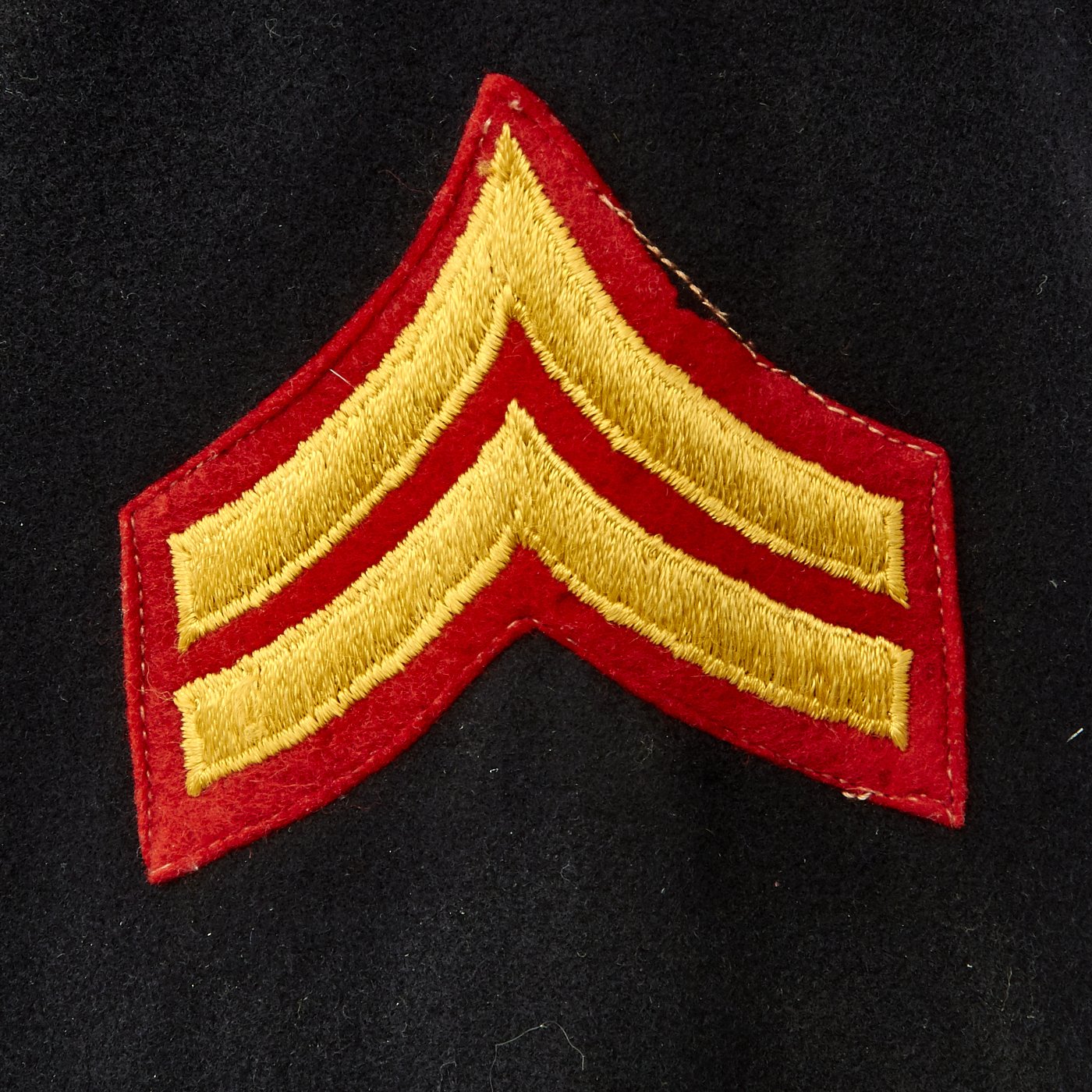 Original Item: Only One Available. This is a fantastic condition WWII USMC Dress Blues Uniform Tunic in approximate size US 40 with a rare Marine Raider patch. Corporal rank chevrons to both shoulders and brass EGA collar tabs and brass EGA buttons. Overall condition is excellent. Tunic is named in yellow embroidery to the interior E V SEYMOUR.