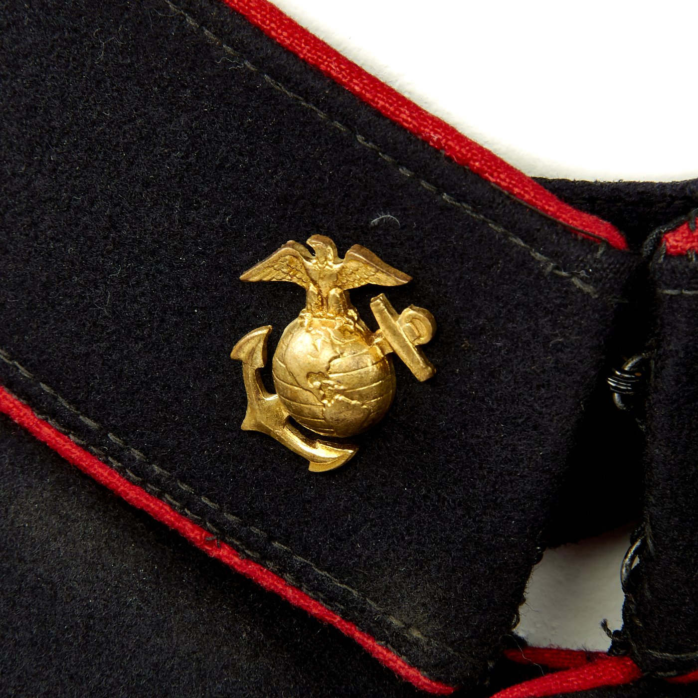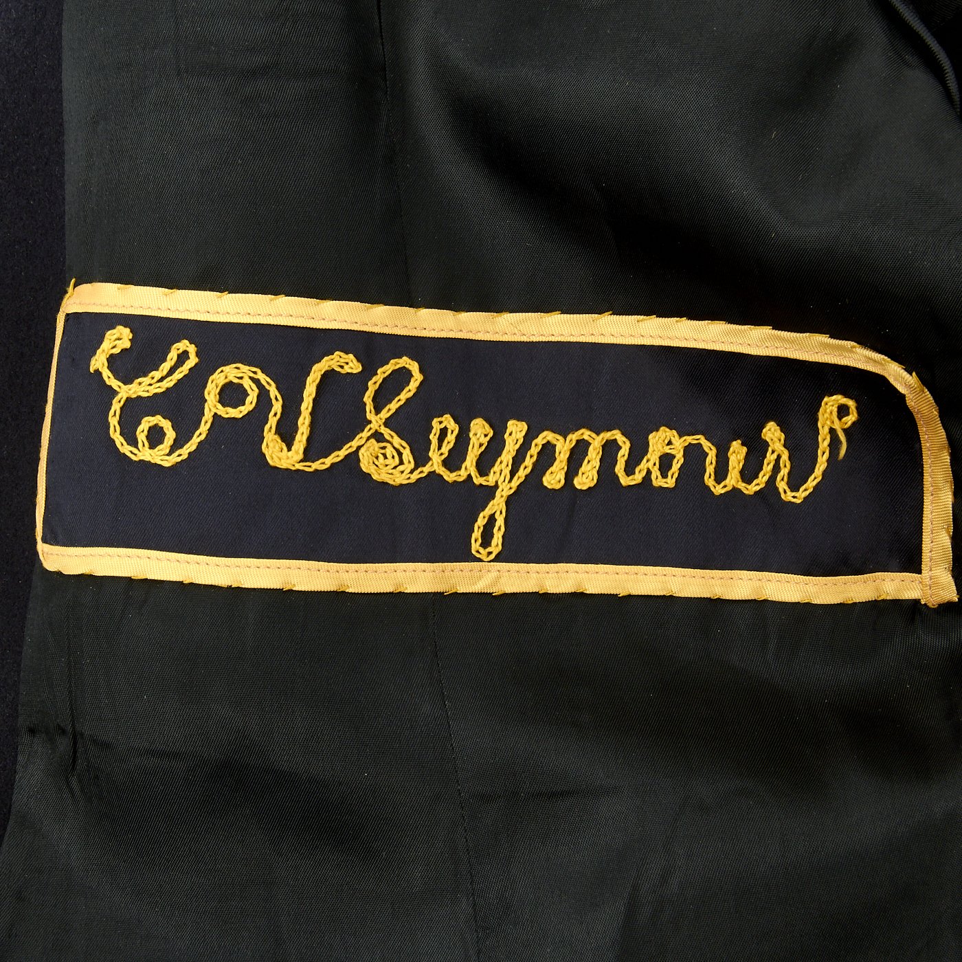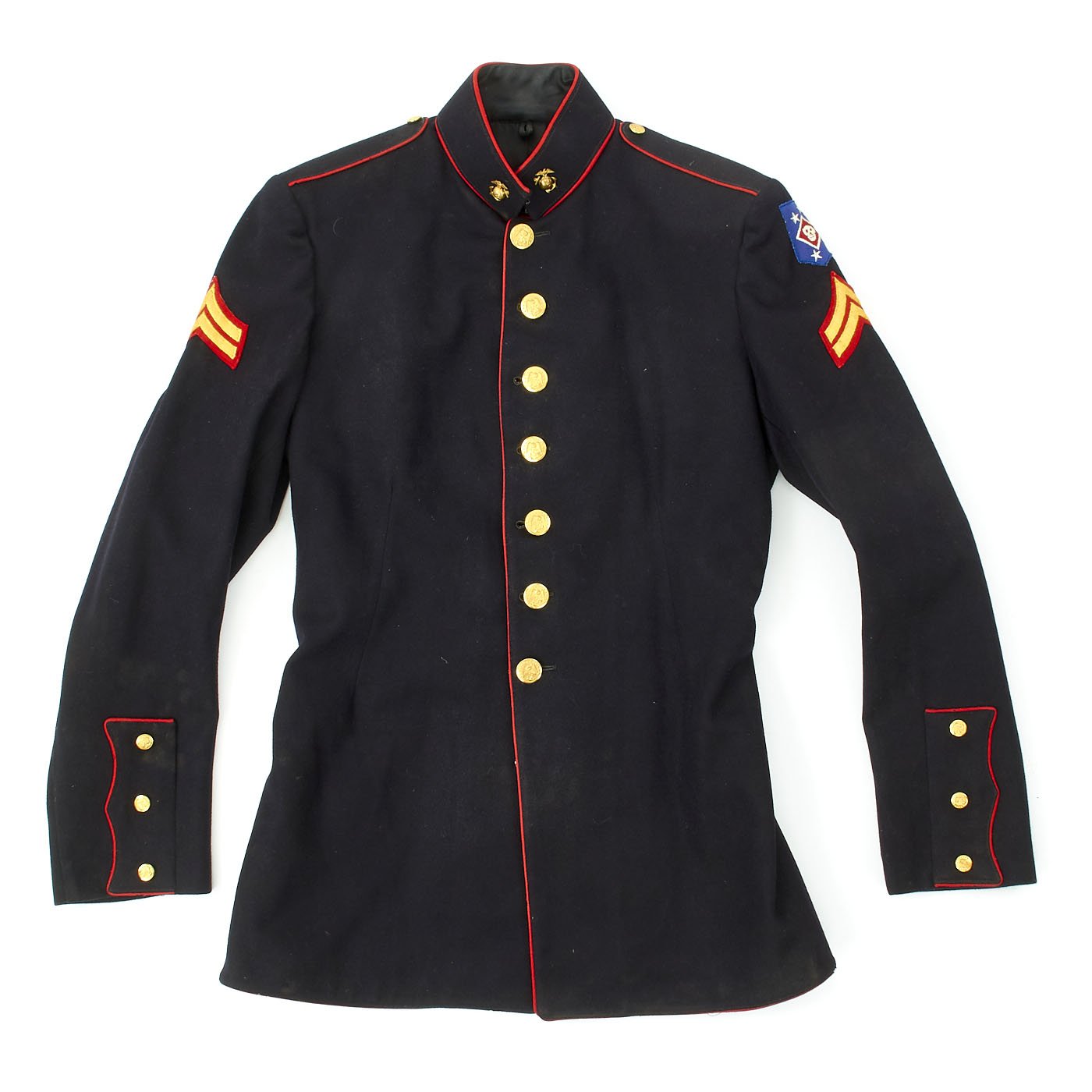 Original Item: Only One Available. This is a fantastic condition WWII USMC Dress Blues Uniform Tunic in approximate size US 40 with a rare Marine Raider patch. Corporal rank chevrons to both shoulders and brass EGA collar tabs and brass EGA buttons. Overall condition is excellent. Tunic is named in yellow embroidery to the interior E V SEYMOUR.