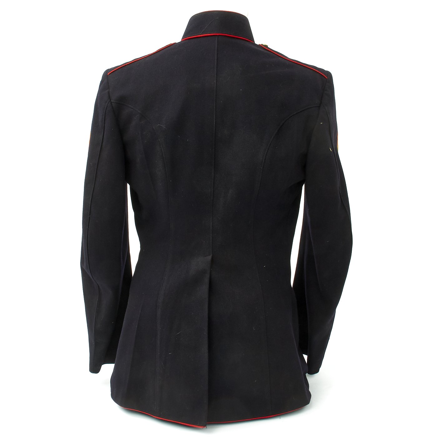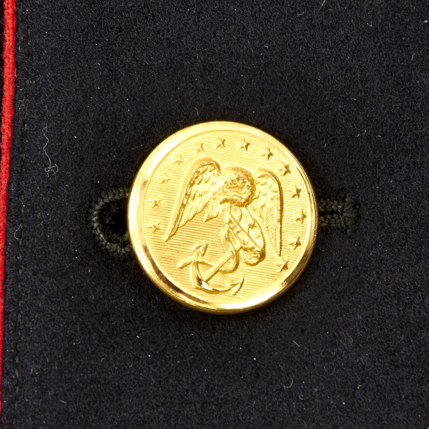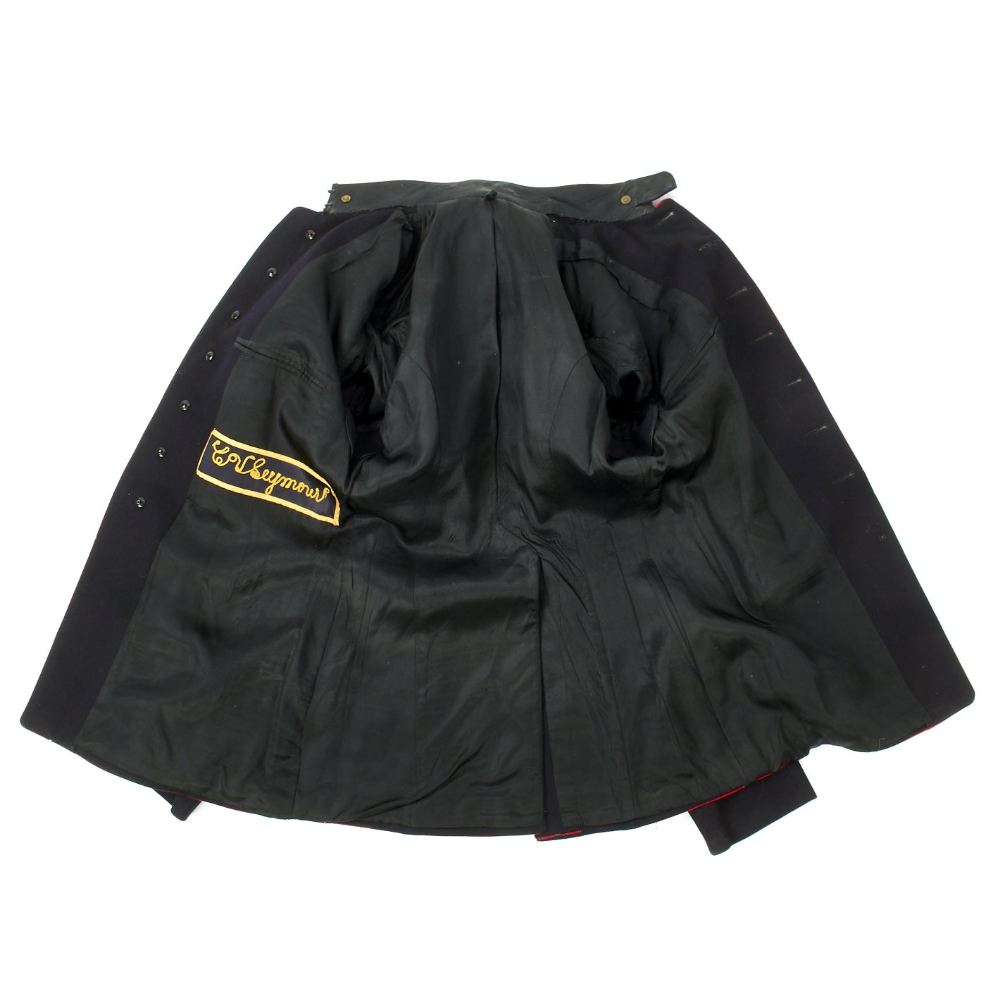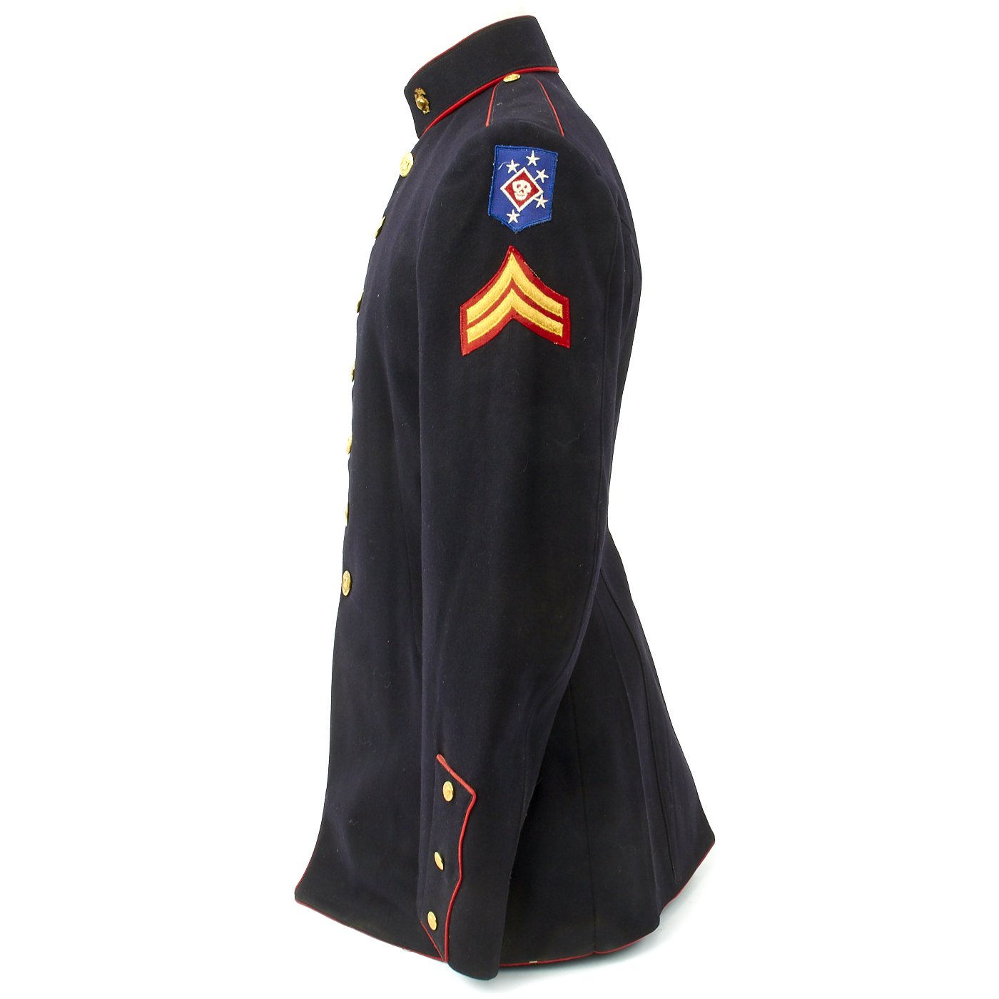 Original Item: Only One Available. This is a fantastic condition WWII USMC Dress Blues Uniform Tunic in approximate size US 40 with a rare Marine Raider patch. Corporal rank chevrons to both shoulders and brass EGA collar tabs and brass EGA buttons. Overall condition is excellent. Tunic is named in yellow embroidery to the interior E V SEYMOUR.