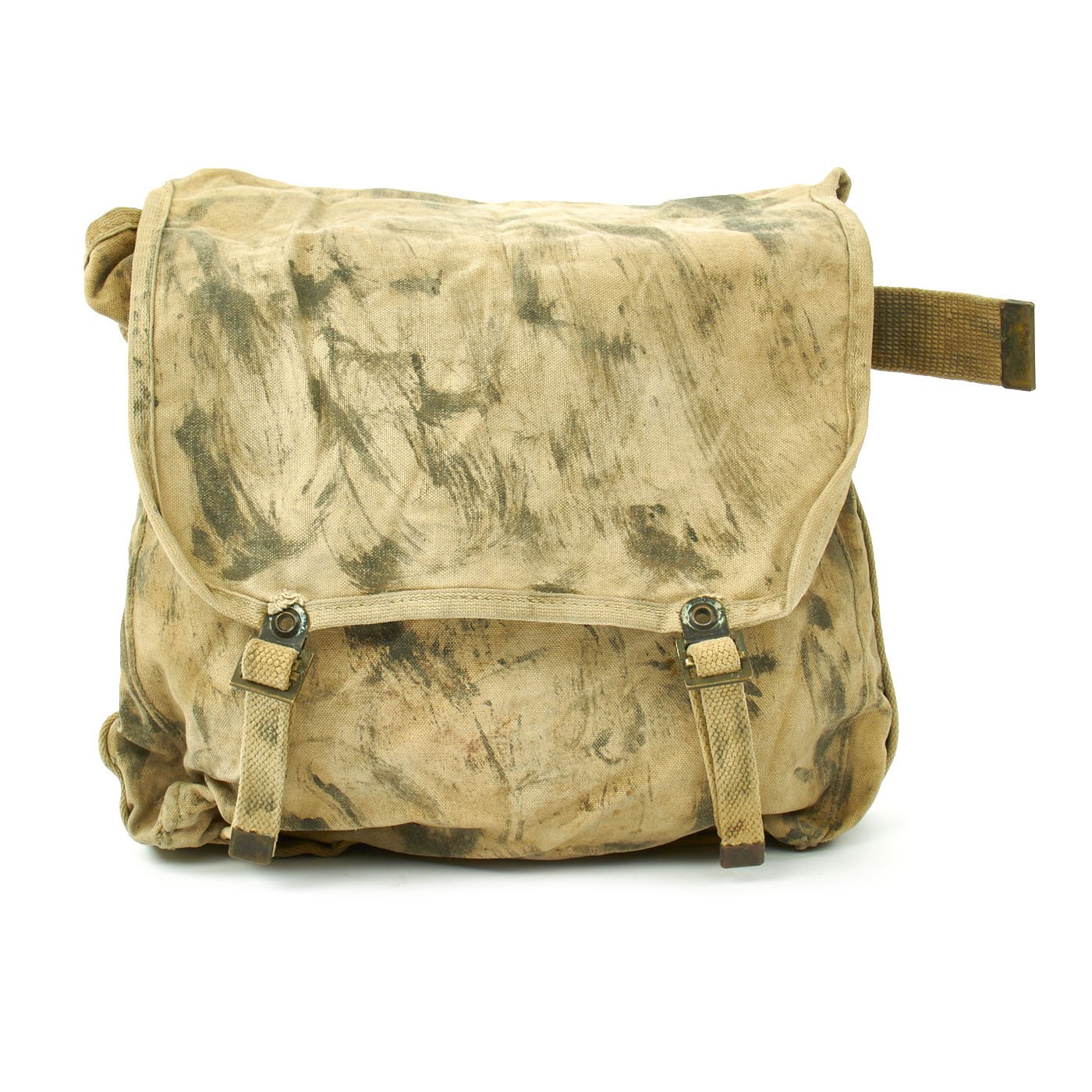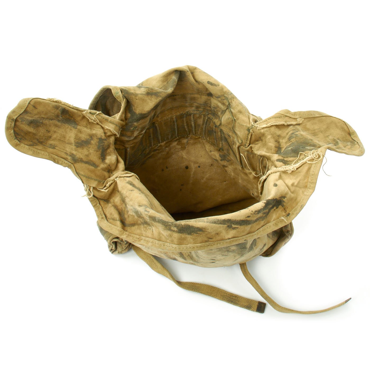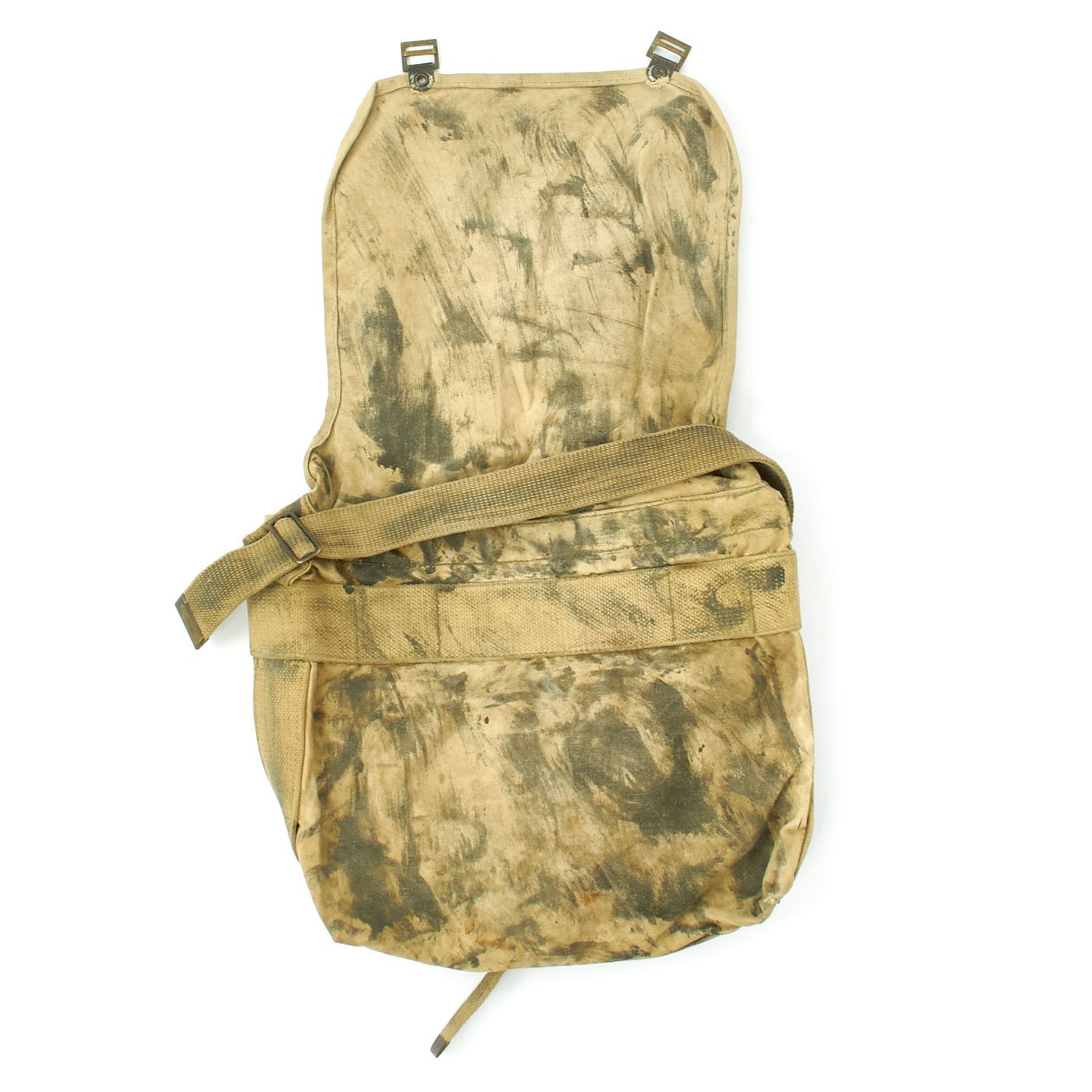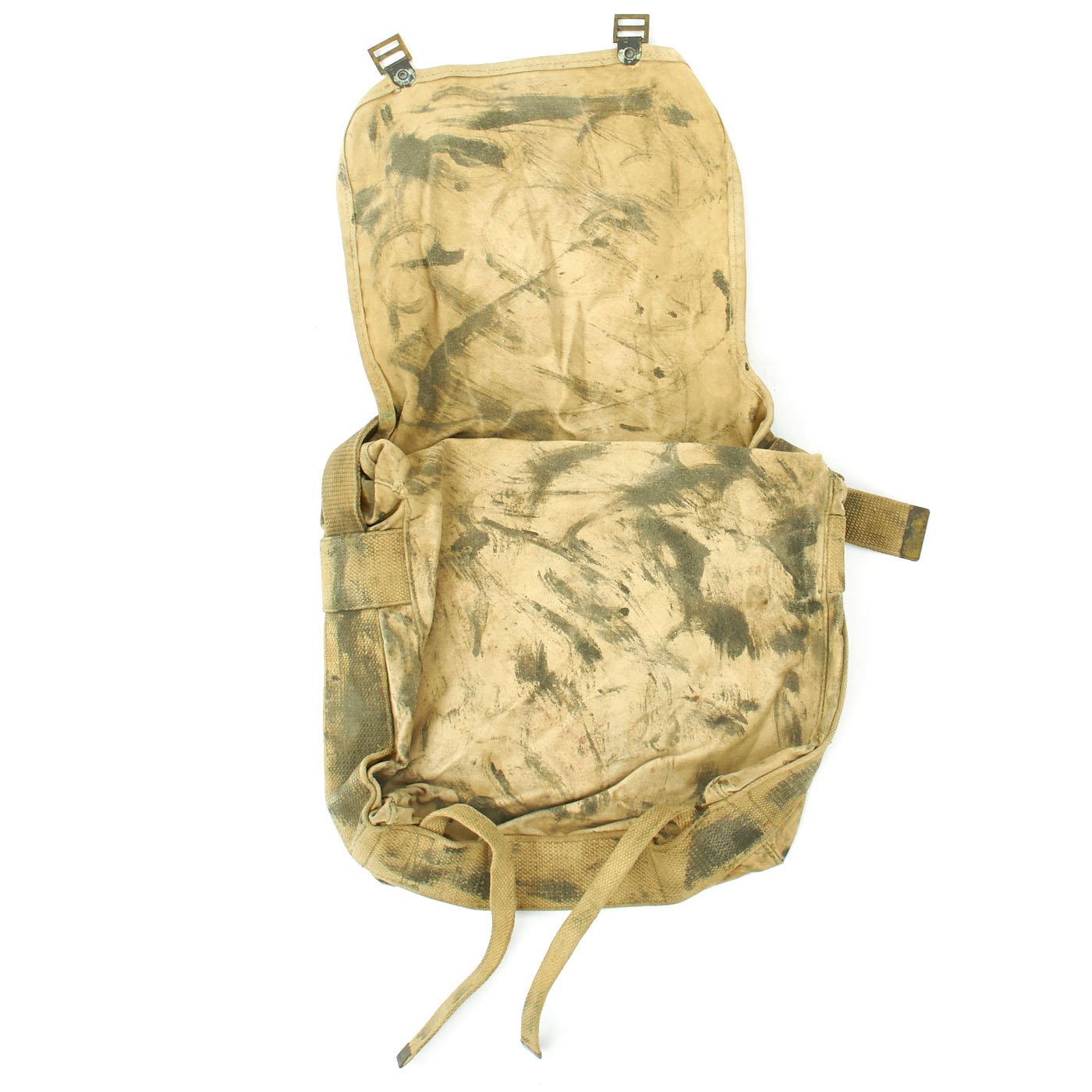 Original Item: One-of-a-kind. This is an original U.S. Marine Corps (U.S.M.C.) lower pack for the M1941 pack system. This is the lower knapsack that would strap to the upper haversack. The lower pack is made of khaki canvas, has brass buckles and strap tips. It has the "ears" that fold inward to secure the contents, has a large flap on front that secures with two straps. A khaki web strap extends across the top, which was used for threading through the brass buckles at the bottom of the haversack, to secure the lower pack to the upper. All parts present and in good shape. The pack is in very good to excellent condition. Shows a fading and some light spots and soiling, but completely intact with all straps, buckles, flaps, and hardware. No loose stitching, no tears. The most interesting aspect is the hand painted brushed camouflage paint on the exterior which is indicative of use by a Marine Raider.