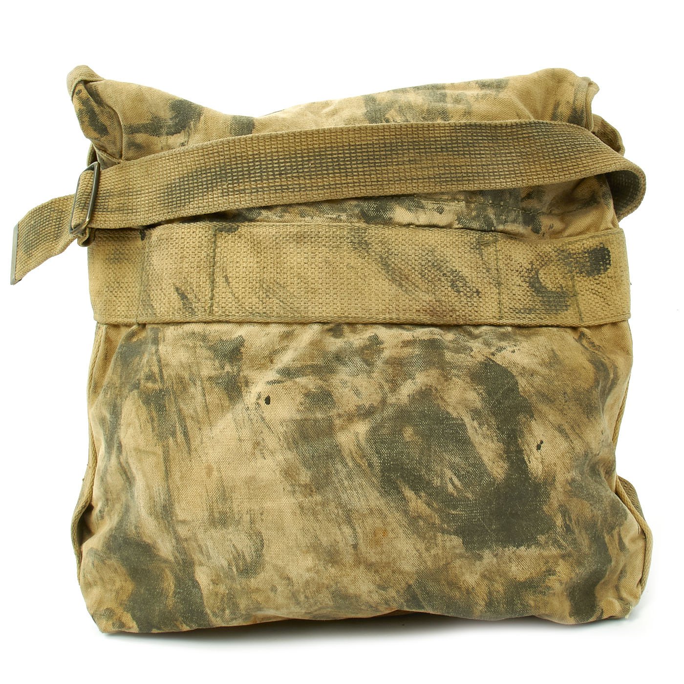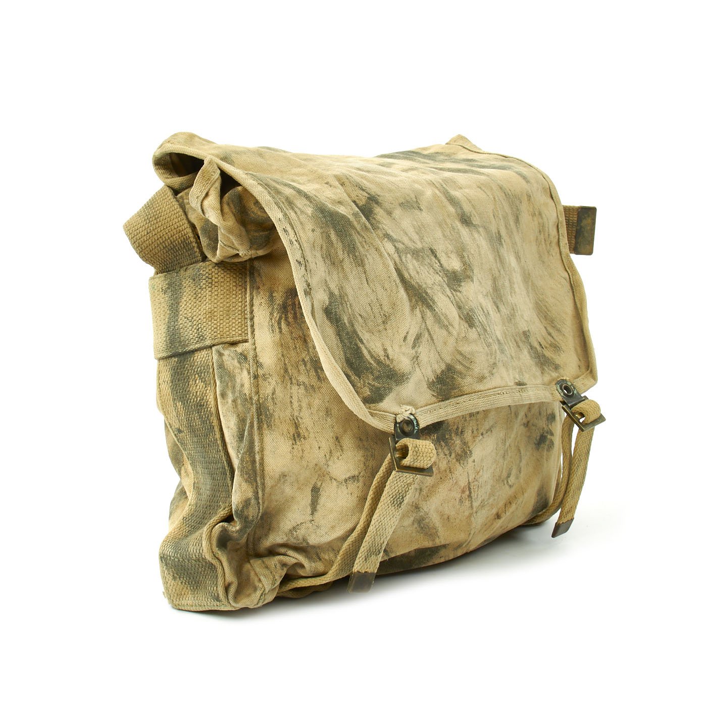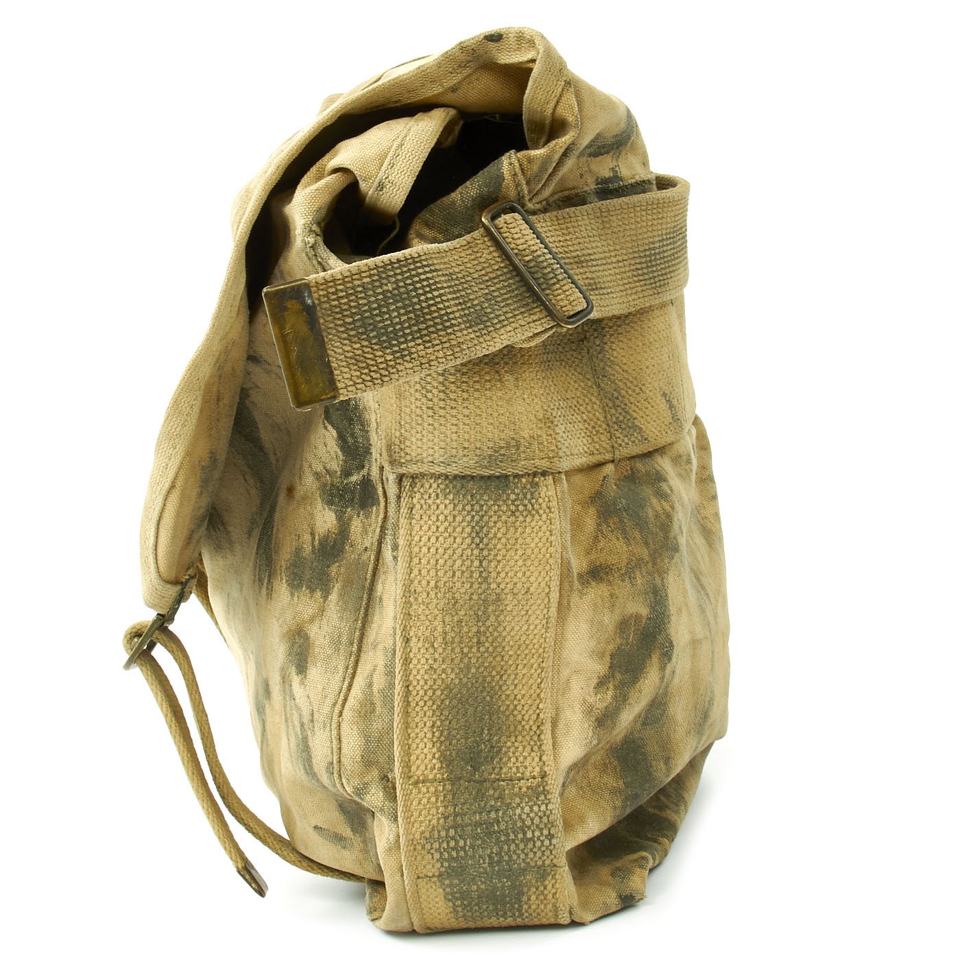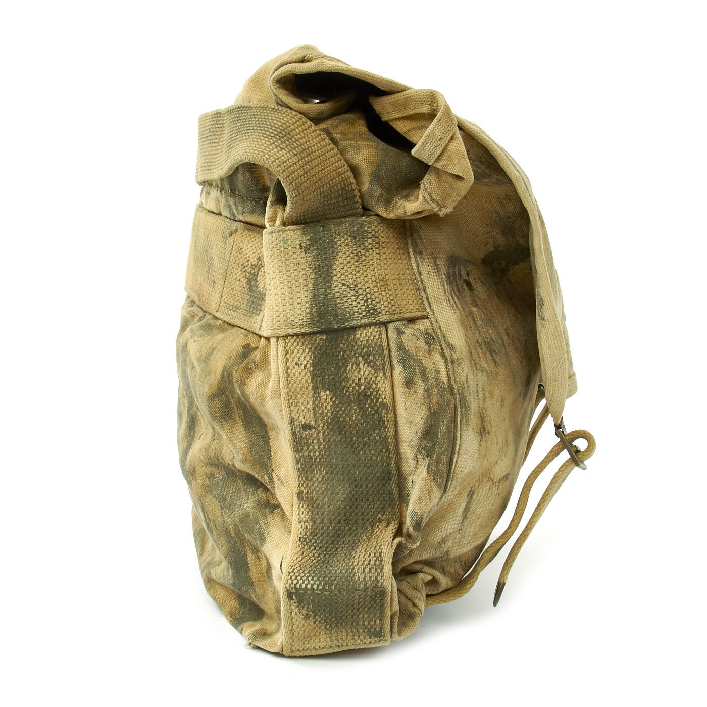 Original Item: One-of-a-kind. This is an original U.S. Marine Corps (U.S.M.C.) lower pack for the M1941 pack system. This is the lower knapsack that would strap to the upper haversack. The lower pack is made of khaki canvas, has brass buckles and strap tips. It has the "ears" that fold inward to secure the contents, has a large flap on front that secures with two straps. A khaki web strap extends across the top, which was used for threading through the brass buckles at the bottom of the haversack, to secure the lower pack to the upper. All parts present and in good shape. The pack is in very good to excellent condition. Shows a fading and some light spots and soiling, but completely intact with all straps, buckles, flaps, and hardware. No loose stitching, no tears. The most interesting aspect is the hand painted brushed camouflage paint on the exterior which is indicative of use by a Marine Raider.