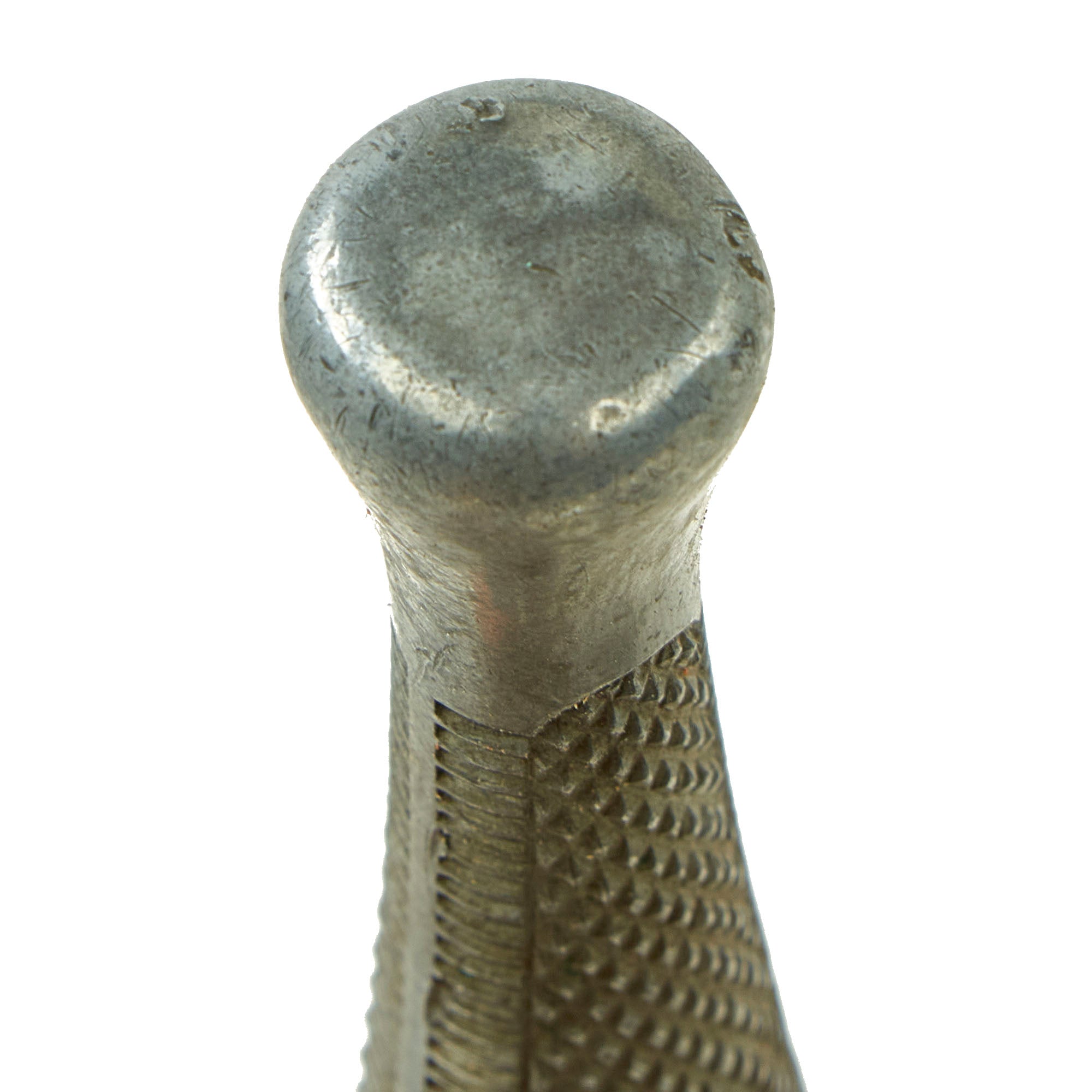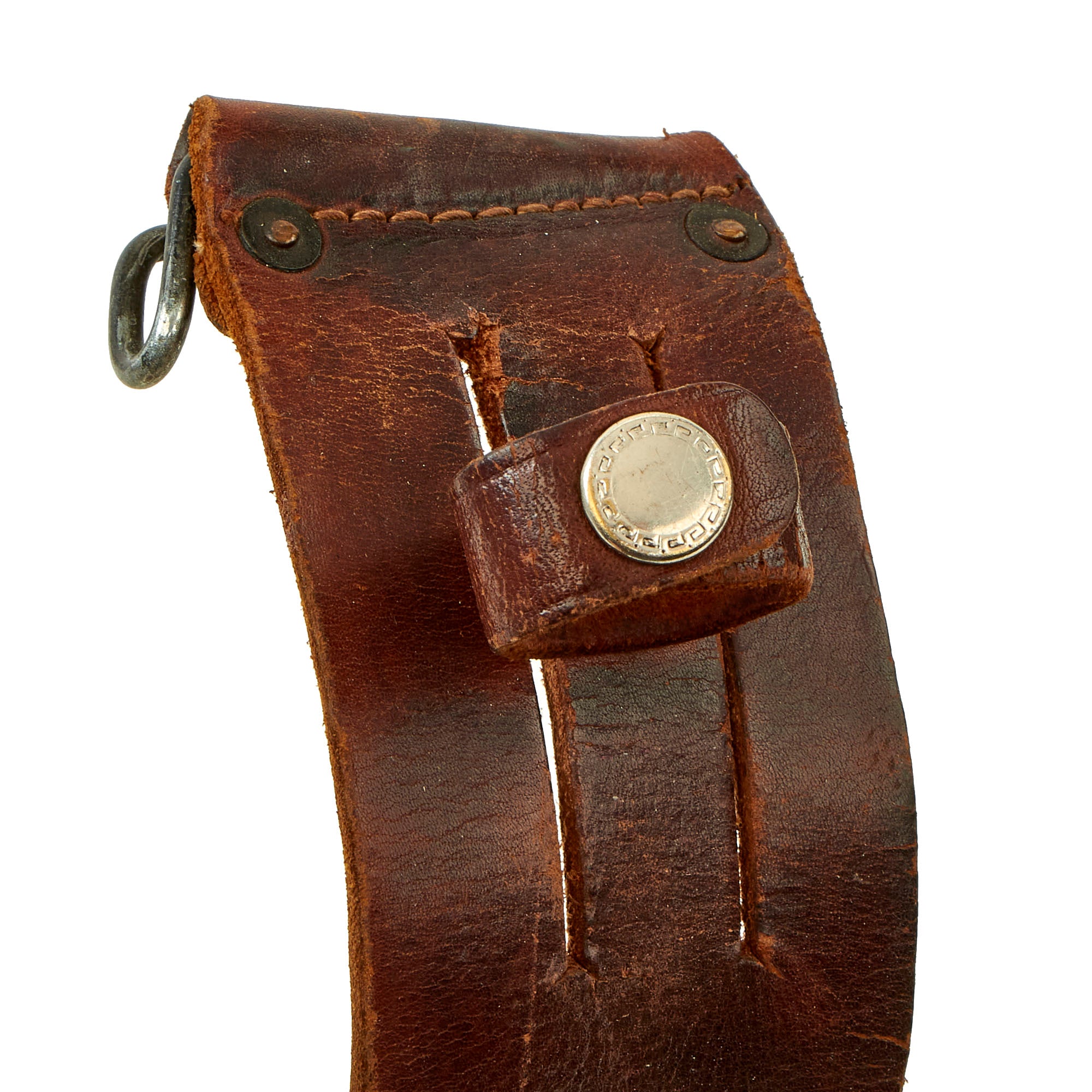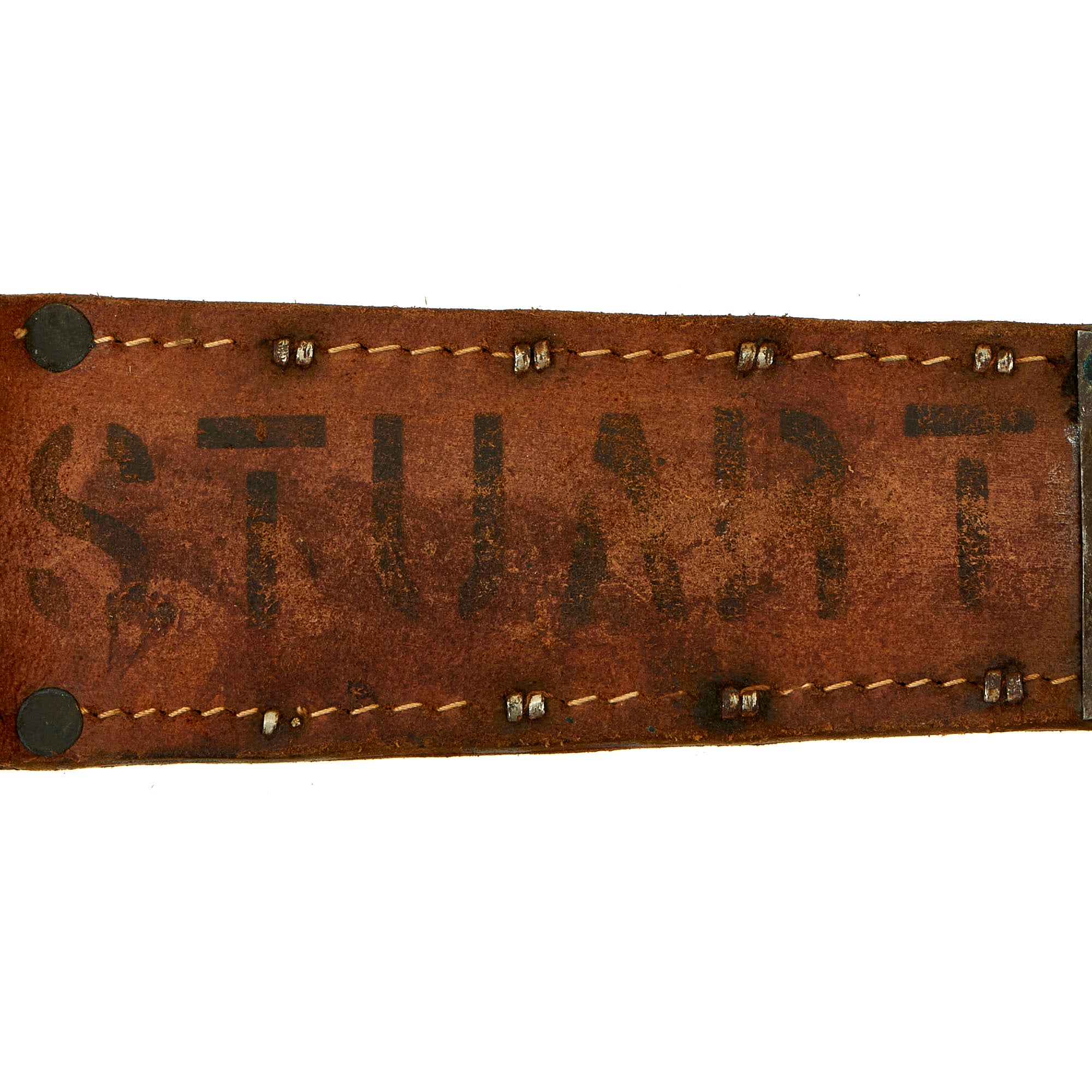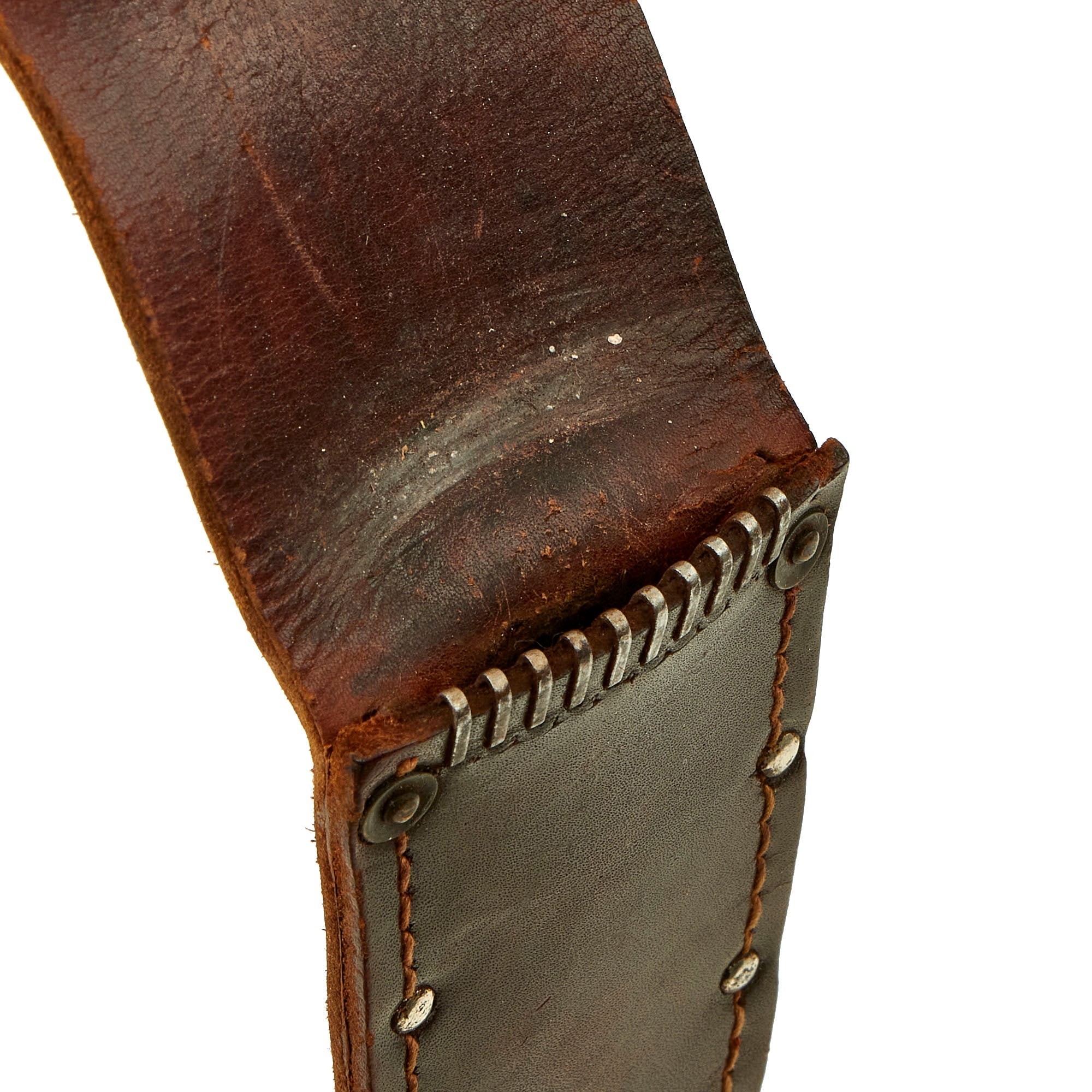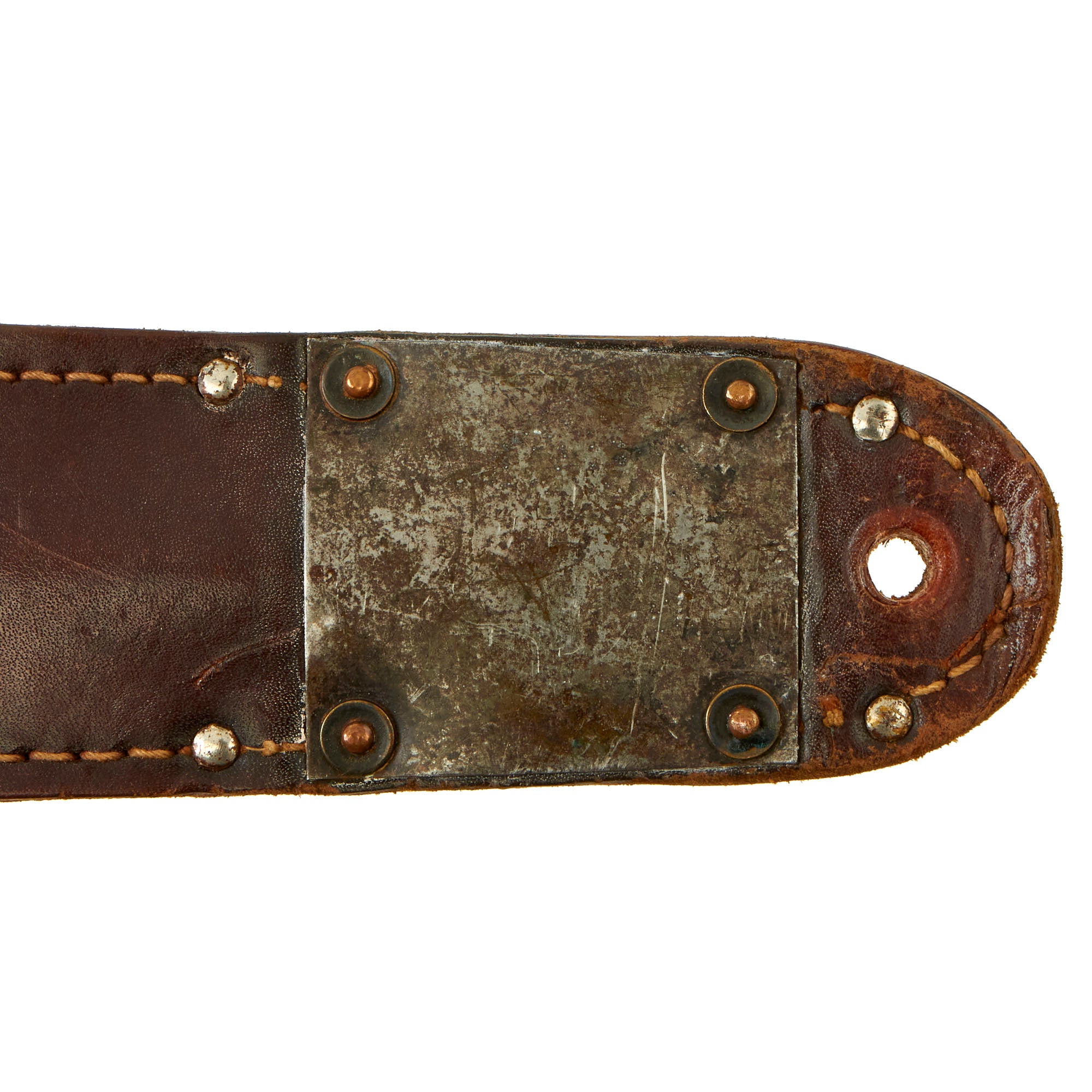The zinc handle has been very well preserved, and shows very little wear or degradation. The checkering is still fully present. The blade measures about 6 ¼” with an overall length of 11 ¼”. These knives were issued to both Marine Raiders and Paramarines. Leather scabbard is in good complete condition, has a functional snap on the retainer loop with all rivets and staples.