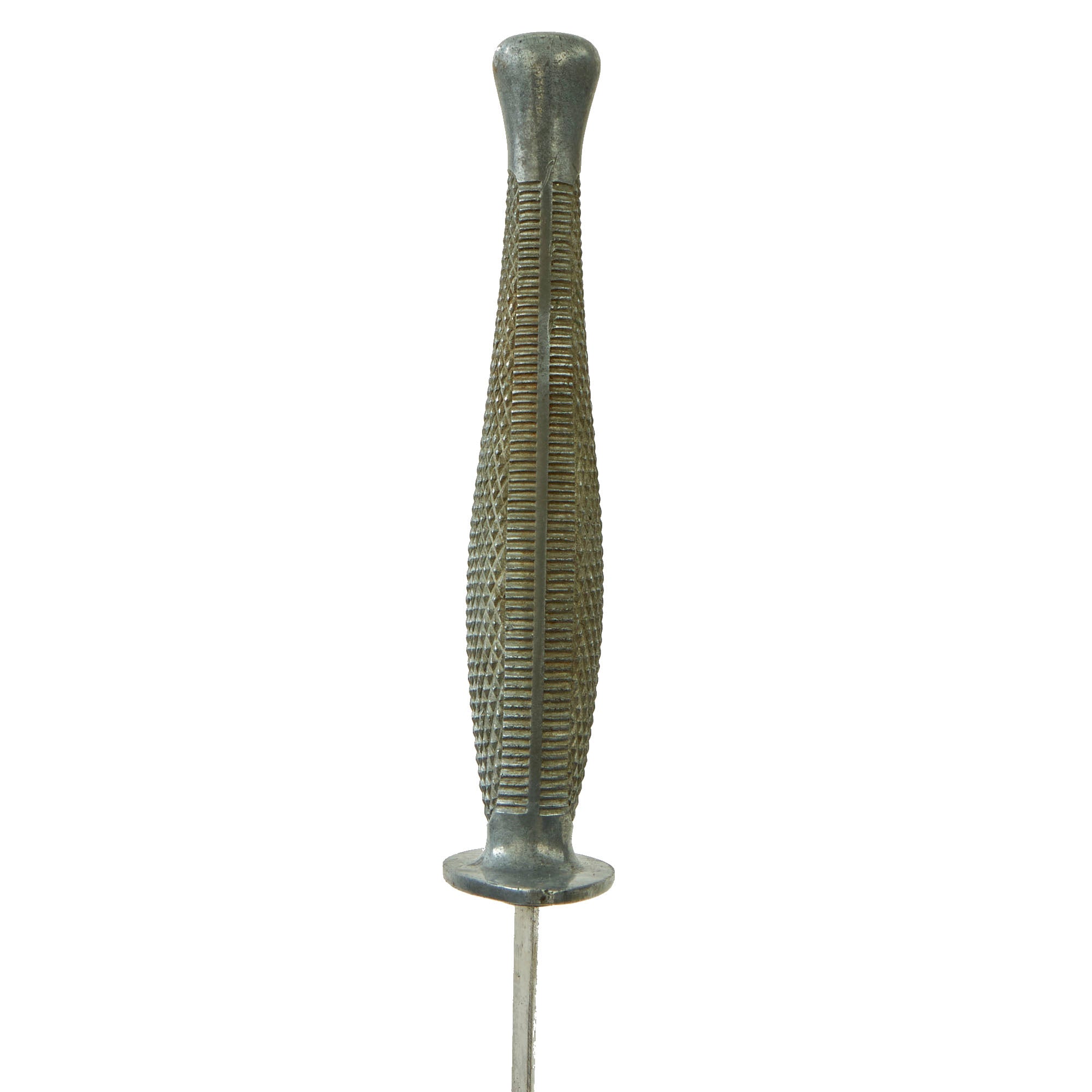 The purpose of the row of staples at the throat was to prevent the sharp knife from slashing through the sheath. Unfortunately, these staples could severely scar the stiletto blade. It is believed that these sheath variants evolved by trial and error, as the late issues had both staples and plates.