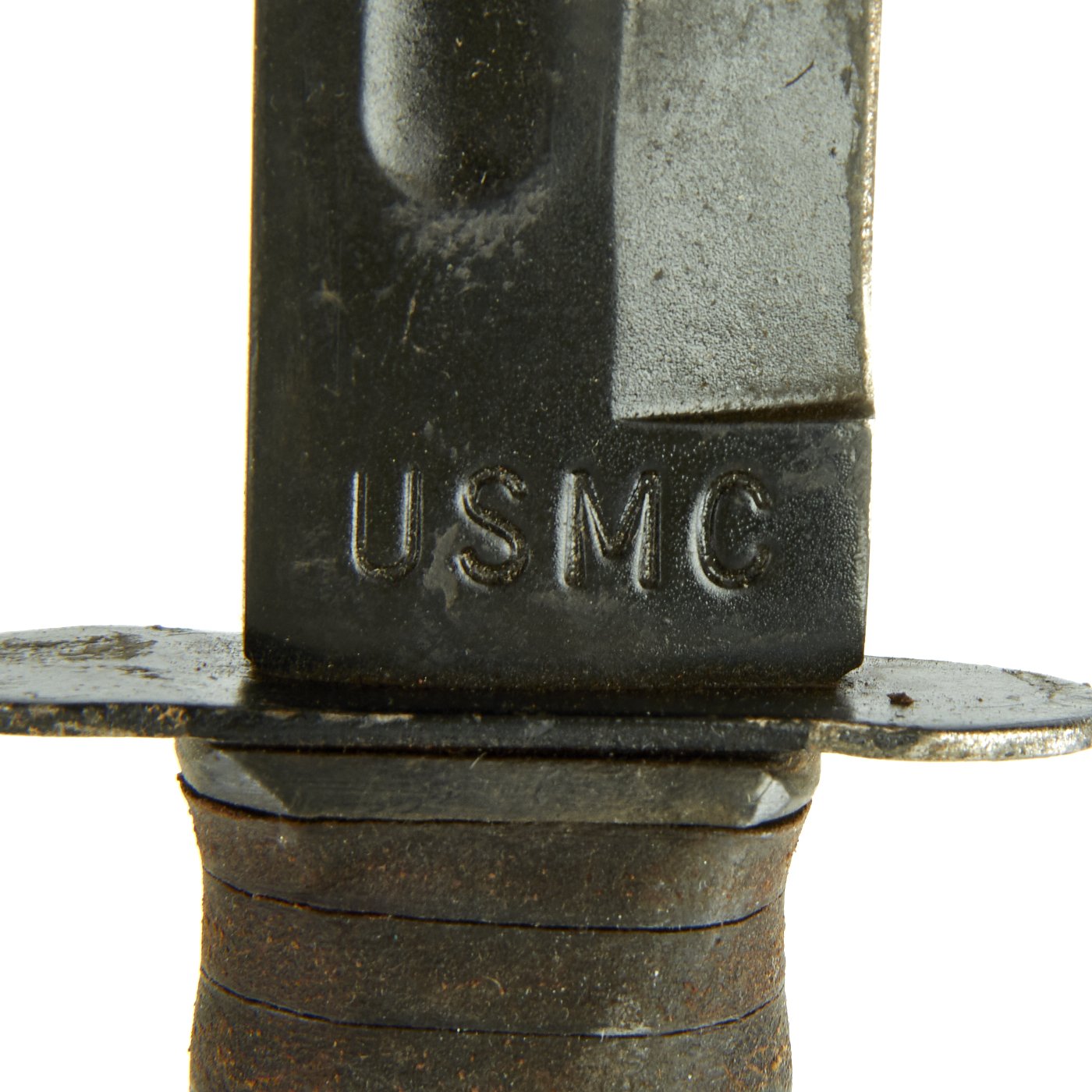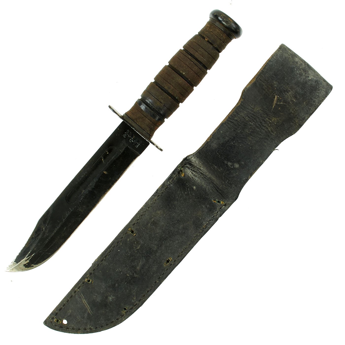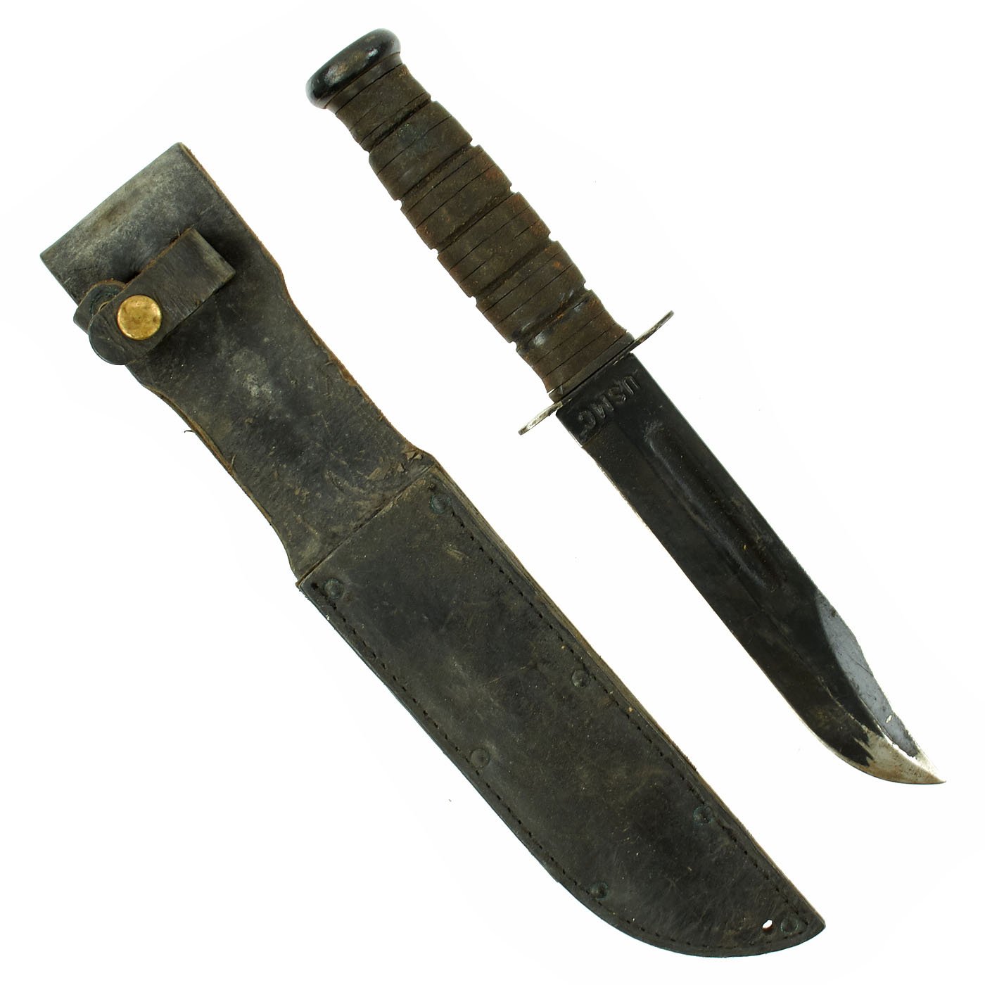 Original Item: This is a nice service used example of the legendary U.S.M.C marked Mark 2 "Ka-Bar" fighting knife by Union Cutlery with a leather belt sheath. Marine Corps issue knives are much harder to find on the market than the U.S.N. marked variety. Overall length of this Mark 2 knife is 11 7/8 inches, with a 6 7/8 inch clip-point blade. This early production example is marked on the blade ricasso with USMC, while the reverse ricasso is marked: