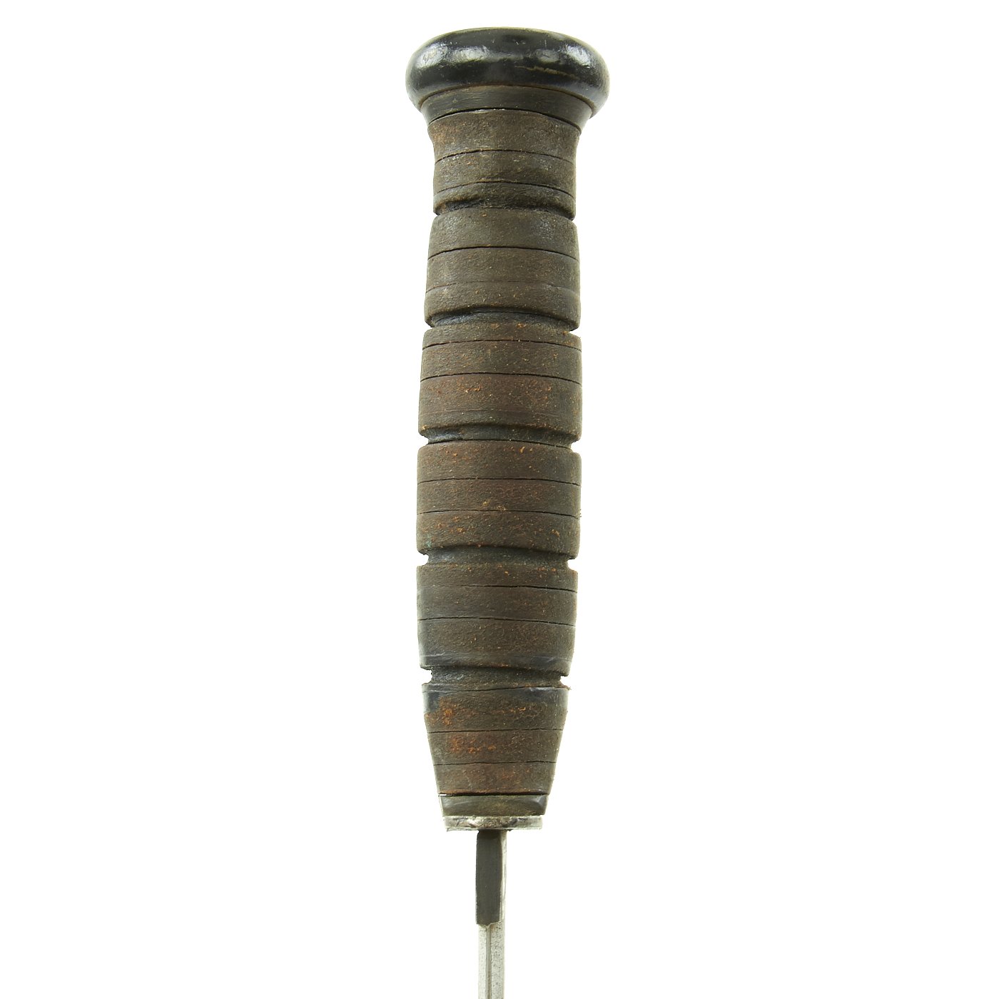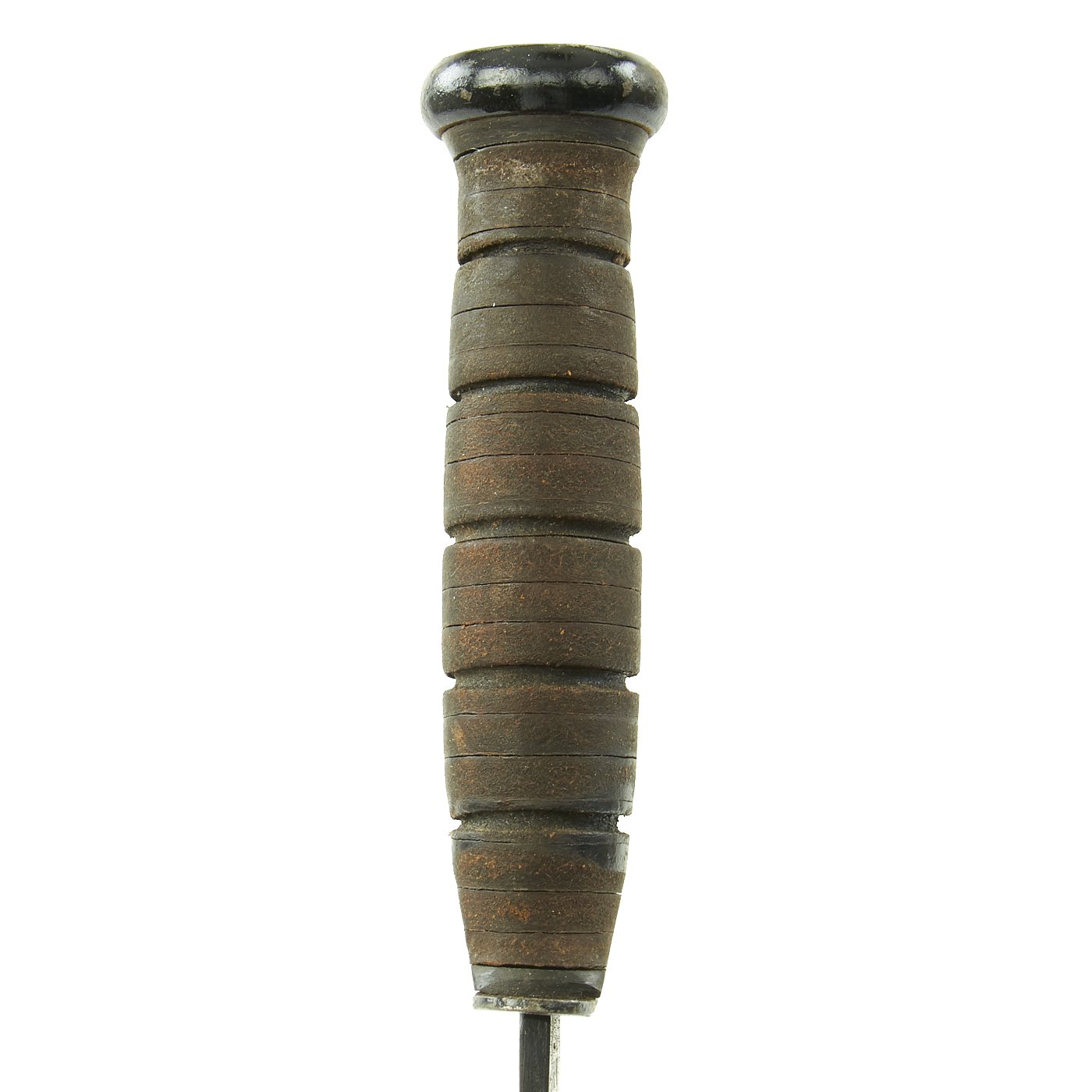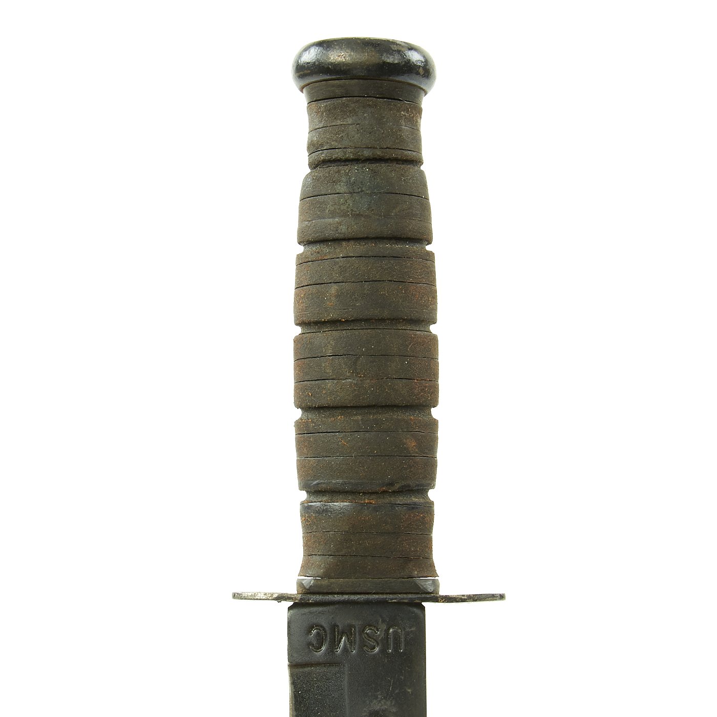 This knife features the early-style markings on the blade, and has a straight early issue type cross guard. Knife features original leather washer grip, which is in good condition but worn, and it has a heavy steel pommel with cross pinned tang.