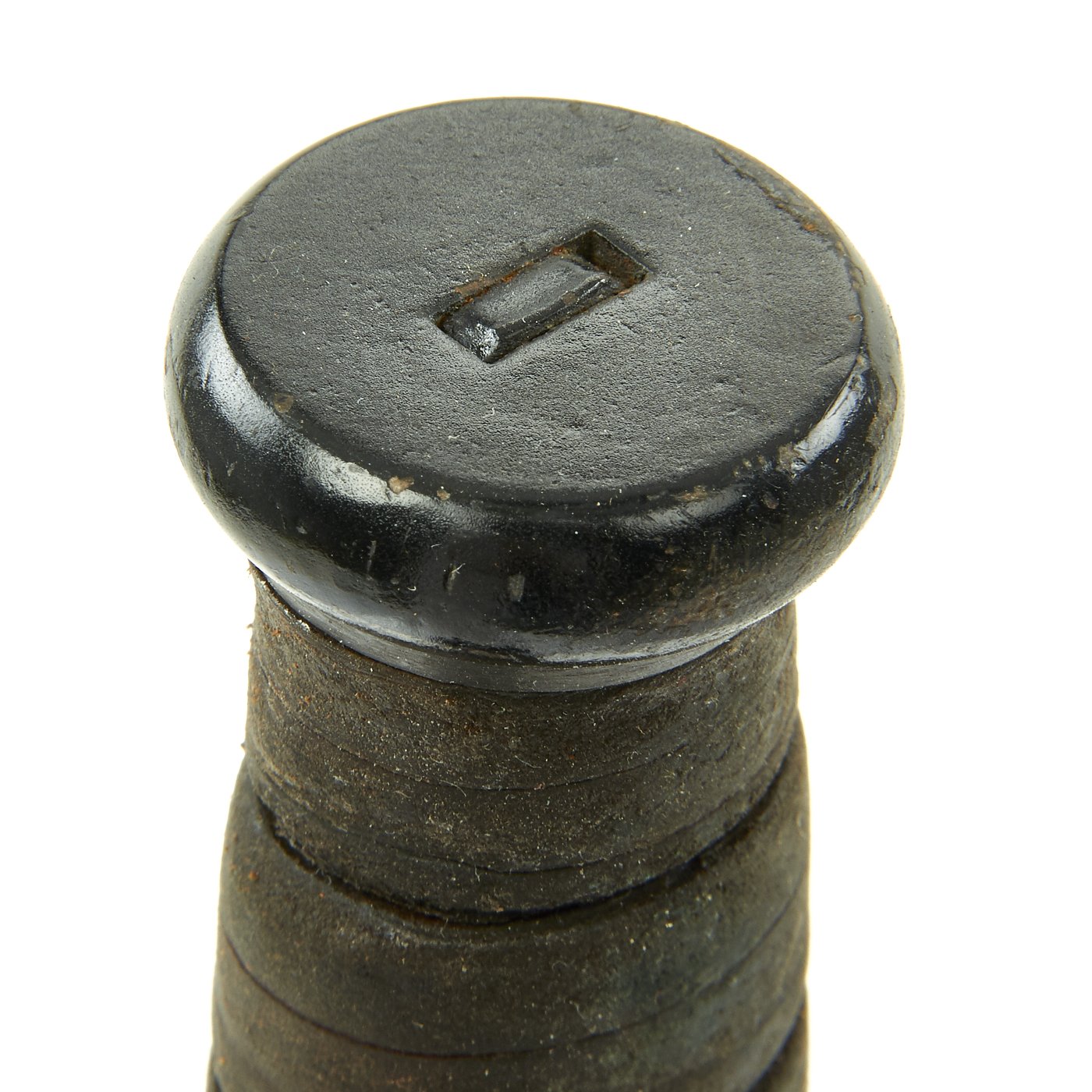 This example looks to have seen a lot of use, and the original finish was worn off of the blade and pommel, with some signs of oxidation. It was them painted black, some time ago, and continued to be used. We unfortunately have no way of knowing whether this happened in service or post service. The blade still have the correct shape, though sharpening and use have shortened it by about 1/8".