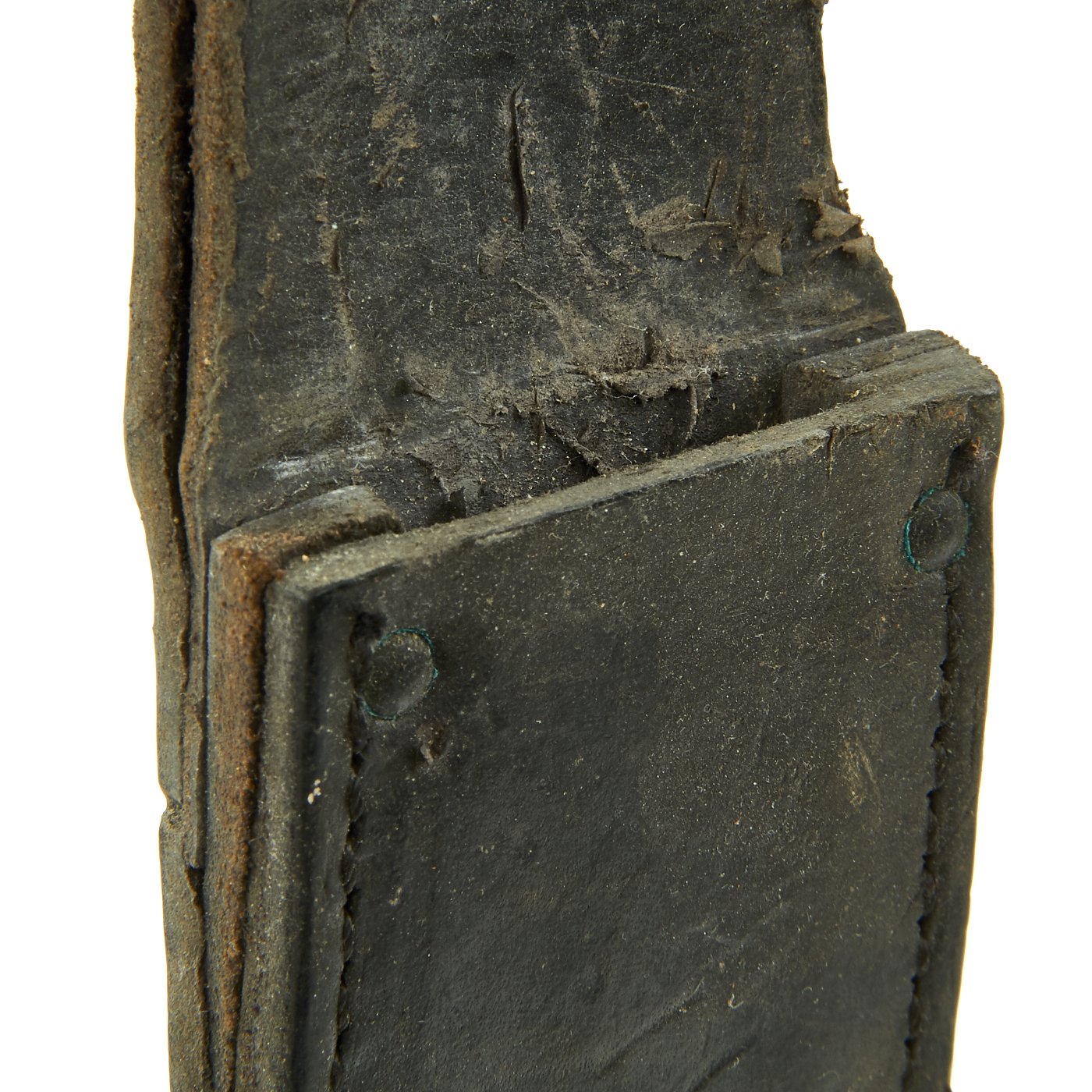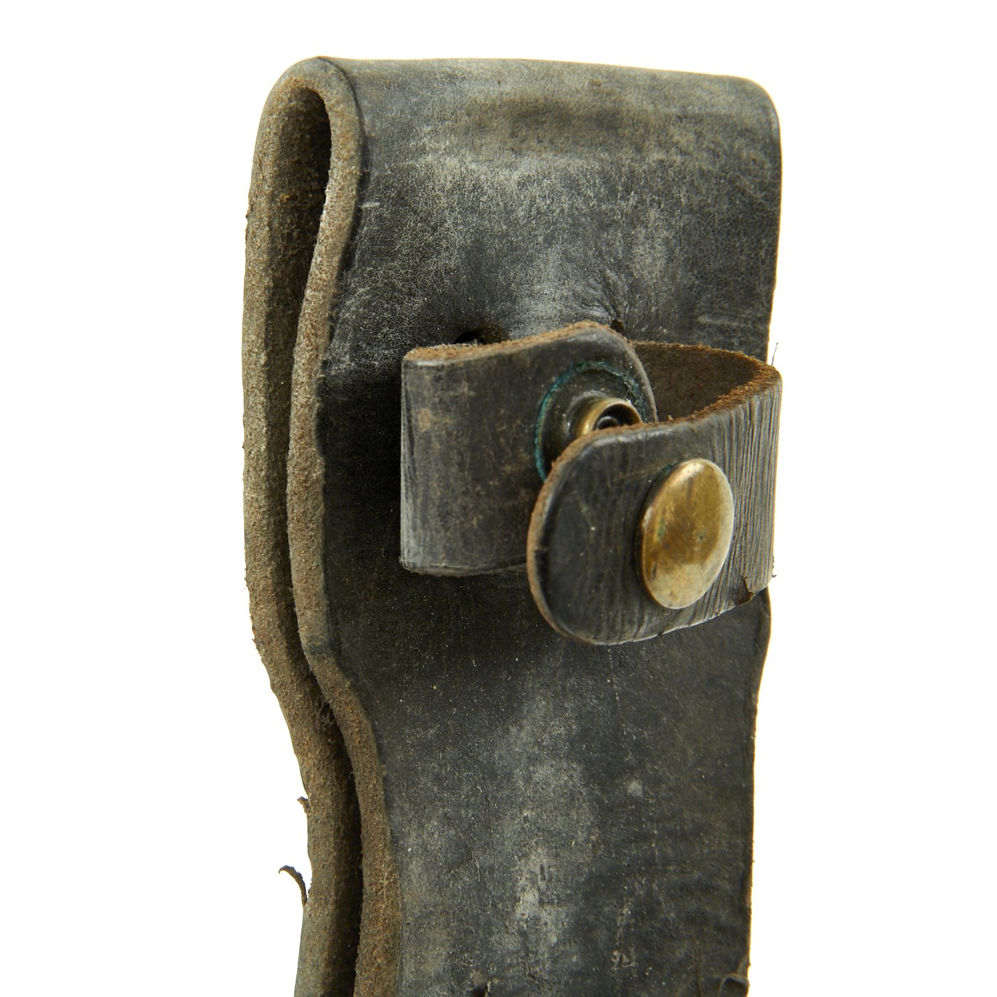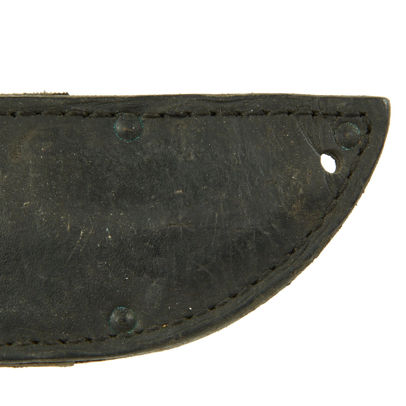The leather sheath is the standard type used with the Mark 2, and is in very good used condition. The leather looks to have been dyed black originally, but it is still supple and without cracks, except on the securing strap which has a few. All of the stitching and rivets are still intact, and it is structurally very sound. The securing strap is intact, and the snap is still functional, though the finish is worn as shown.