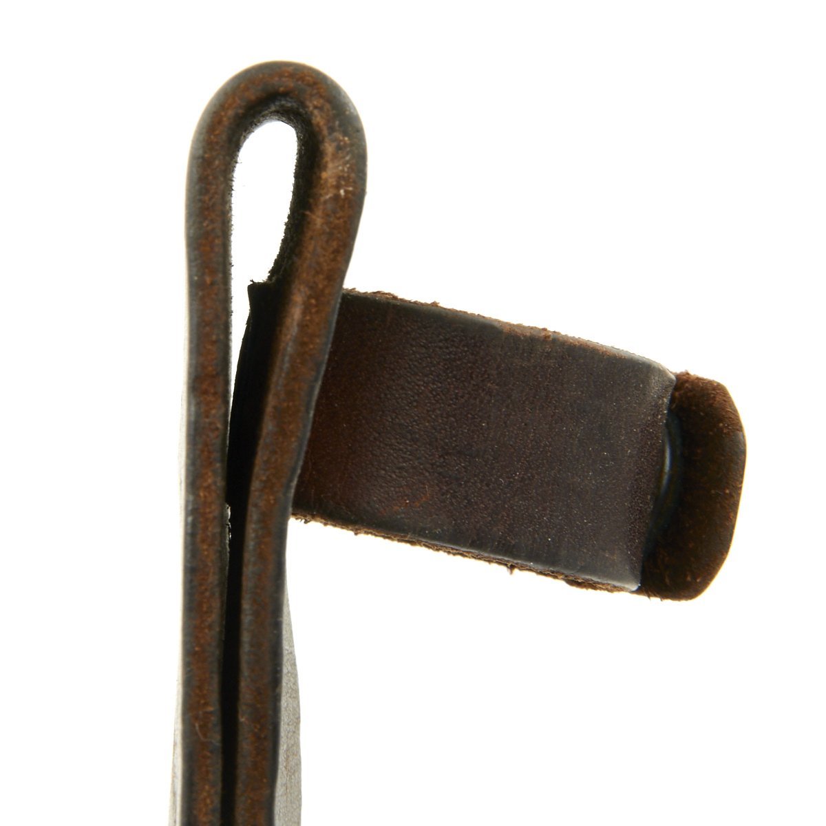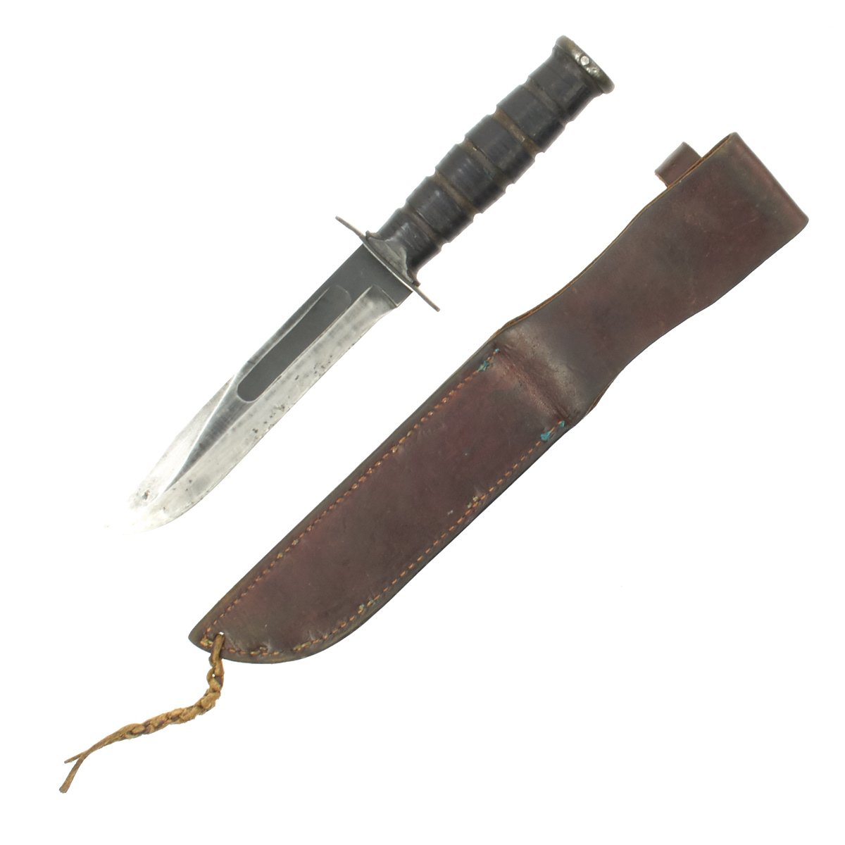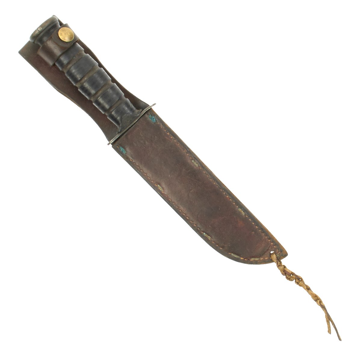 The leather scabbard is the standard type used with the Mark 2, and is in very good used condition. The leather has faded to a lovely dark brown, but it is still supple and without cracks. Almost all of the stitching and brass staples are still intact, and there is a bit of the leg tie-down remaining. The securing strap is intact, and the snap is still functional, though it has lost the original "blacked" brass finish.