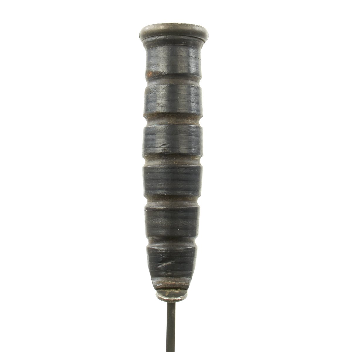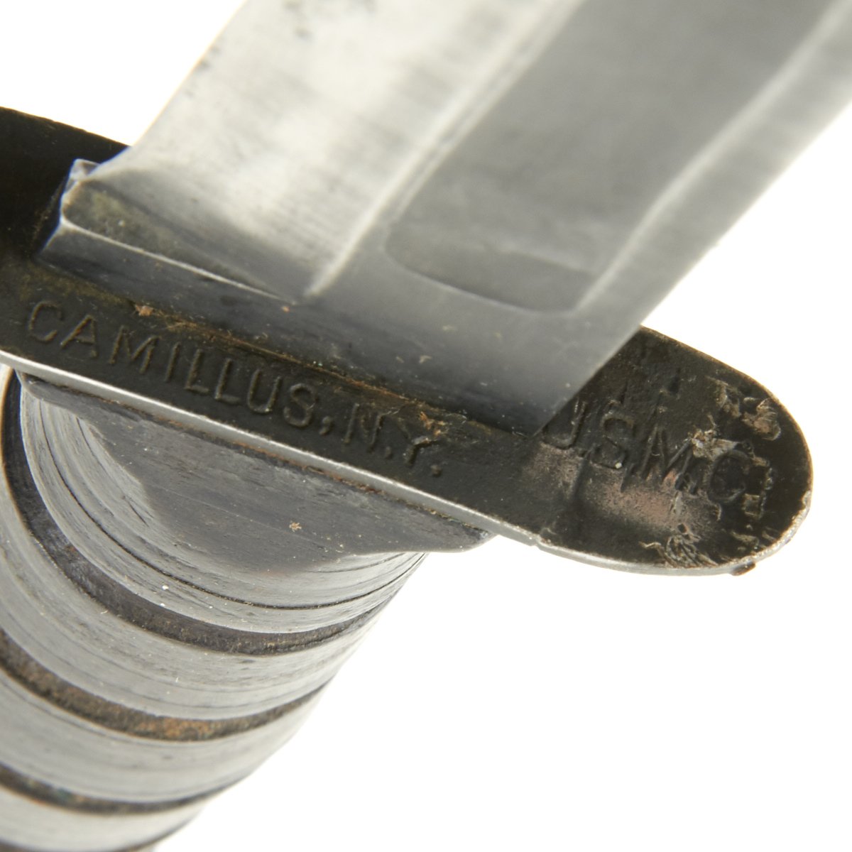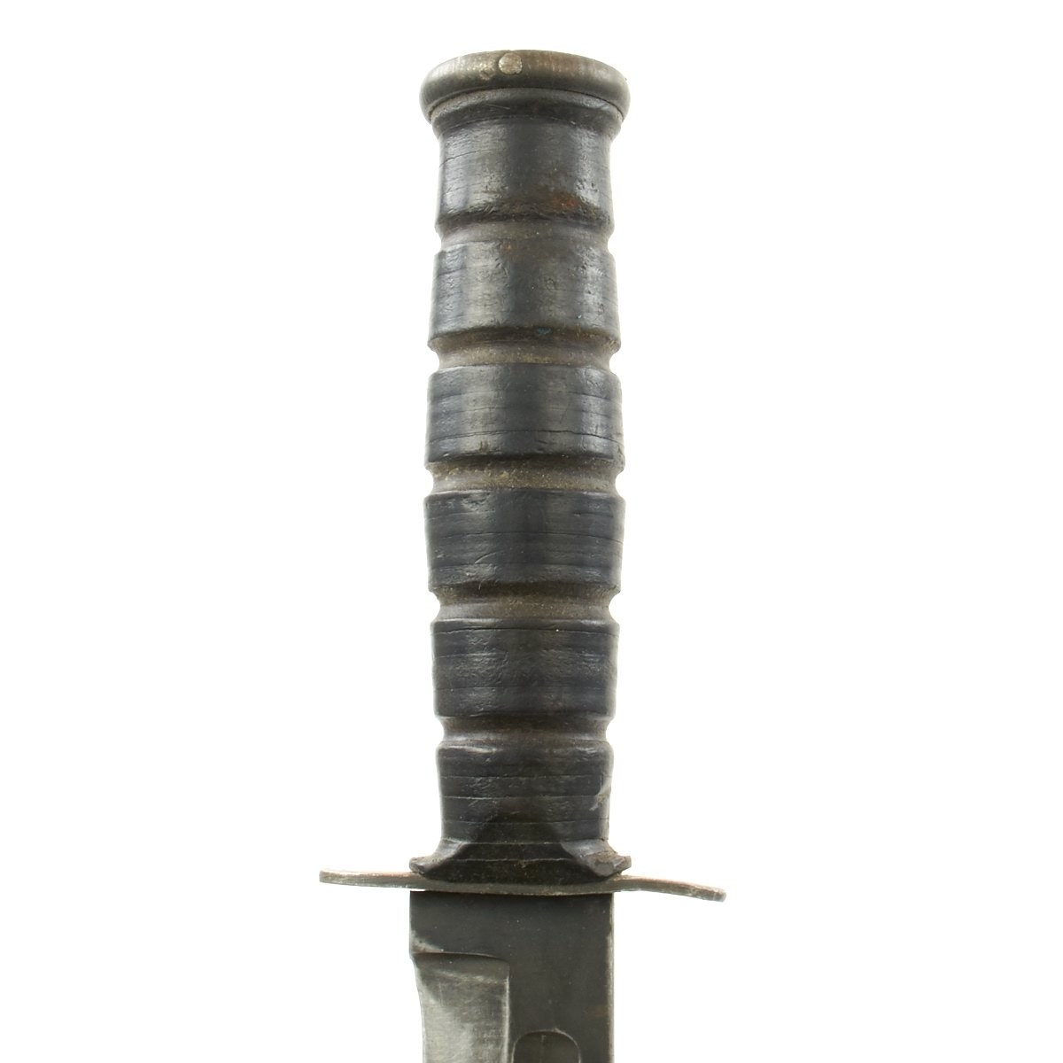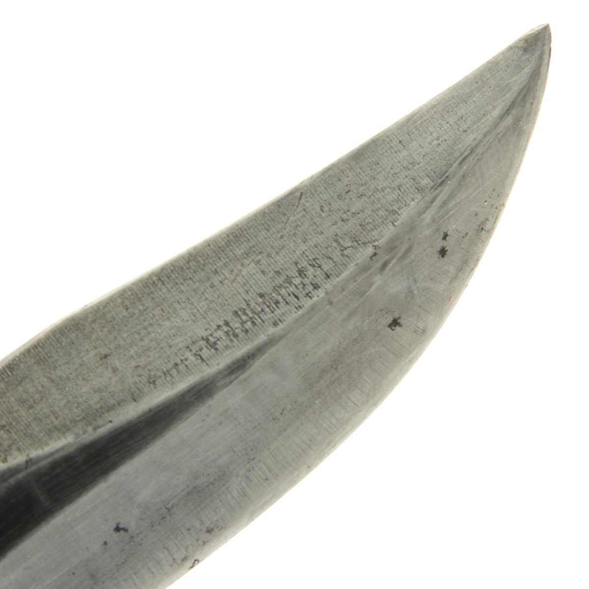 In 1944, the US Navy put through a change order to have the markings moved from the blade to the cross guard, so this knife was produced after that change. Knife features original leather washer grip, which is in great shape with minimal cracks and splitting, and it has a heavy steel pommel with cross pinned tang. The grip does show wear, and is now a very dark brown color, with rounding of the grip panels. Most of the original blade finish has worn off, due to use as well as sharpening. Only the ricasso and fullers still show full finish. The blade does have some areas of light corrosion, but there are no chips on the edge, which is still sharp.