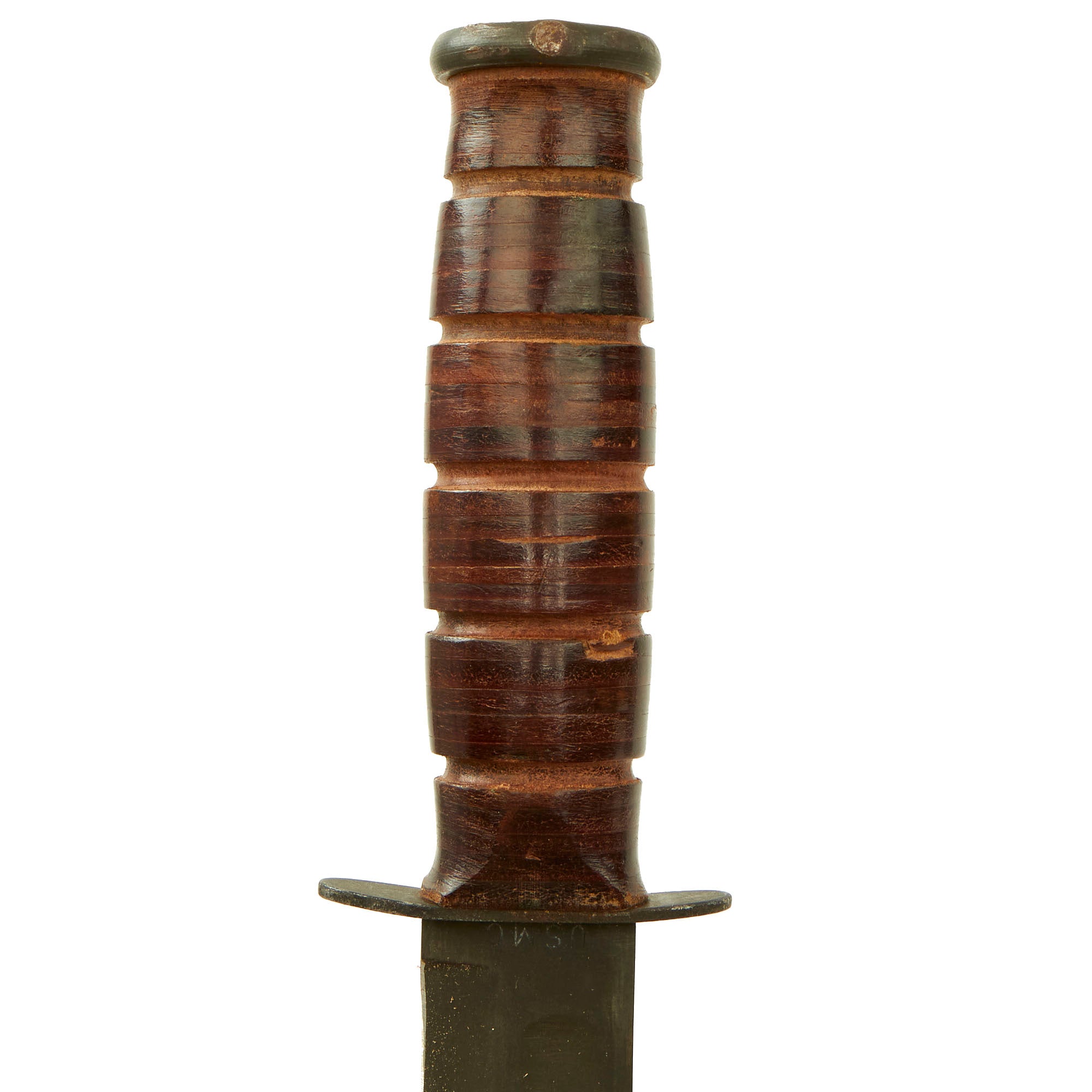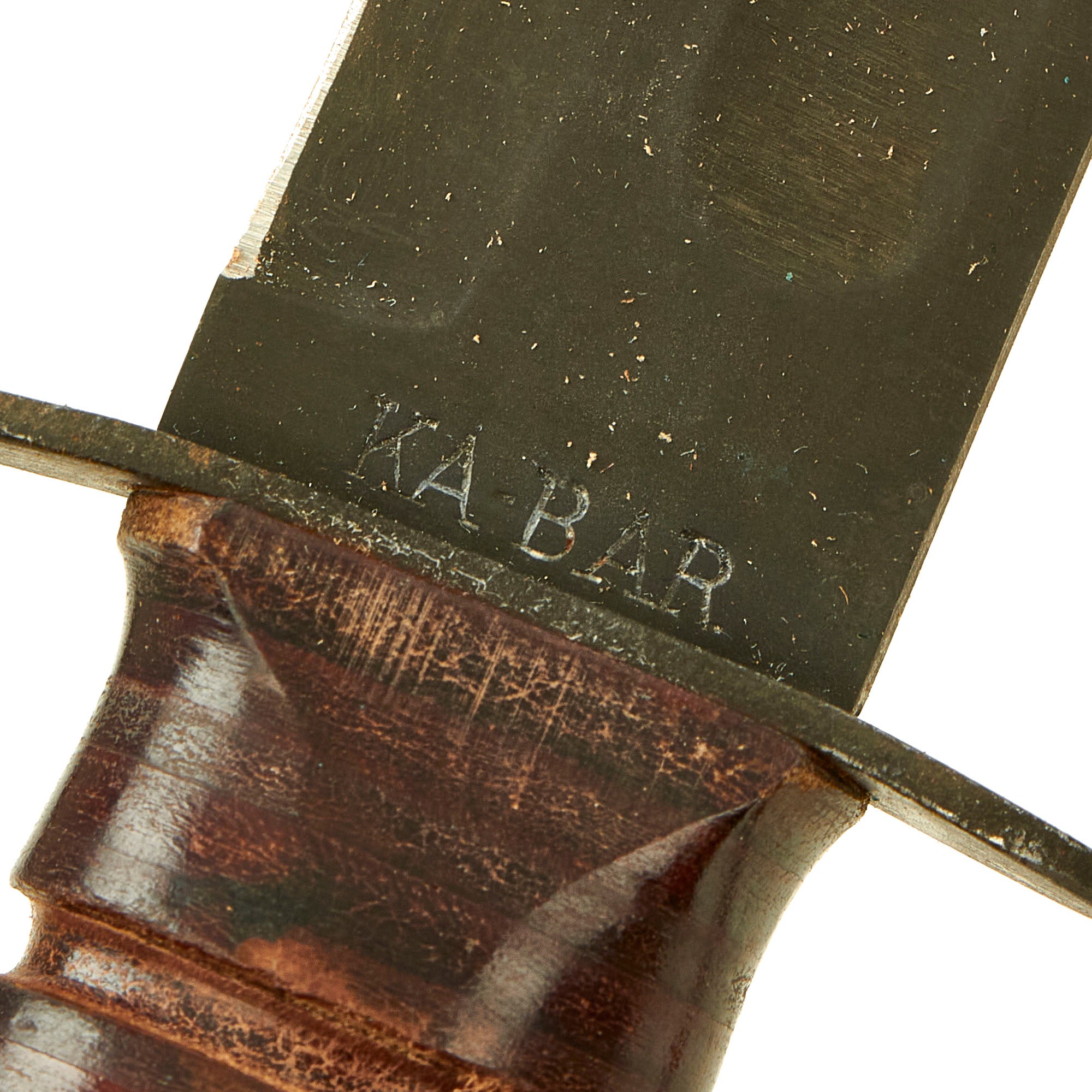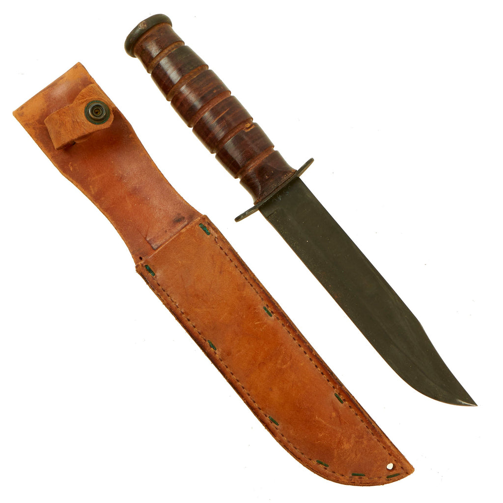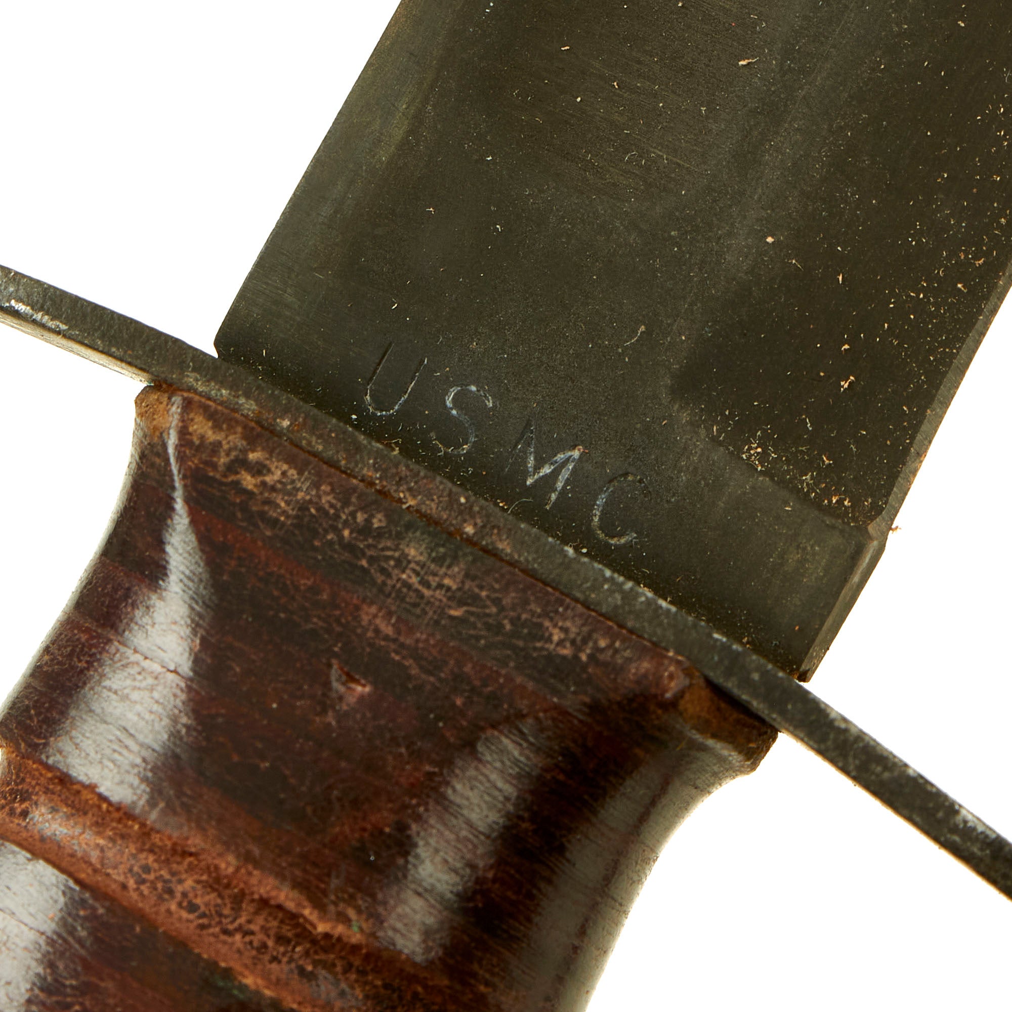 An excellent example of an exceptionally hard to find USMC-marked "KA-BAR" knife, field used with a very nice original leather sheath. No collection is complete without one! Ready to display!
