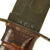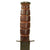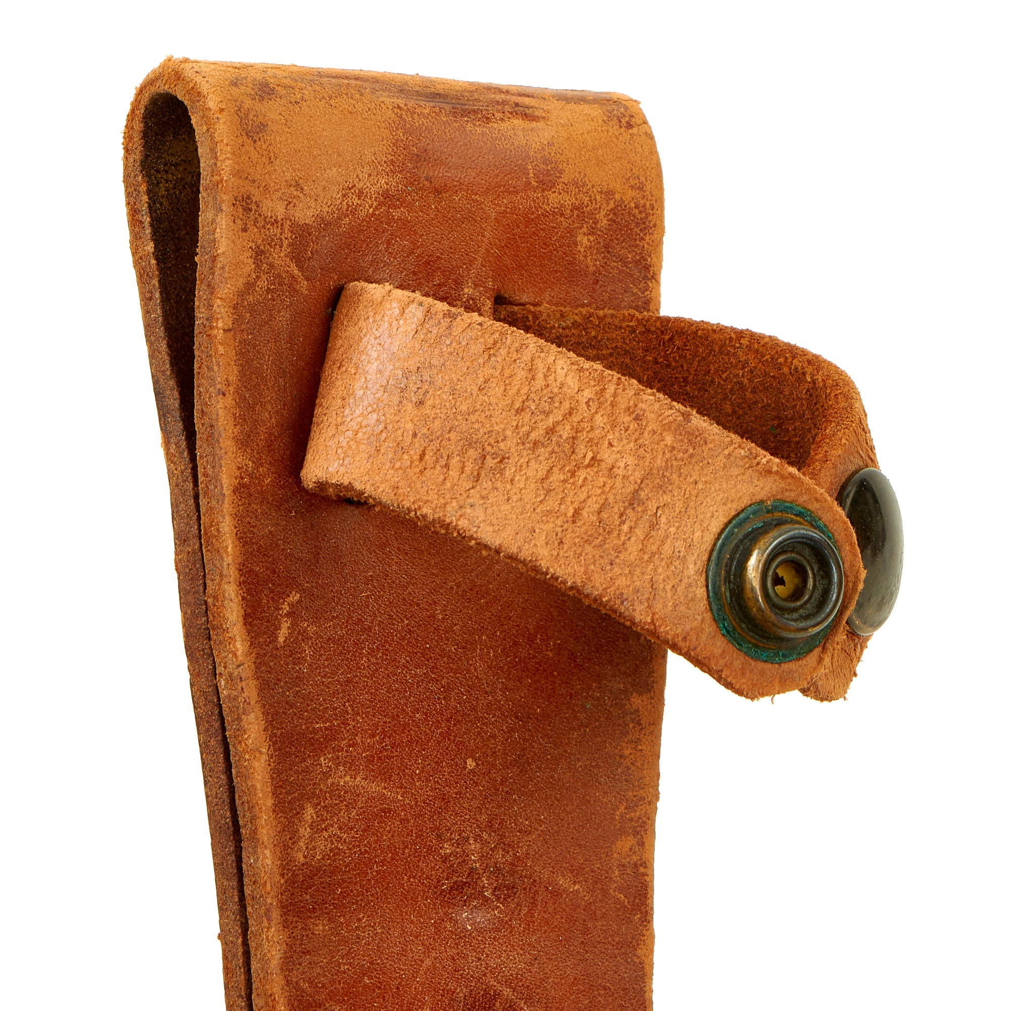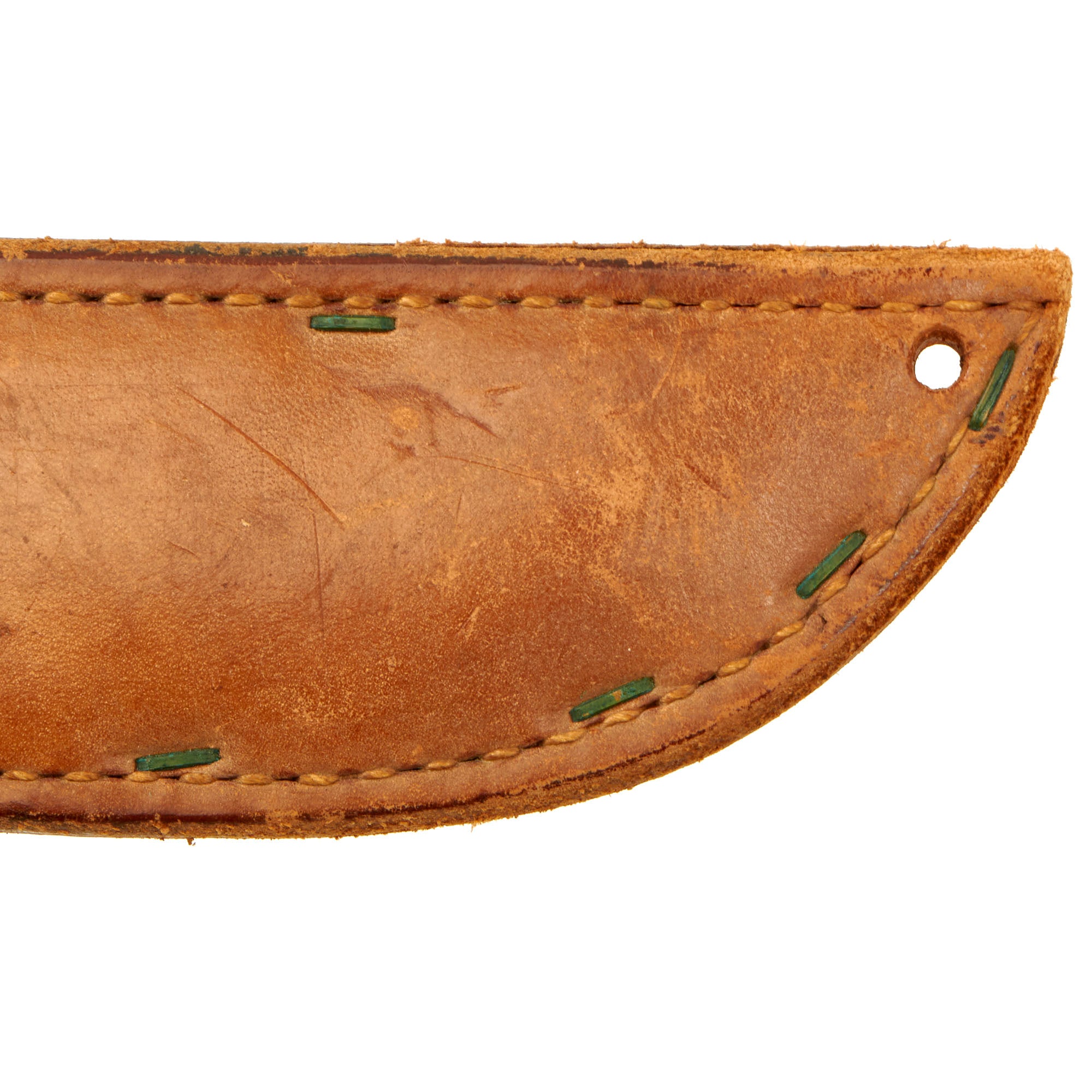 The leather sheath is the standard type used with the Mark 2, and is in very good, lightly used condition. The leather has faded to a lovely chestnut brown, but it is still supple and without major cracks, though there is a bit of surface dry rog on the top of the strap and belt loop. All of the stitching and staples are still intact, and it is structurally very sound. The securing strap is intact, and the snap is still functional, with a faded finish.