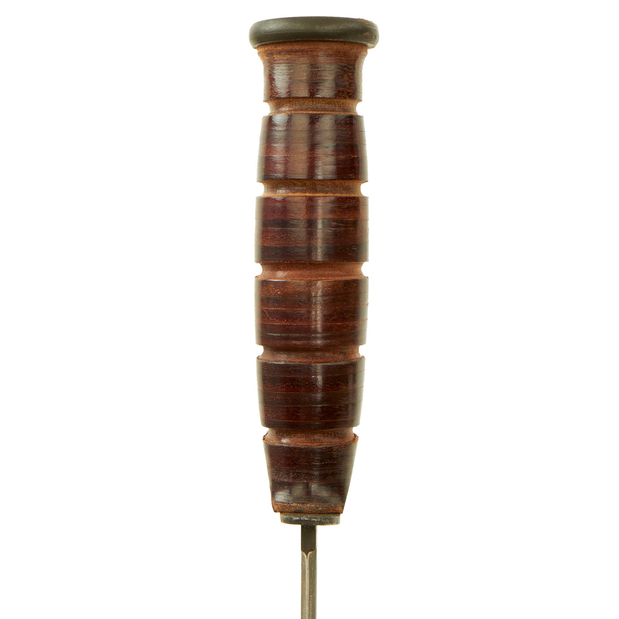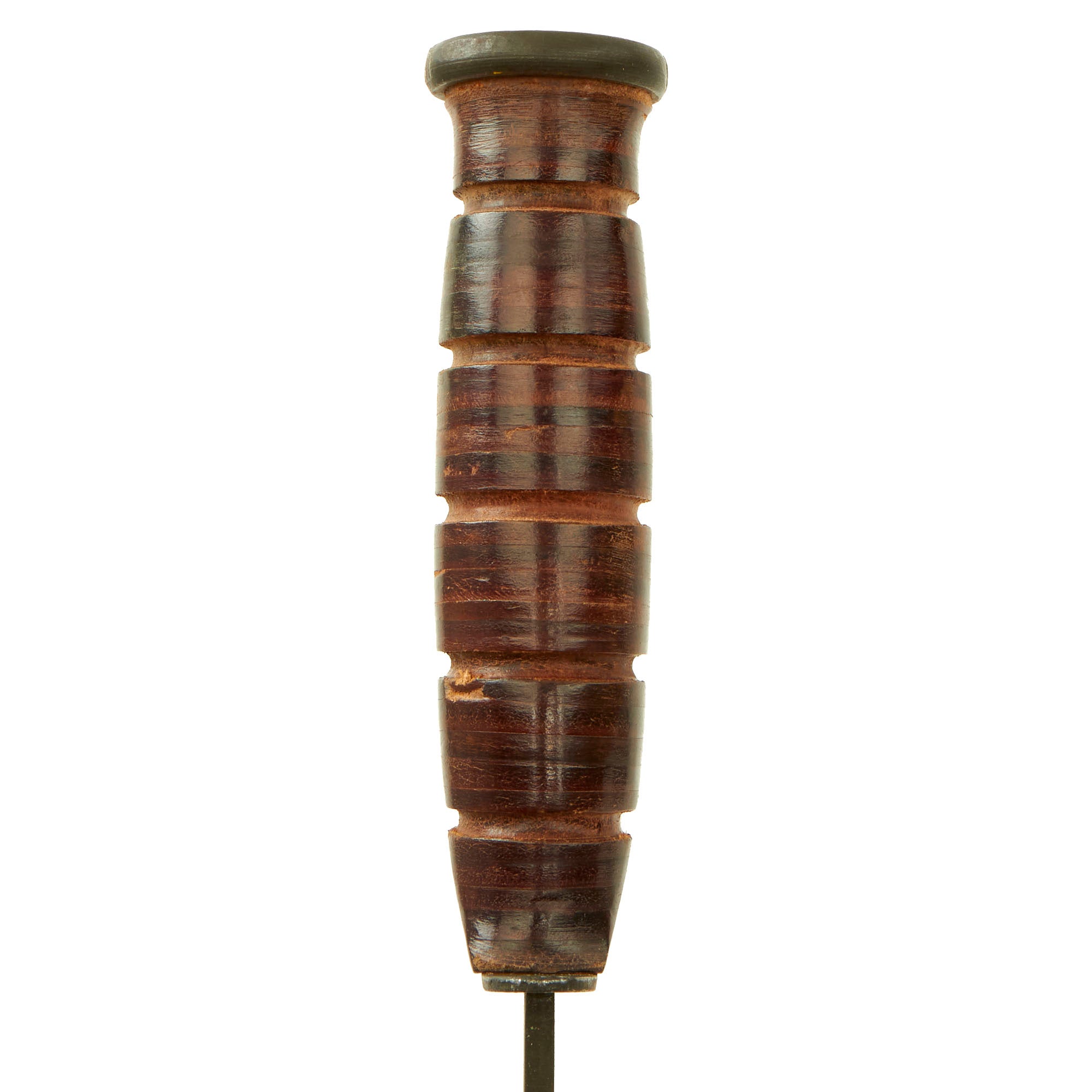 In 1944, the US Navy put through a change order to have the markings moved from the blade to the cross guard, however the last pattern of the "KA-BAR" marked knives kept the blade markings, as on this example. It has the later war slightly "swept back" cross guard. The knife features original polished leather washer grip, which is in excellent condition, with no cracks or splitting, and it has a 1/4" steel pommel with cross pinned tang. The grip is quite shiny, as it still has most of the original factory "buffed" finish. The blade retains virtually all of the original blackened finish, with the original factory ground edge almost completely retained. There is just a bit of oxidation preventing it from being truly "mint".