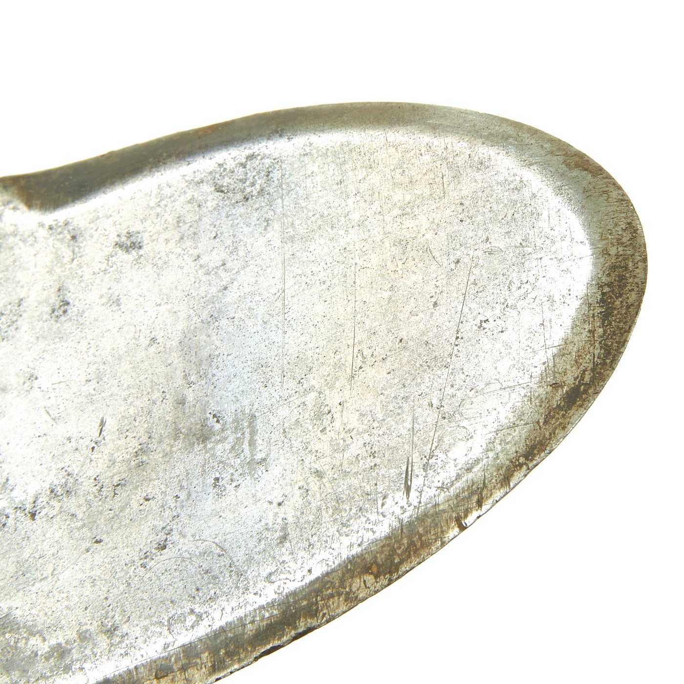 The blade on this example is in very good condition, and is properly marked U.S.M.C. / CHATILLON. N.Y. on the left blade body. The blade does have areas of light pitting and staining in areas, from being kept in the leather scabbard for decades. The edge is great, and relatively sharp. It does appear to have been sharpened somewhat, but nothing major, and there are no dents or chips. The grip scales are also in very good condition, with all rivets intact, and just a bit of wear. They have shrunk a bit, so the rivets protrude slightly.