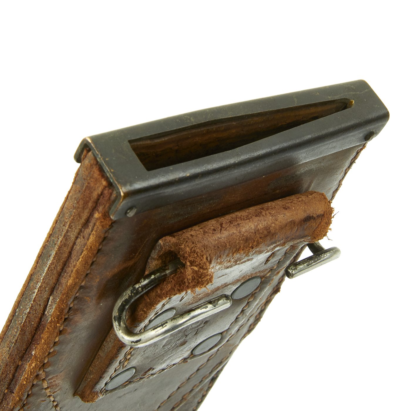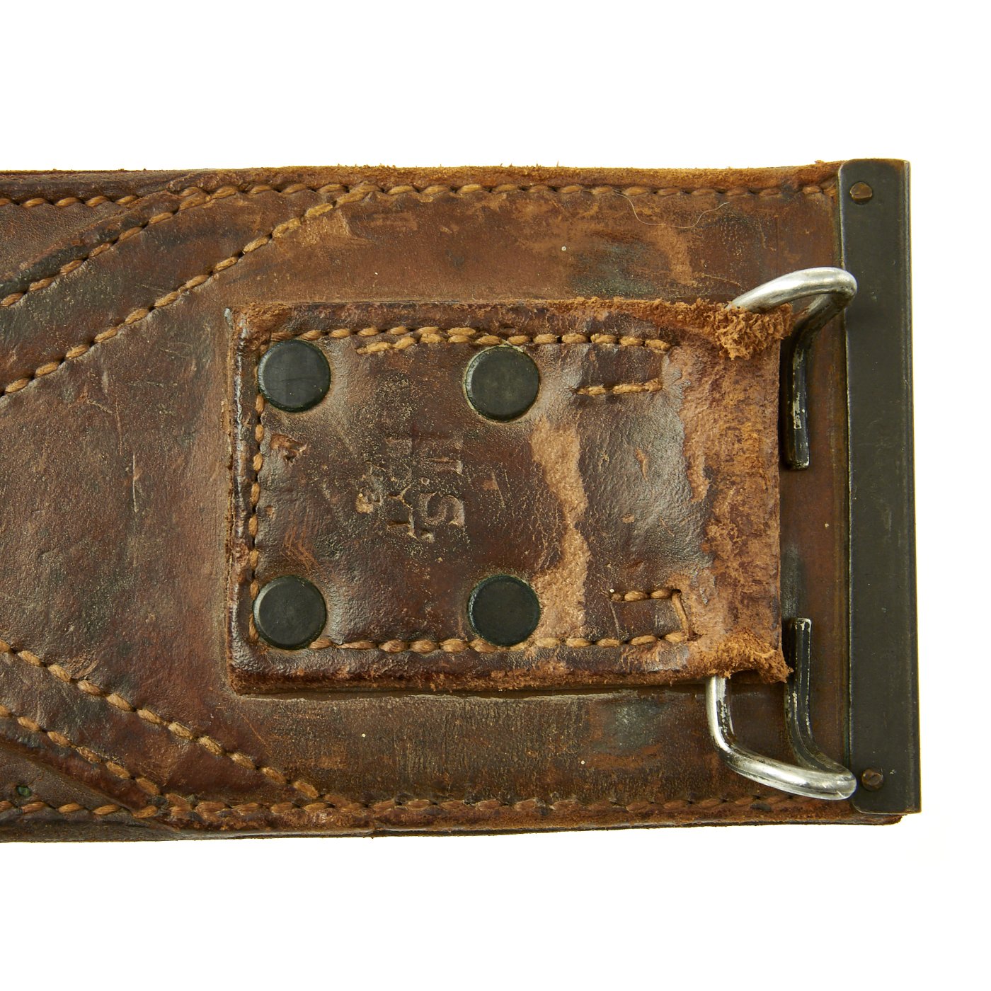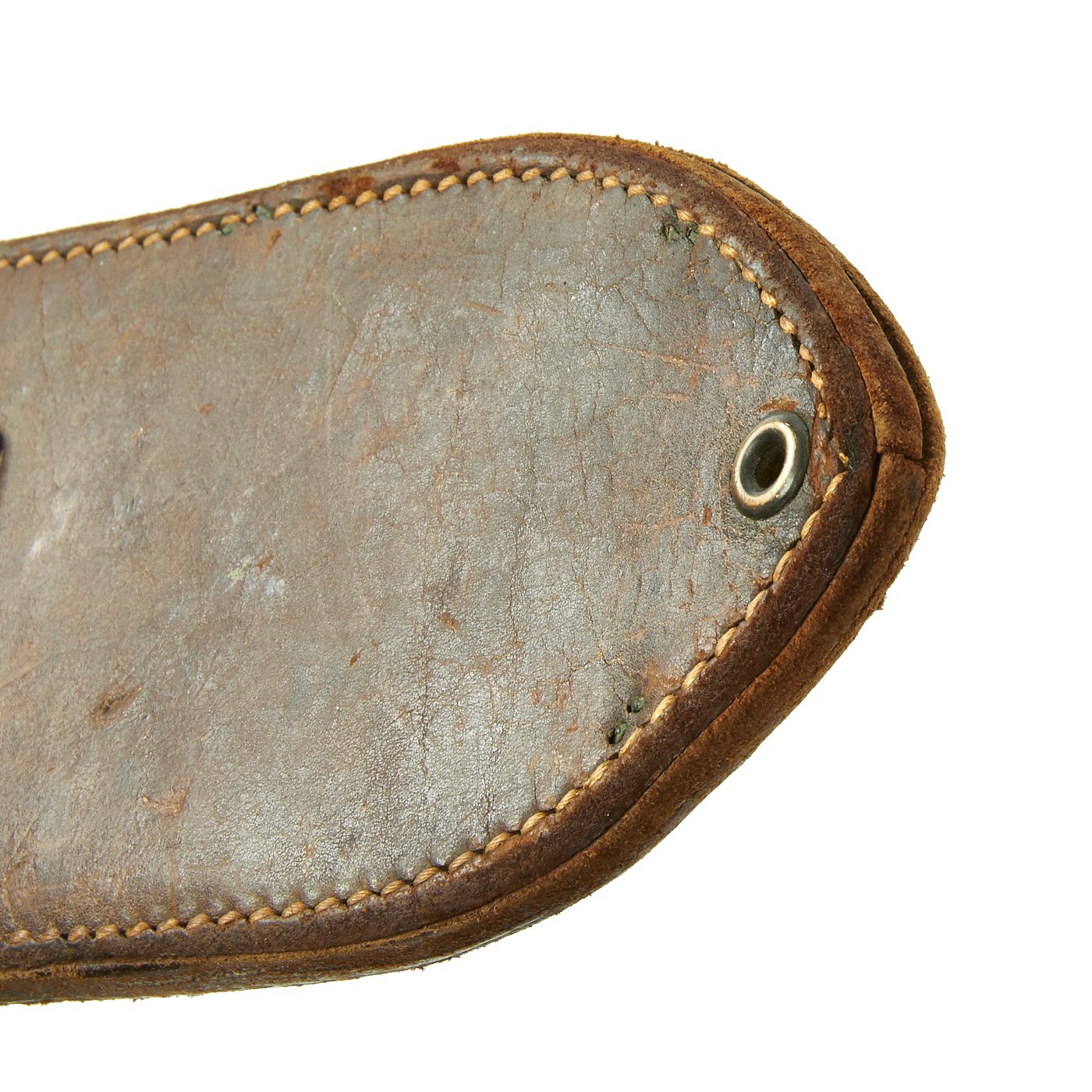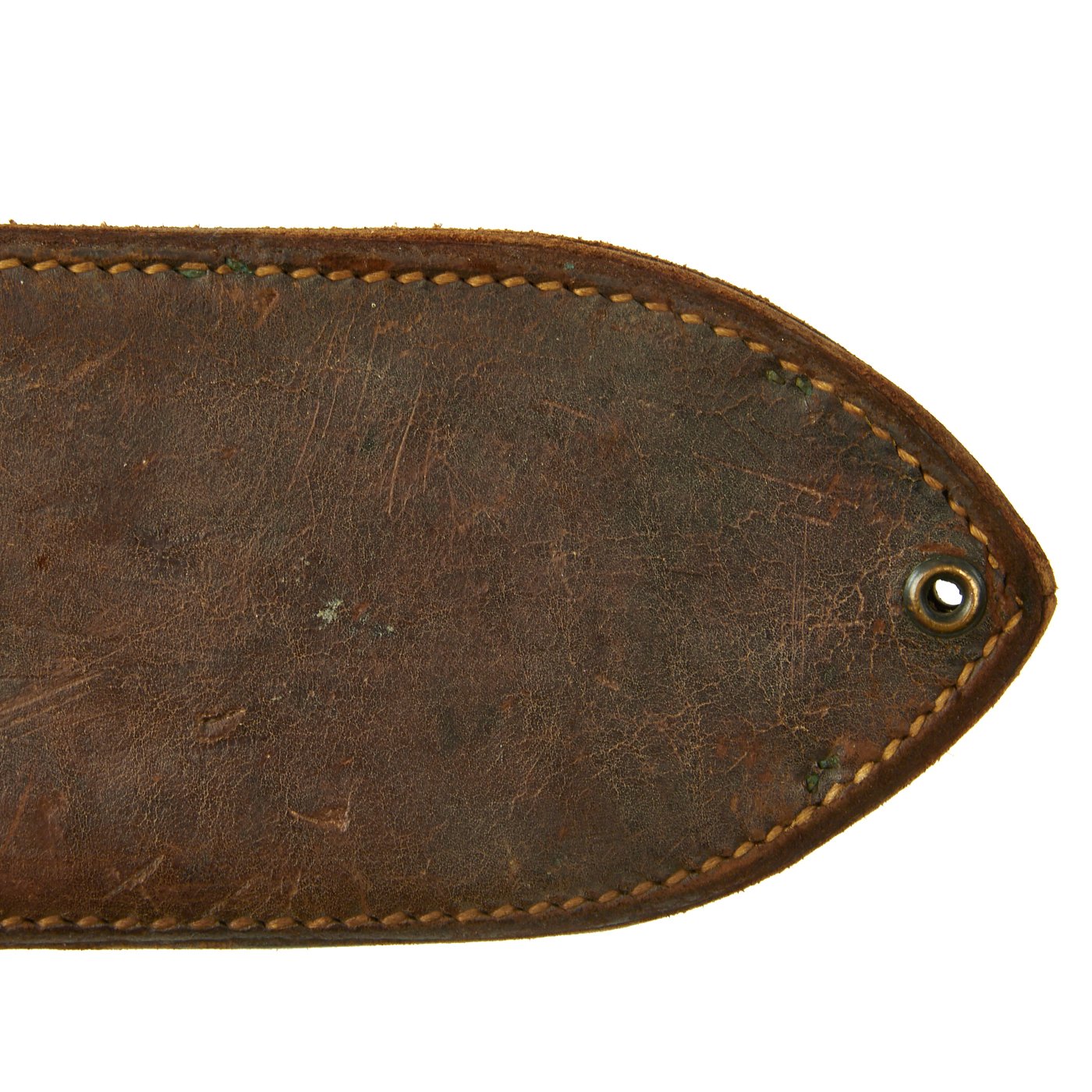 The scabbard is the standard heavy leather construction with a brass throat. The back is marked on the belt hanger with U S M C / BOYT / 43, indicating 1943 manufacture by Boyt Harness Co of Des Moines Iowa, a major leather goods supplier during WWII. They made various slings, holsters, scabbards, and other items for the war. Scabbard has a great aged brown color, with some verdigris around the rivets, as expected from a knife this age. Original belt hanger is intact, and not bent, though the leather retaining loop is worn at the top.