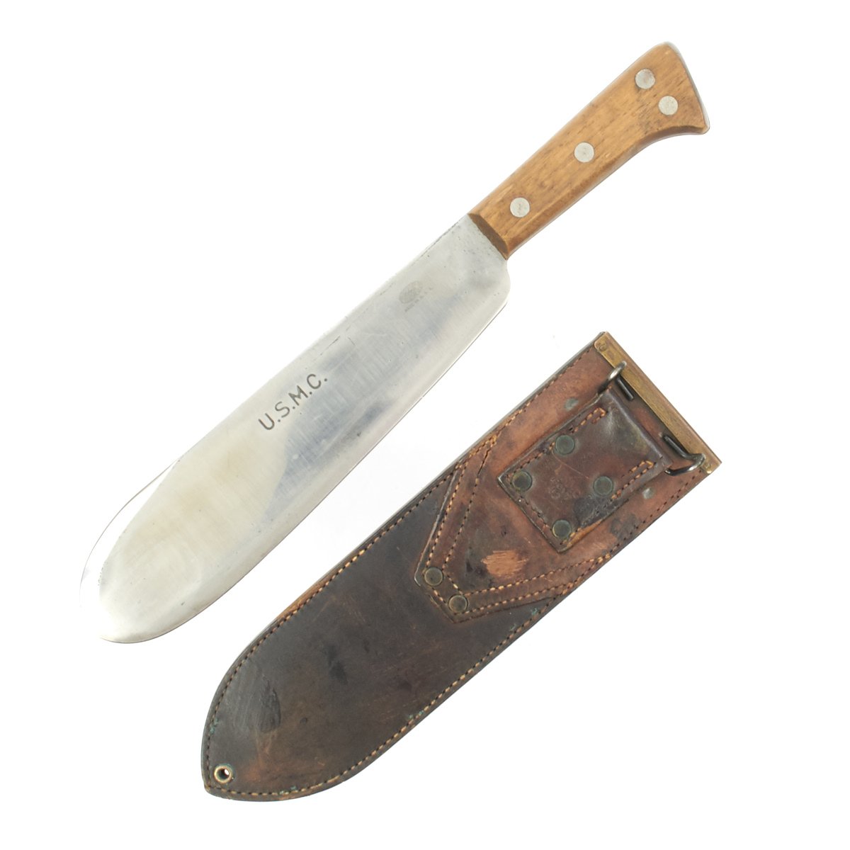 Original Item: Only One Available. This is a near mint condition USMC Medical Corpsman knife by Clyde Cutlery Company of Ohio with U.S.M.C. marked on the blade and and on the leather scabbard. The type used by the Marine Corps in the South Pacific, and like all "Bolo" type knives, were intended as utility tools for clearing brush and light construction. With this knife wood and bamboo could be fashioned into stakes, splints, etc. Though not originally intended as a fighting knife, the close tactics of the Japanese fighting caused these knives to be heavily relied upon by USMC soldiers and were used in many battles according to the marines that survived.