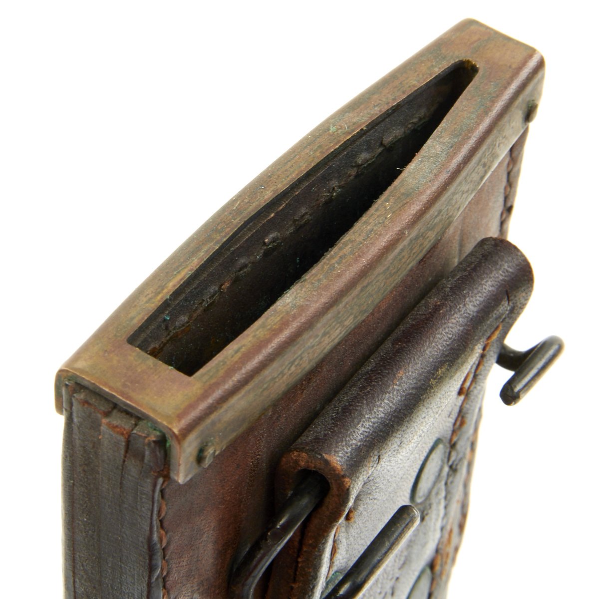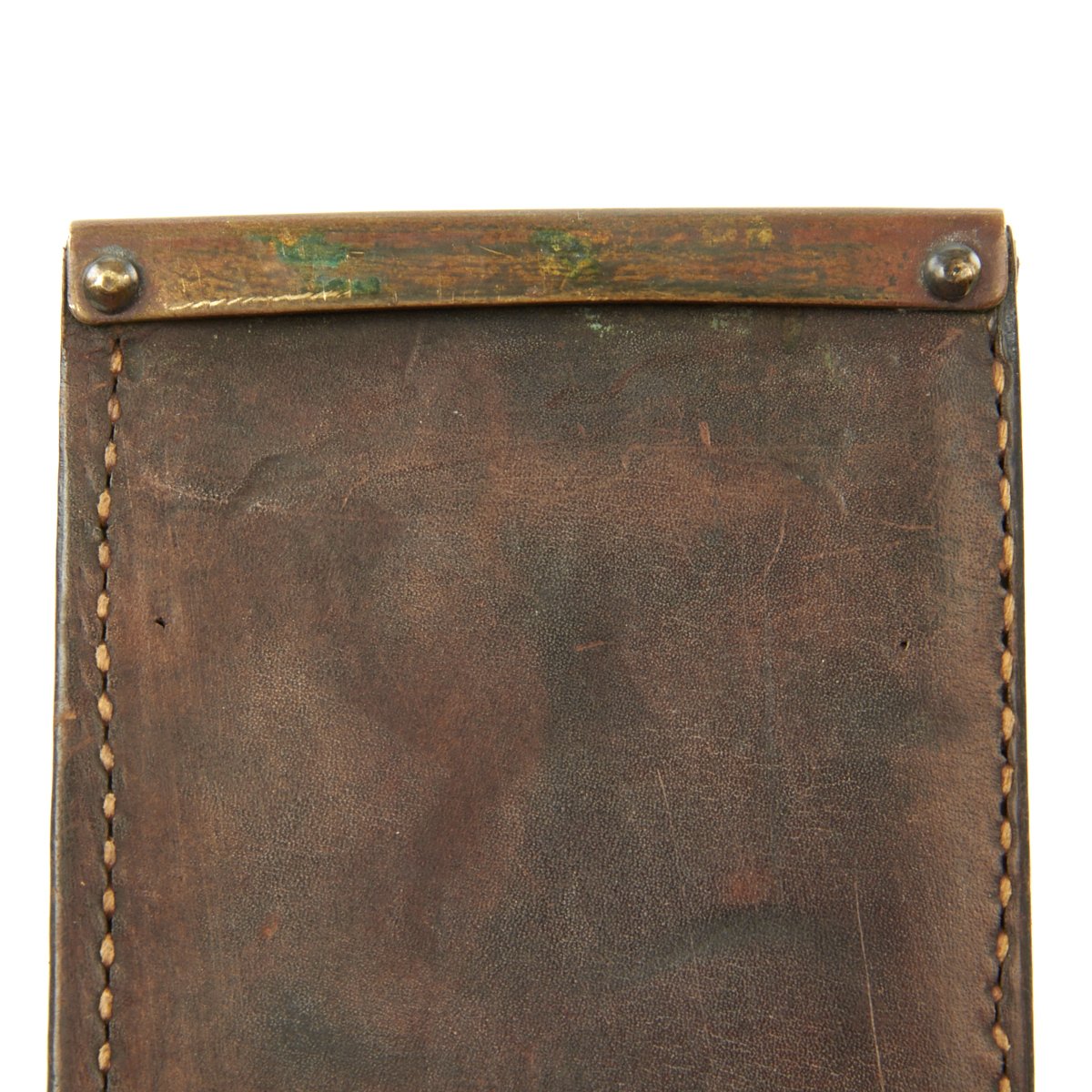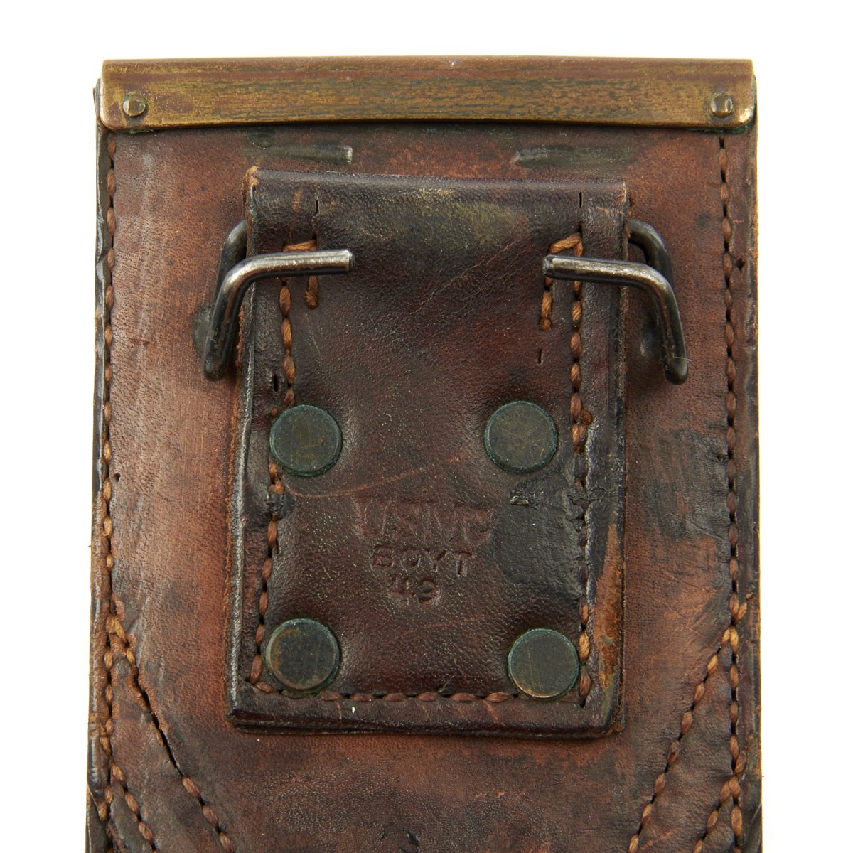 The scabbard is the standard heavy leather construction with a brass throat. The back is marked on the belt hanger with U S M C / BOYT / 43, indicating 1943 manufacture by Boyt Harness Co of Des Moines Iowa, a major leather goods supplier during WWII. They made various slings, holsters, scabbards, and other items for the war.