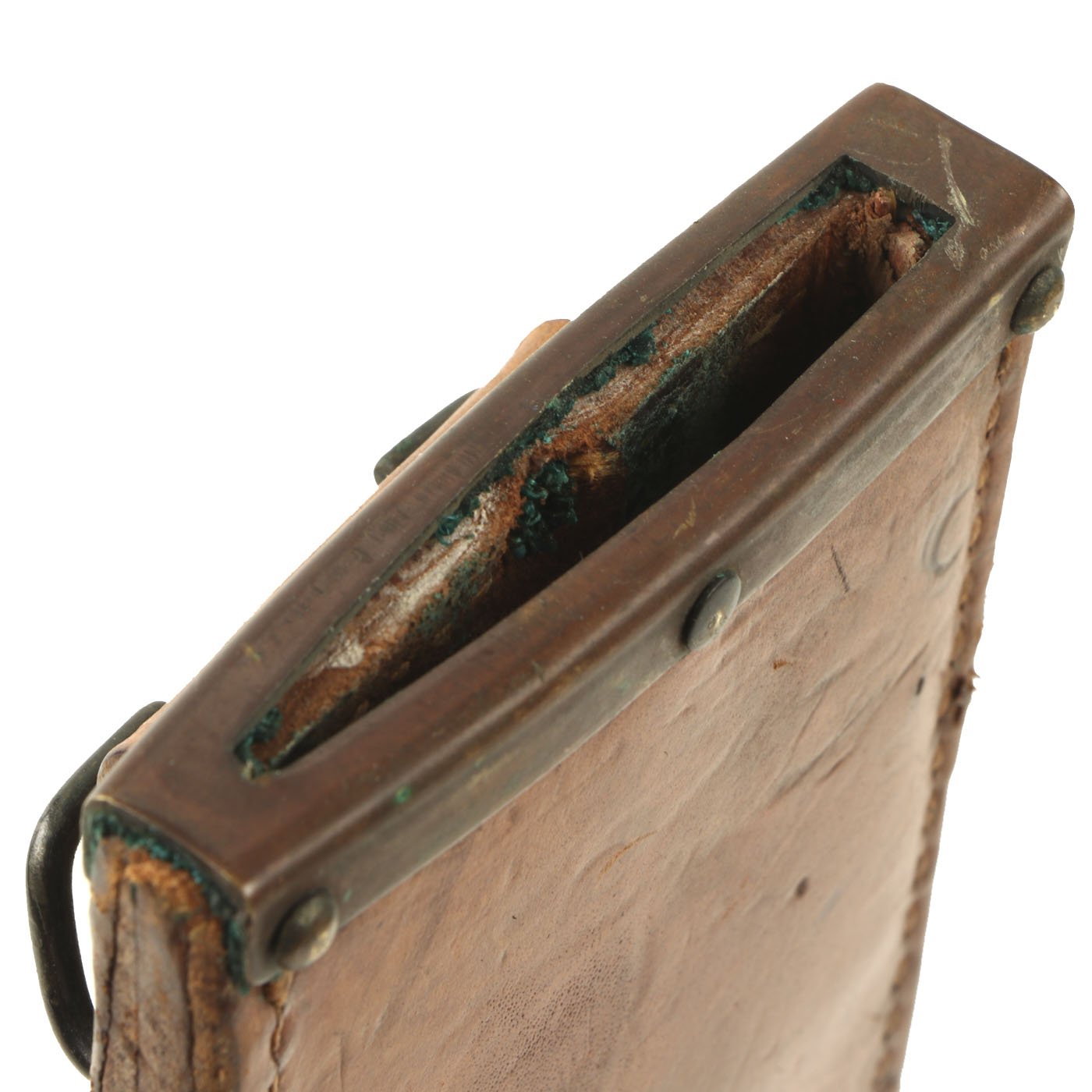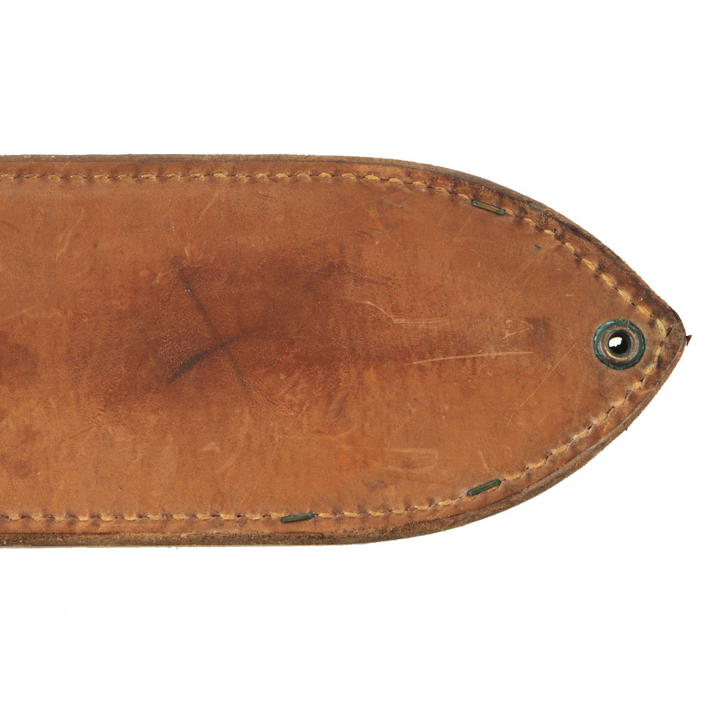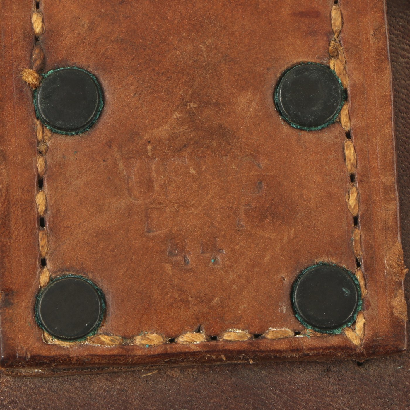 The scabbard is the standard heavy leather construction with a brass throat. The back is marked on the belt hanger with U S M C / BOYT / 44, indicating 1944 manufacture by Boyt Harness Co of Des Moines Iowa, a major leather goods supplier during WWII. They made various slings, holsters, scabbards, and other items for the war. Scabbard has a great aged brown color, with some verdigris around the rivets, as expected from a knife this age. Original belt hanger is intact, and not bent, with no tears to the leather.
