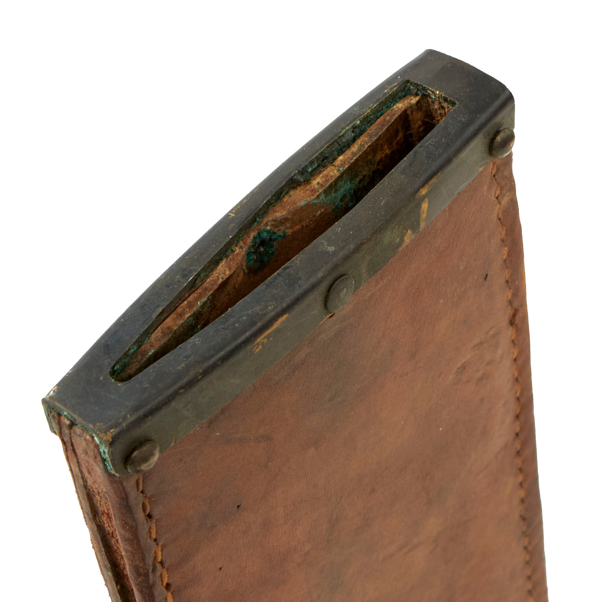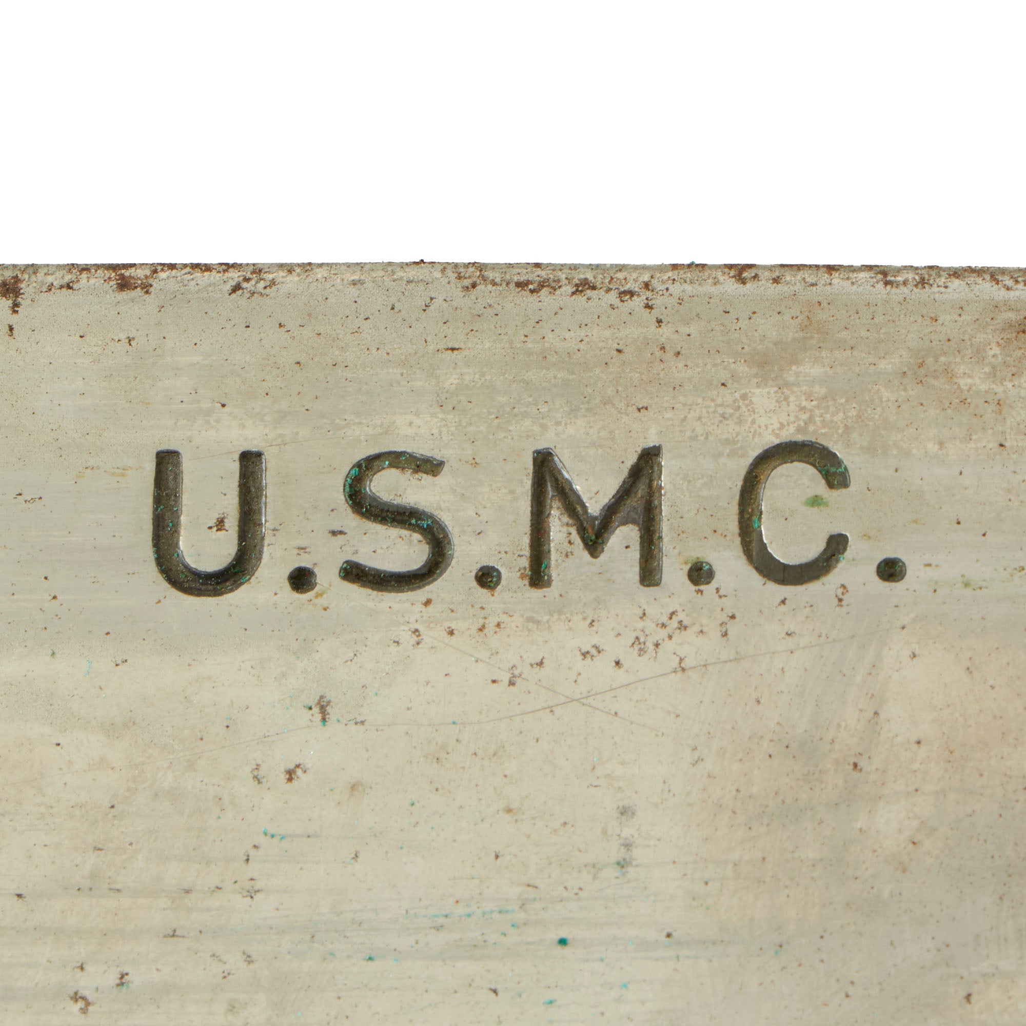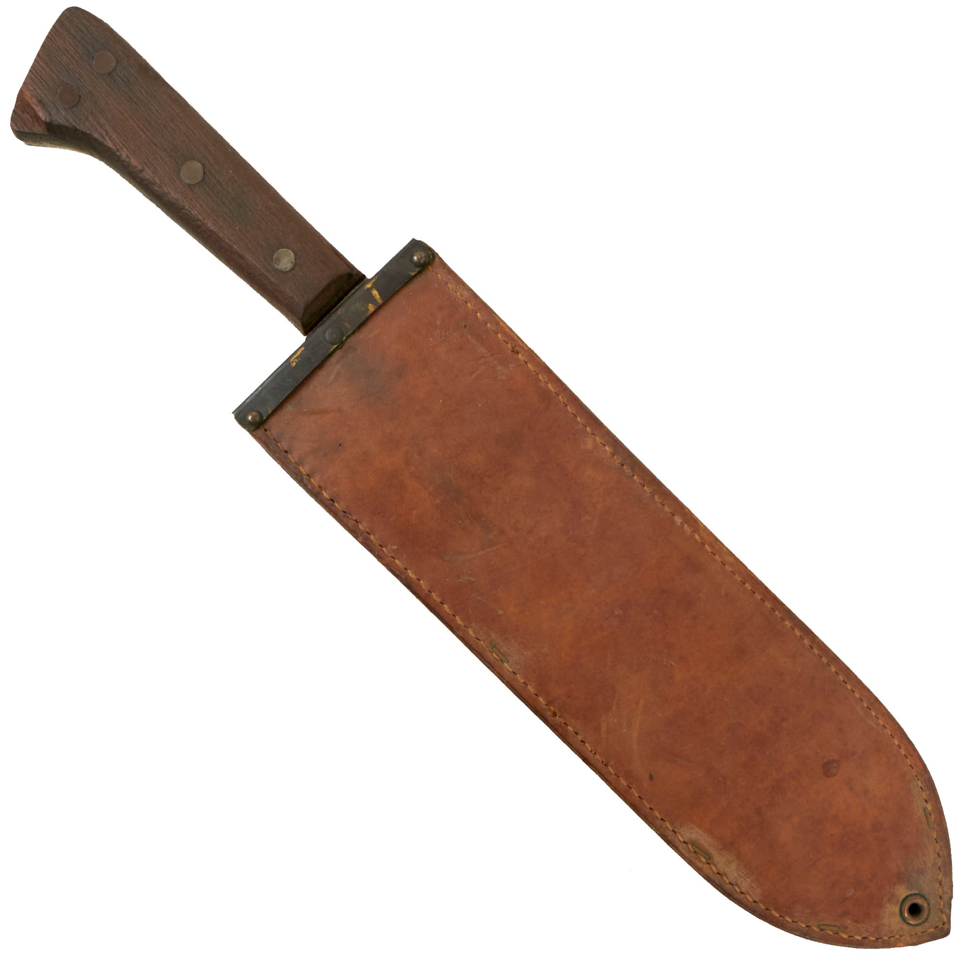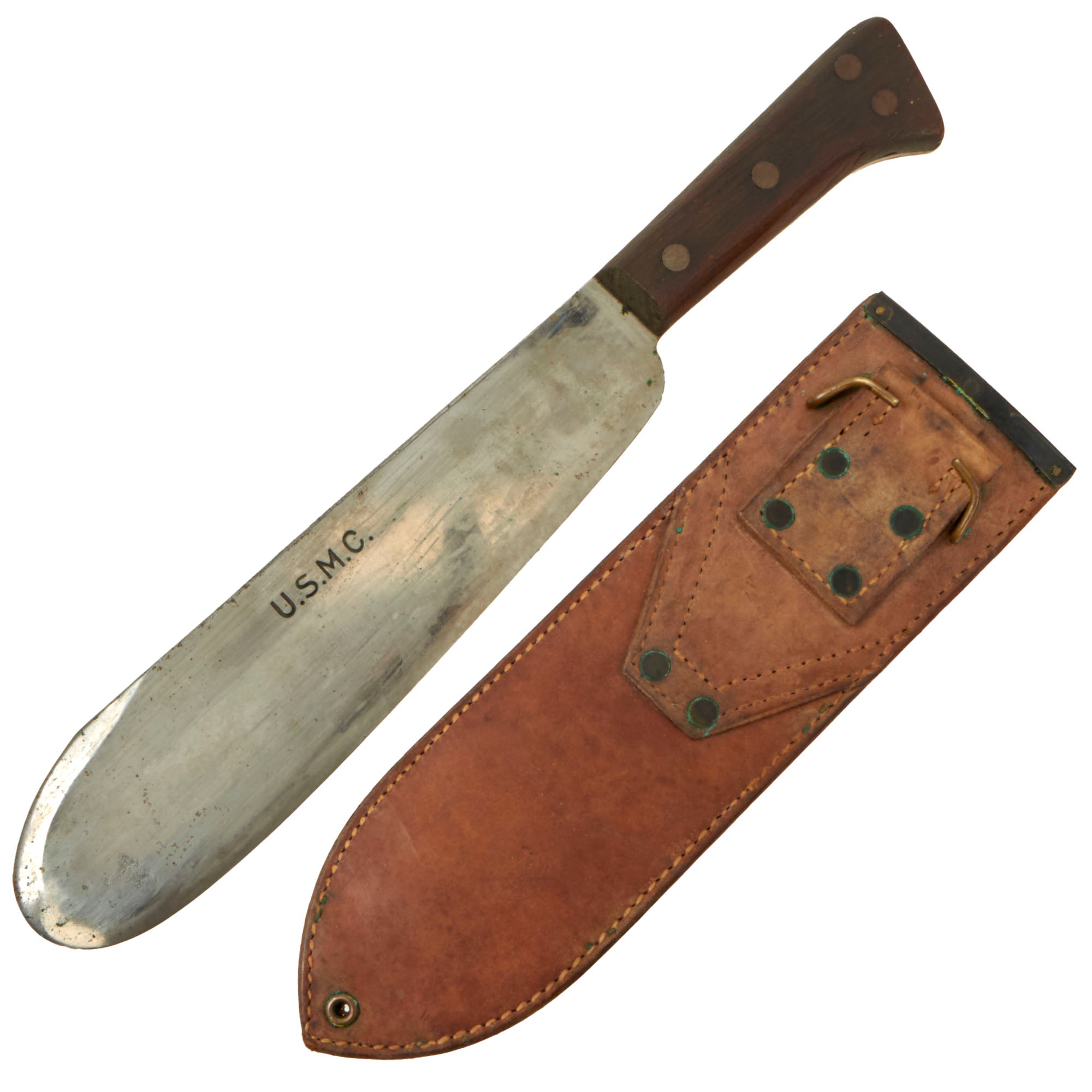 Original Item: Only One Available. This is a very nice USMC Medical Corpsman knife with USMC marked and dated leather scabbard. The type used by the Marine Corps in the South Pacific, and like all "Bolo" type knives, were intended as utility tools for clearing brush and light construction. With this knife wood and bamboo could be fashioned into stakes, splints, etc. Though not originally intended as a fighting knife, the close tactics of the Japanese fighting caused these knives to be heavily relied upon by Marines and were used in many battles according to the Marines that survived.