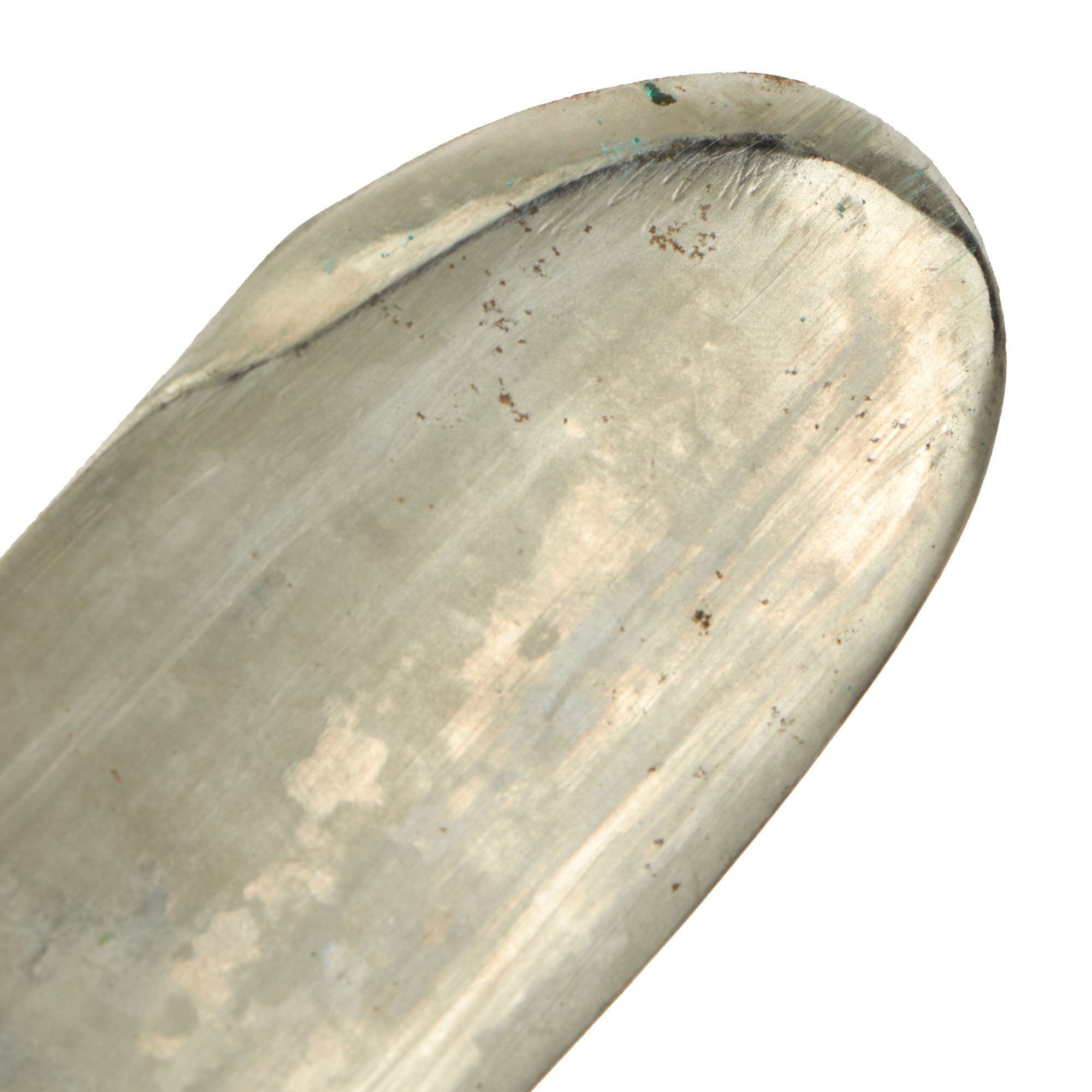 The blade on this example is in good condition, and is properly marked USMC on the left blade body but no longer has any manufacturer details visible. The blade does have some minor staining and pitting from age and being in a scabbard for decades, however overall it is very solid. The edge is great, and relatively sharp. It does appear to have been sharpened somewhat, but nothing major. The grip scales are also in very good condition, with all rivets intact. Color indicates that the knife was used extensively but does not appear to have been replaced.