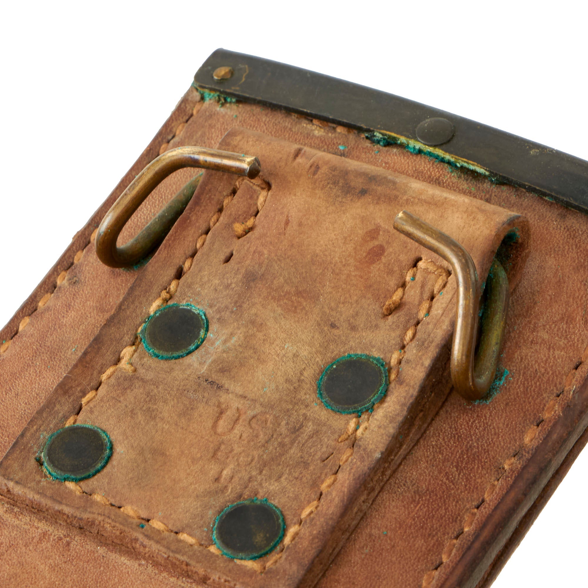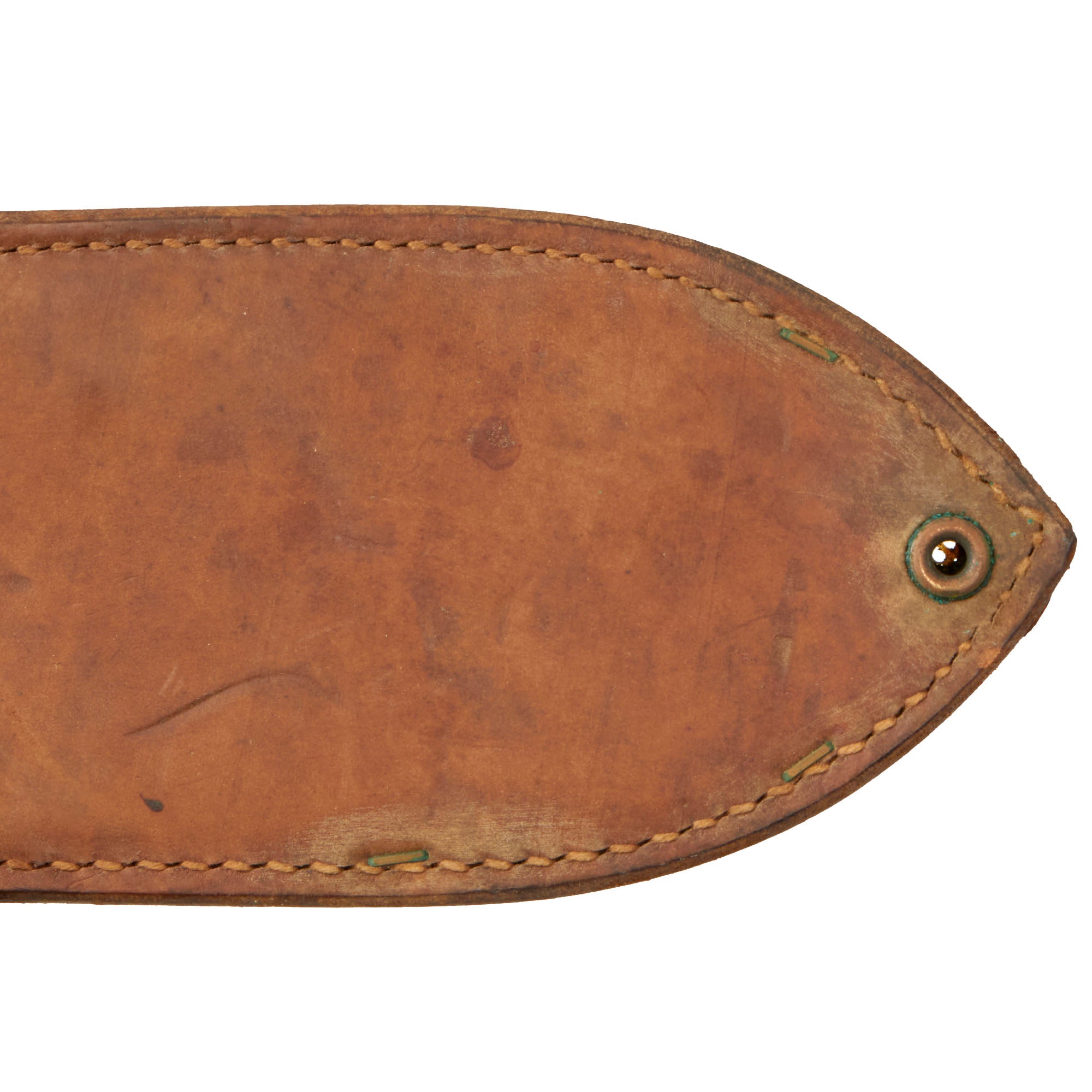 The scabbard is the standard heavy leather construction with a brass throat. The back is marked on the belt hanger with U S M C / BOYT / 45, indicating 1945 manufacture by Boyt Harness Co of Des Moines Iowa, a major leather goods supplier during WWII. They made various slings, holsters, scabbards, and other items for the war.