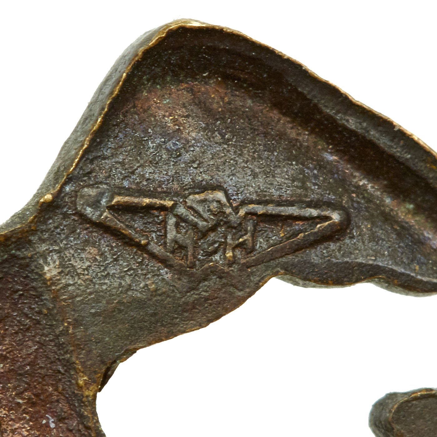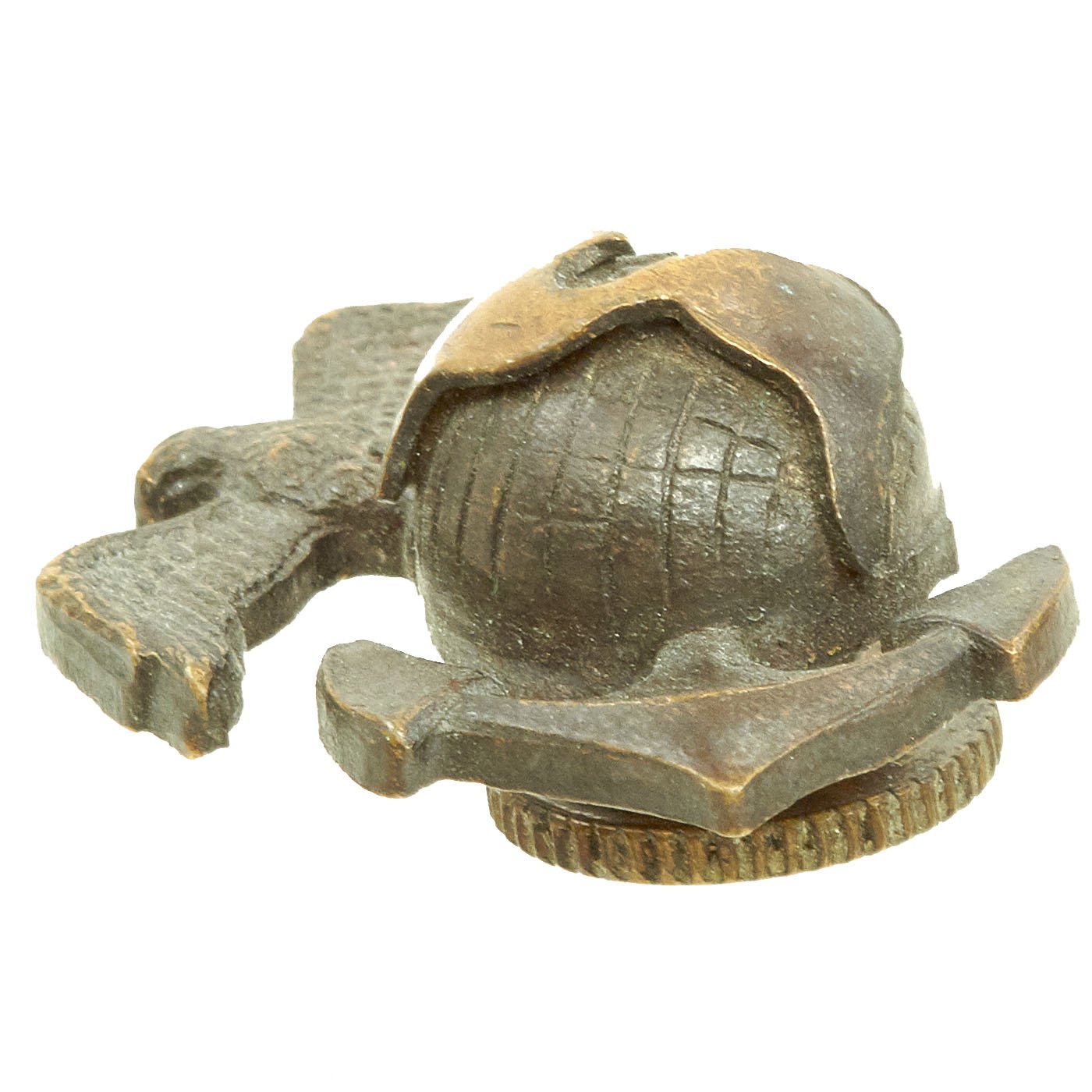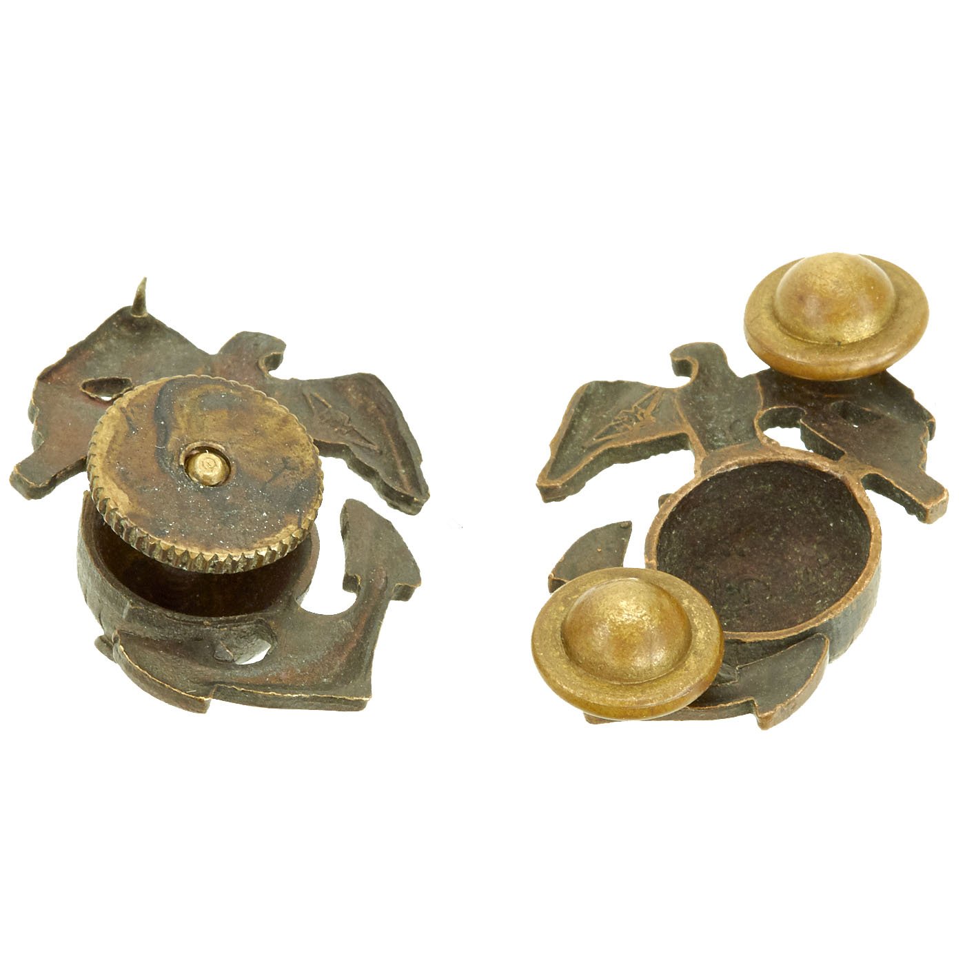 Original Item: Only One Set Available. This is a very nice WWII United States Marine Corps officer Eagle Globe Anchor emblem set, with a left and right facing eagle. The eagle, globe and unfouled anchor is in blackened brass with a nice aged patina. Both are marked with the H&H in wings for Hilborn & Hamburger manufacture. One is a screw back attachment, while the other has two push pins.