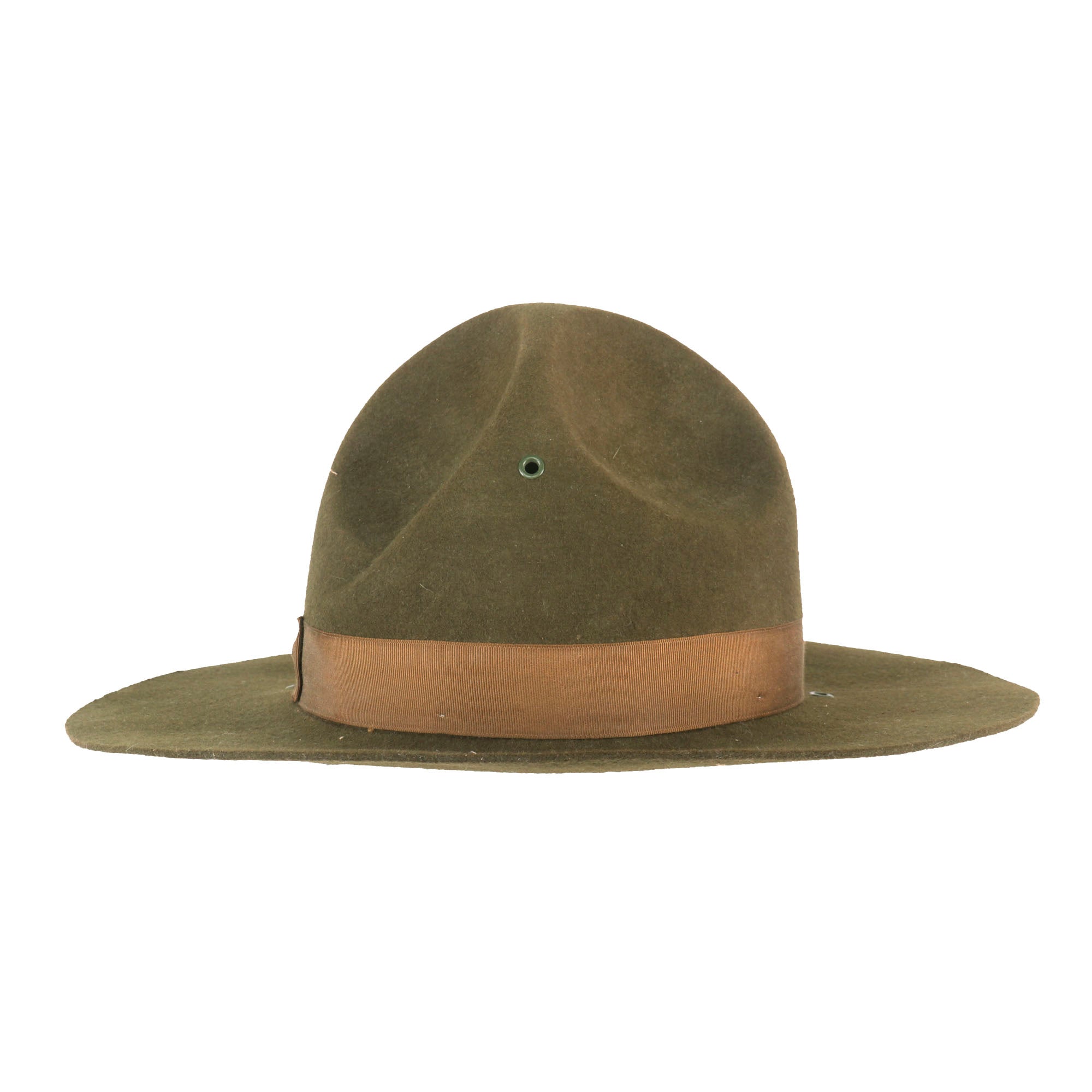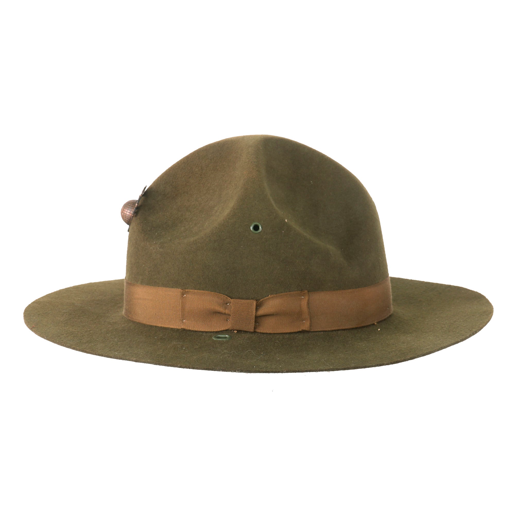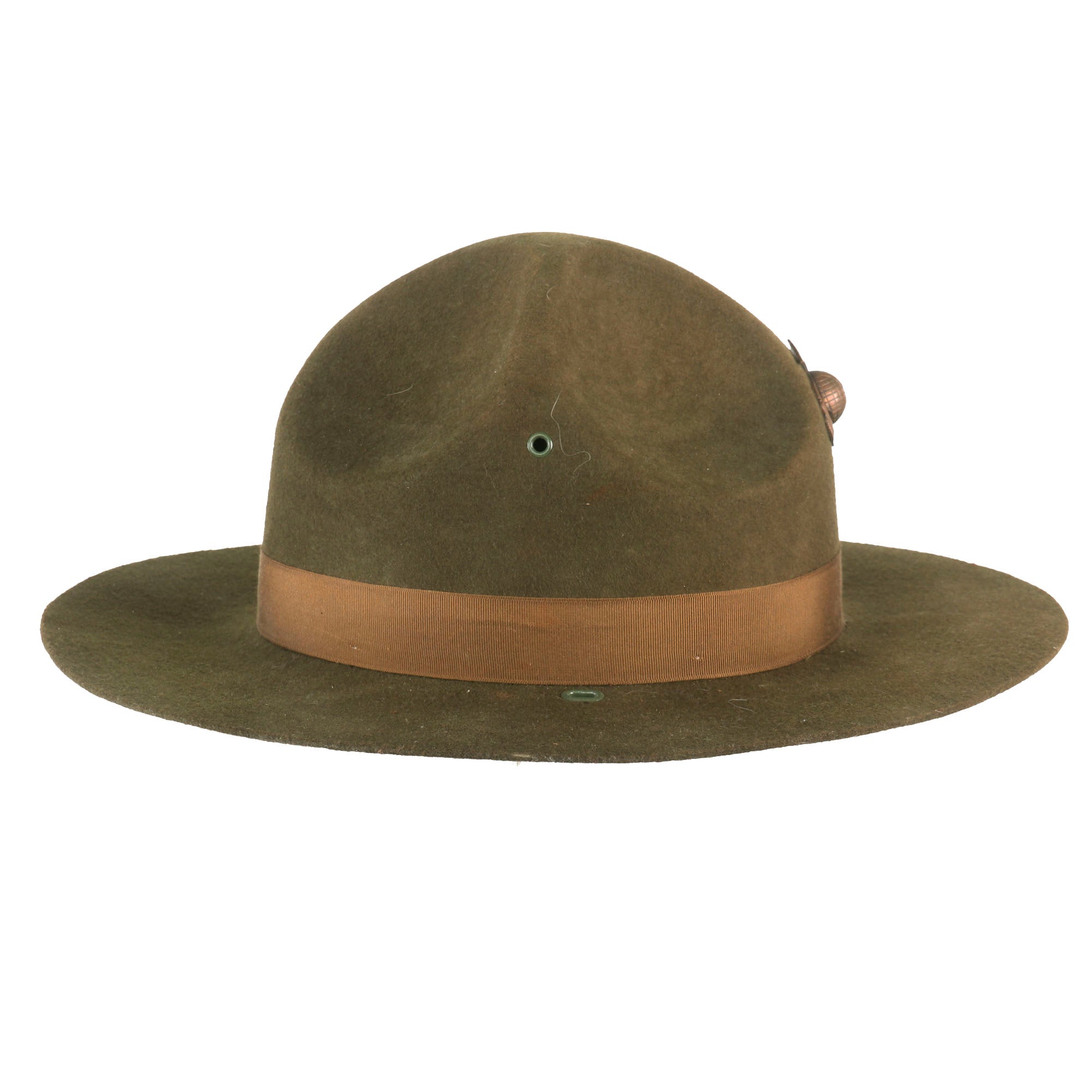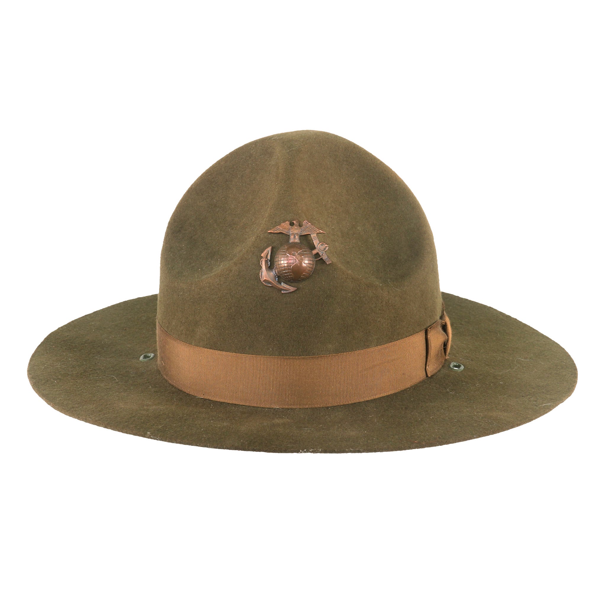 Original Item: Only One Available. This is a very nice example of a WWII U.S. Marine Corps M-1912 Campaign Hat. This Pressed-Felt hat comes with an original USMC Eagle, Globe, Anchor (EGA) Device. It is dated 1944 on the sweatband.