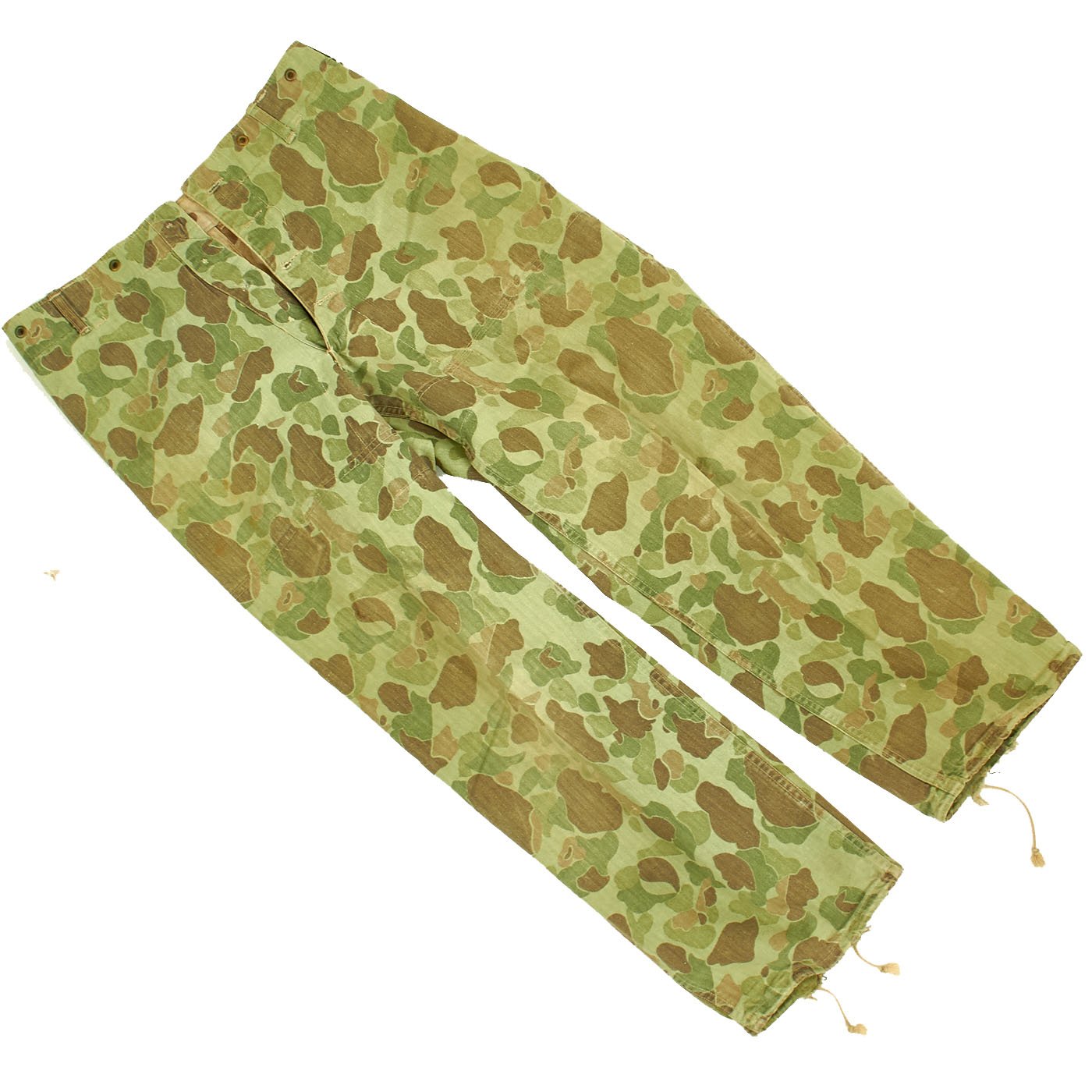 The trousers are in similar condition to the jacket. All snaps and black U.S.M.C doughnut hole buttons are present and in good original condition, with light wear to the "blacked" finish. The reversible open bottom hip pockets on each side are intact, with all snaps working. This is a great example of a USMC reversible camouflage P44 Uniform, one that looks like it was "really there. A very nice example, ready to add to your Pacific War collection!