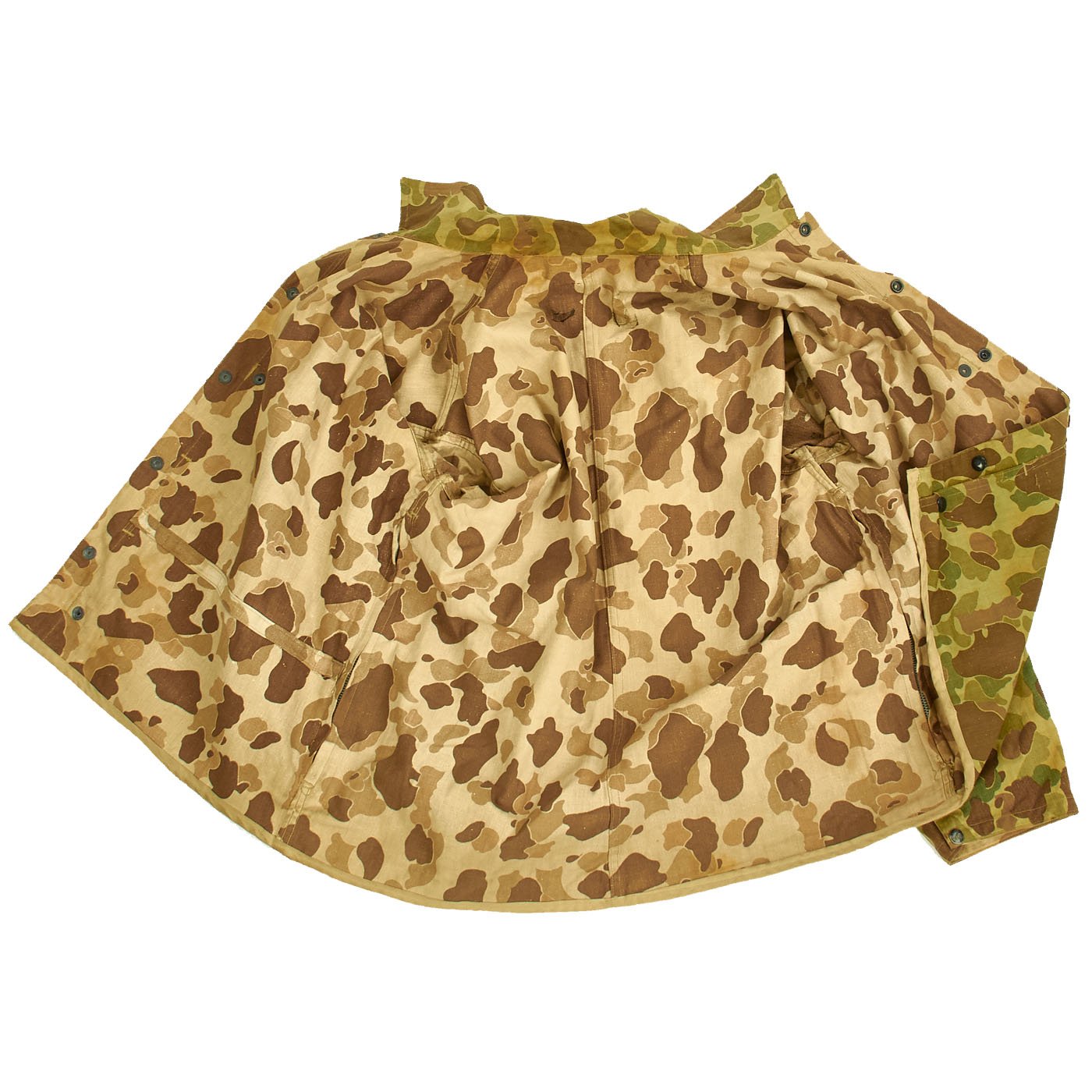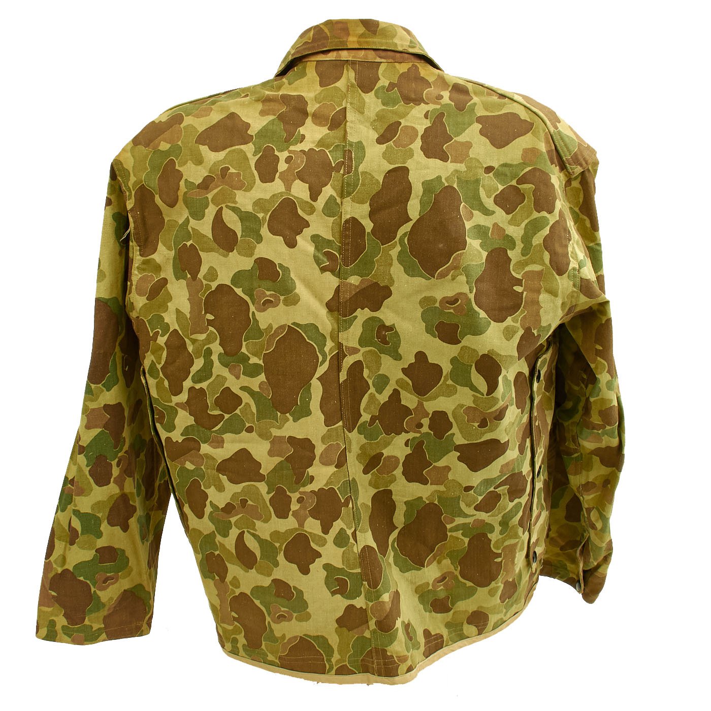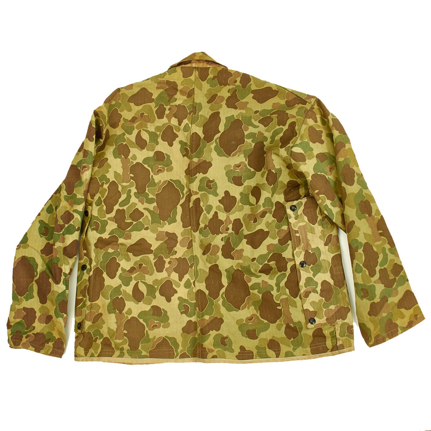 The jacket is in very good overall condition. All snaps and black U.S.M.C doughnut hole buttons are present and in good original condition, with "blacked" finish. Camouflage pattern is vibrant. Like the regular P1944 utility jackets made of "sage green" HBT fabric, the jacket has trademark "side entry" pockets on the chest, which were originally intended for use with flotation "pillows", as well as carrying the usual paraphernalia of the typical combat Marine.