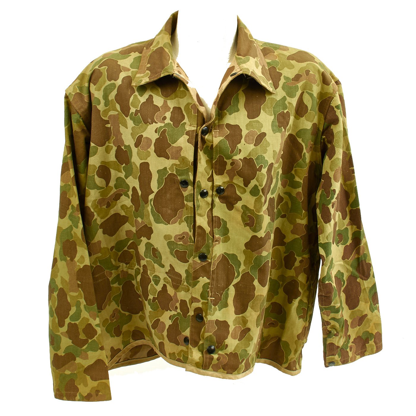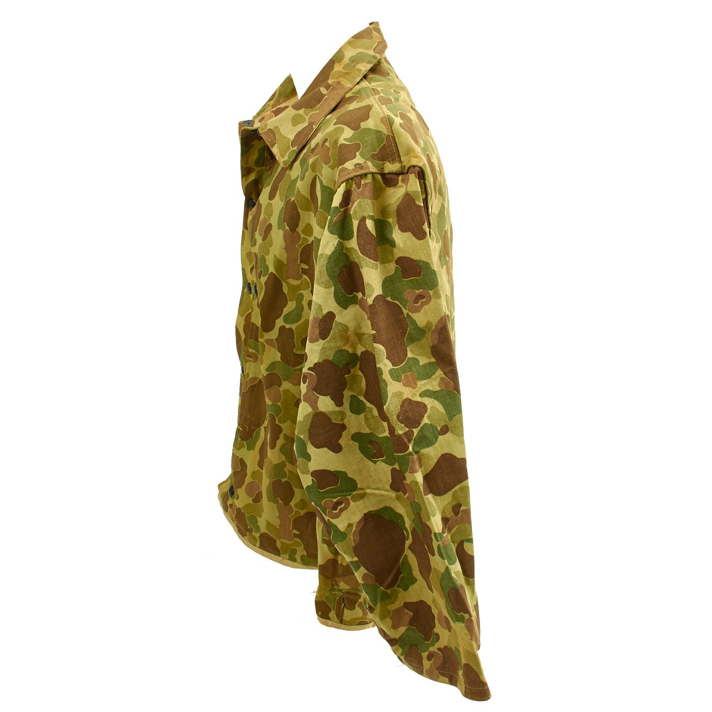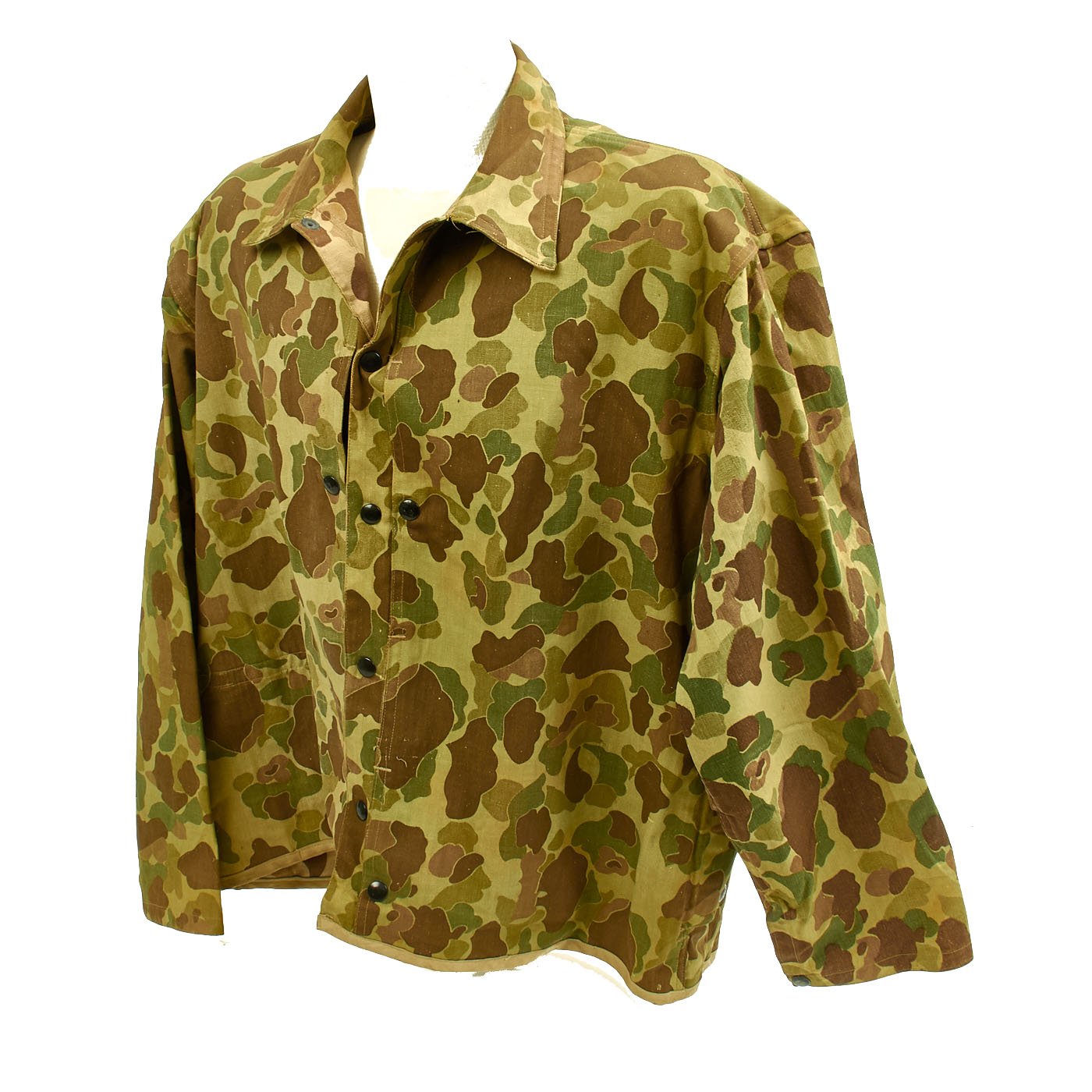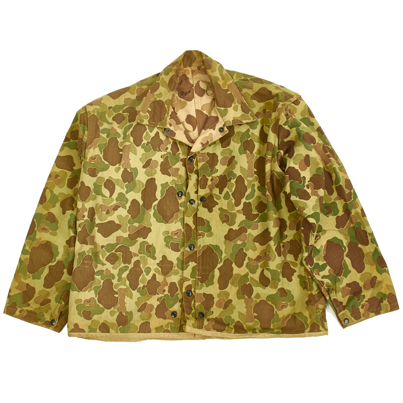 The jacket is in very good overall condition. All snaps and black U.S.M.C doughnut hole buttons are present and in good original condition, with "blacked" finish. Camouflage pattern is vibrant. Like the regular P1944 utility jackets made of "sage green" HBT fabric, the jacket has trademark "side entry" pockets on the chest, which were originally intended for use with flotation "pillows", as well as carrying the usual paraphernalia of the typical combat Marine.