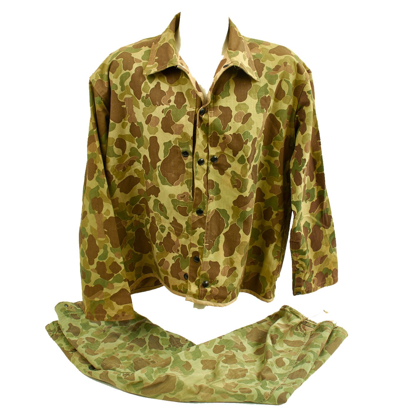 Original Item: Only One Available. This is a very good condition Pattern 1944 United States Marine Corps Reversible Camouflage Utility Uniform Coat & Trouser set. This cotton HBT (Herring Bone Twill) Camouflage pattern uniform was issued to Marines at the end of WWII and during the Korean war. This pattern was seen as an improvement over the one-piece "jungle" coveralls, which lacking a drop seat, made "relieving yourself" difficult in combat situations. However, the Marines who wore the Camouflage on Tarawa and elsewhere were easy to spot when moving (as opposed to be stationary) and the pattern was discontinued. The Uniform Coat and pants were both designed to be reversible. The outer side is the base green "jungle" camouflage pattern, with the tan or "sand" side inside the jacket and pants.