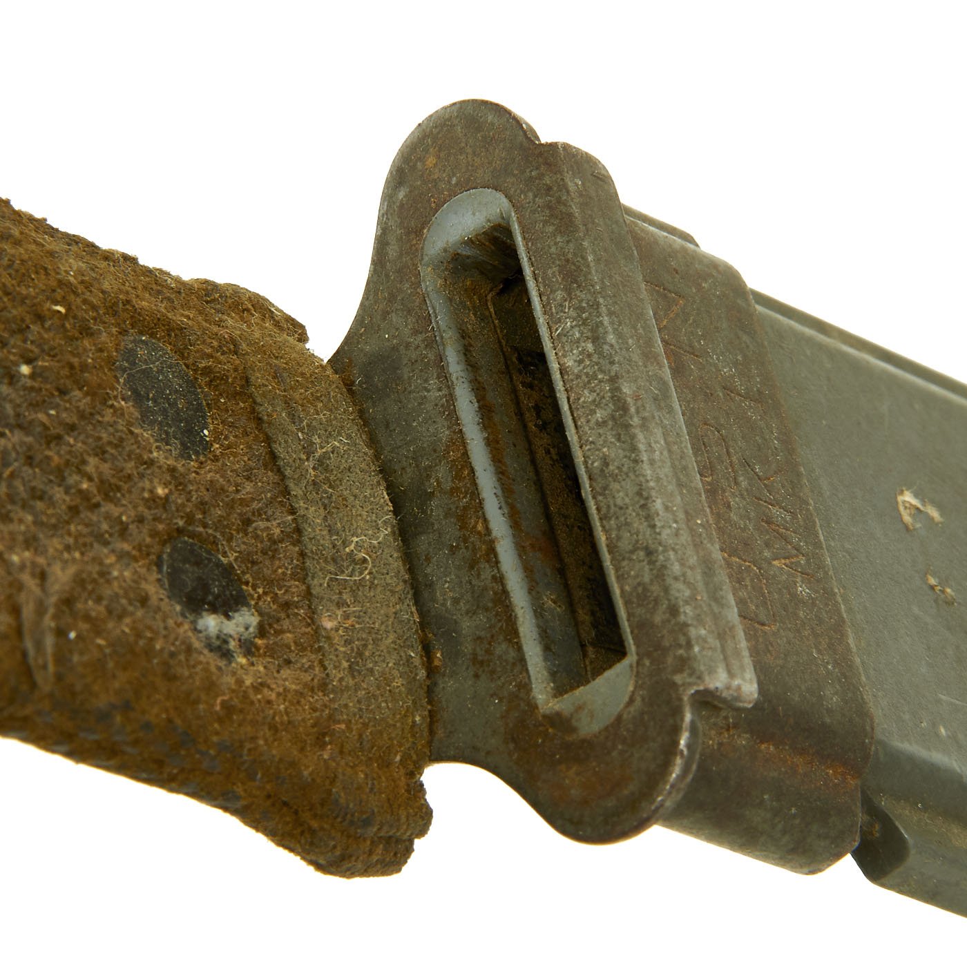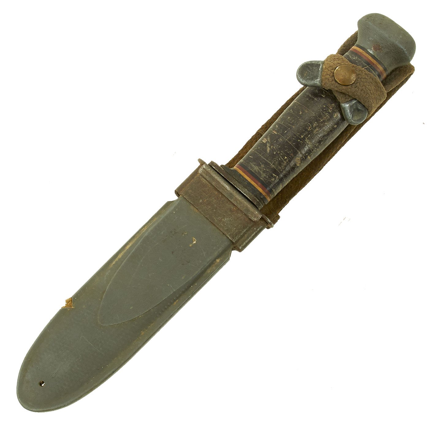 The scabbard is the early MK 1 version, very similar in construction to the M8 scabbard for the M3 fighting knife, with a thermoplastic impregnated cotton fabric body, metal throat, and canvas frog and securing strap. The front of the throat is marked U.S.N MK 1, and the rear is marked NORD - 8114 B.M. Co. with a stylized V P logo. The NORD number is for the US Navy contract it was produced under, which was delivered between March 1945 and May 1945. It was manufactured by Beckwith Mfg Co. a division of Victory Plastics. Scabbard is in good condition, though there is some staining on the canvas from corrosion to the brass and steel rivets, as well as a chip/cut on the side of the scabbard body.