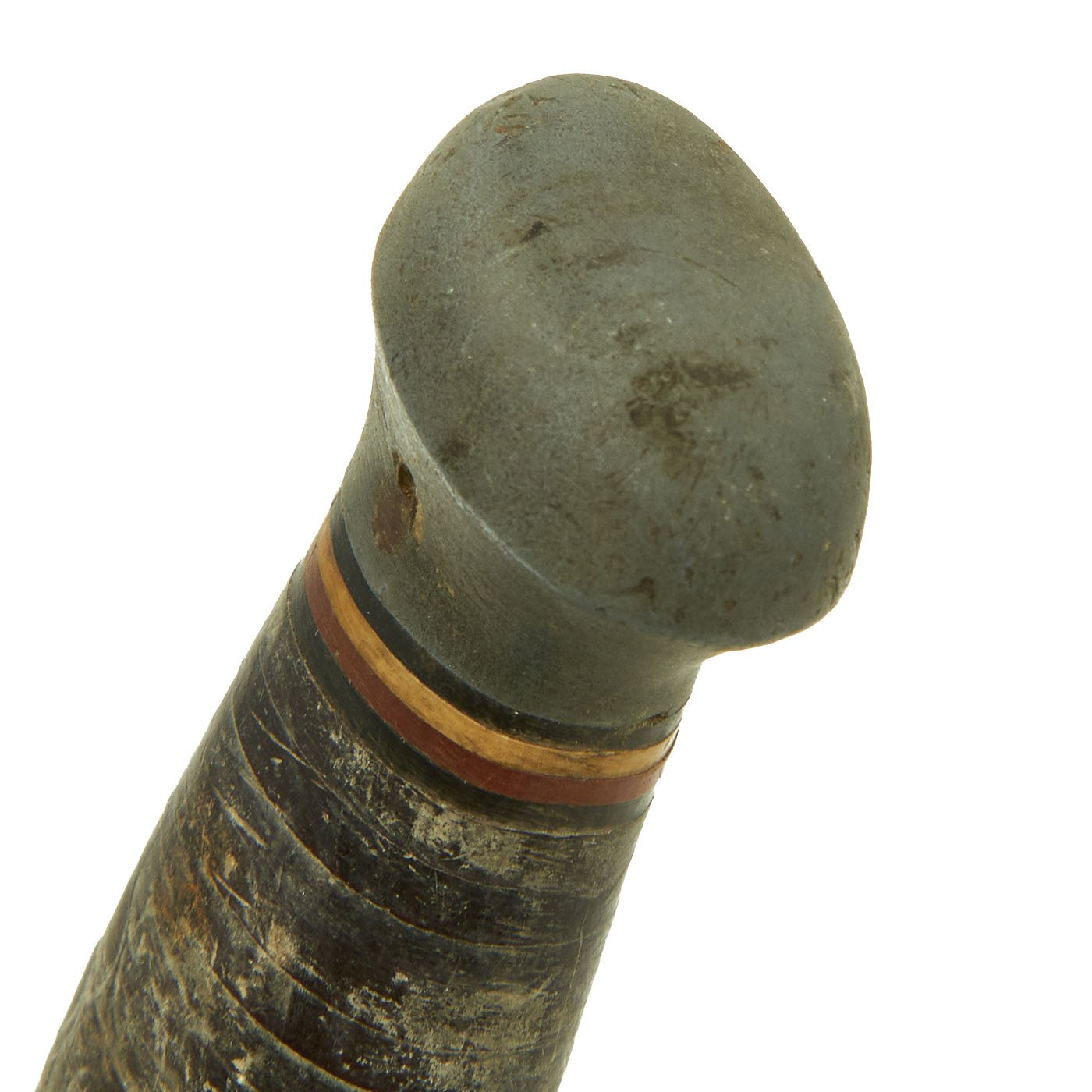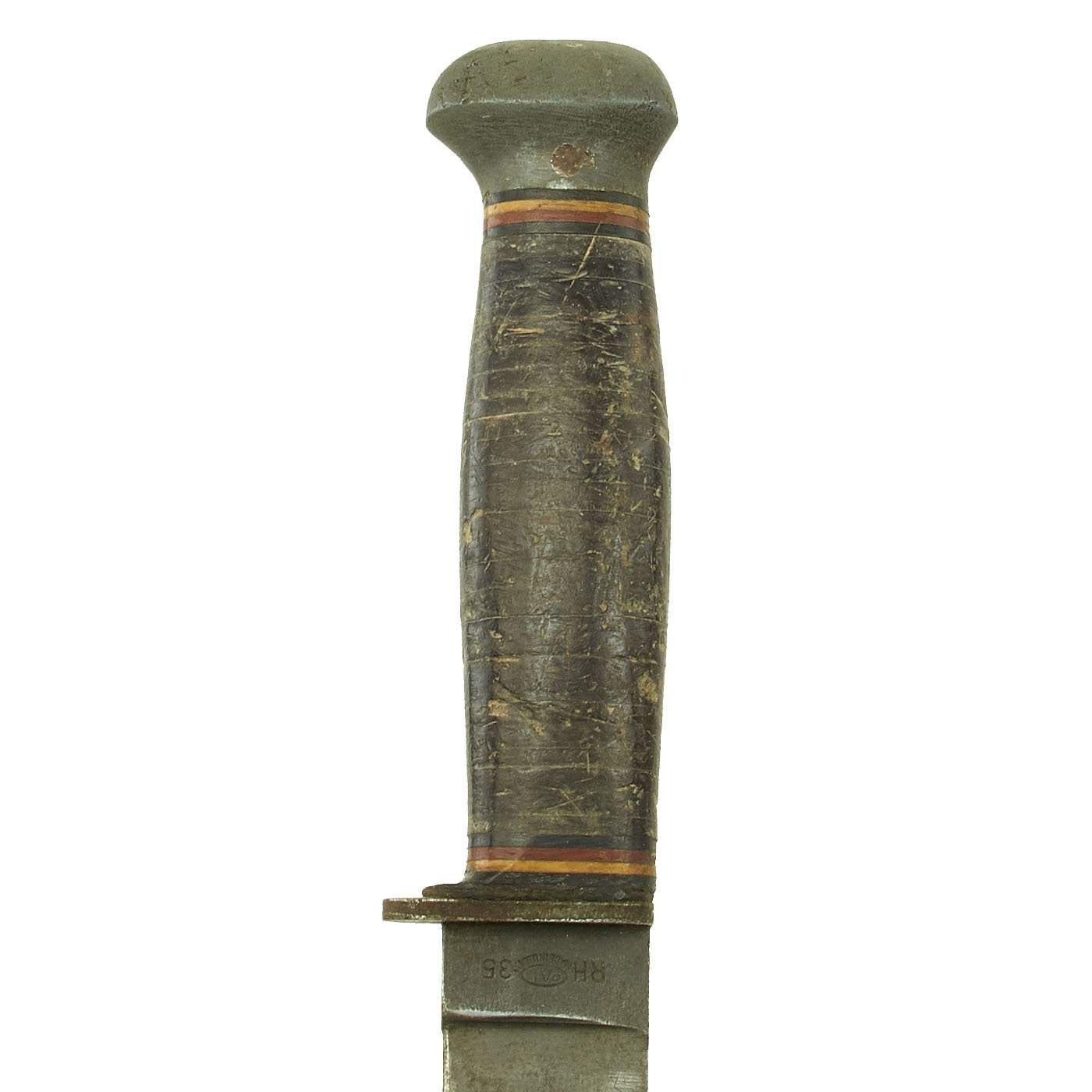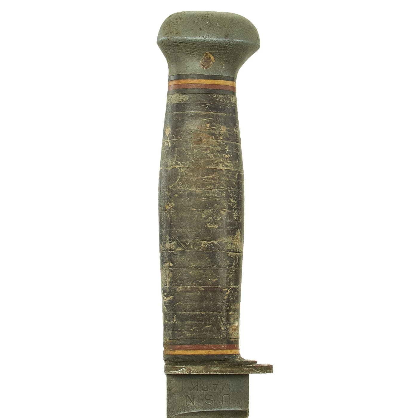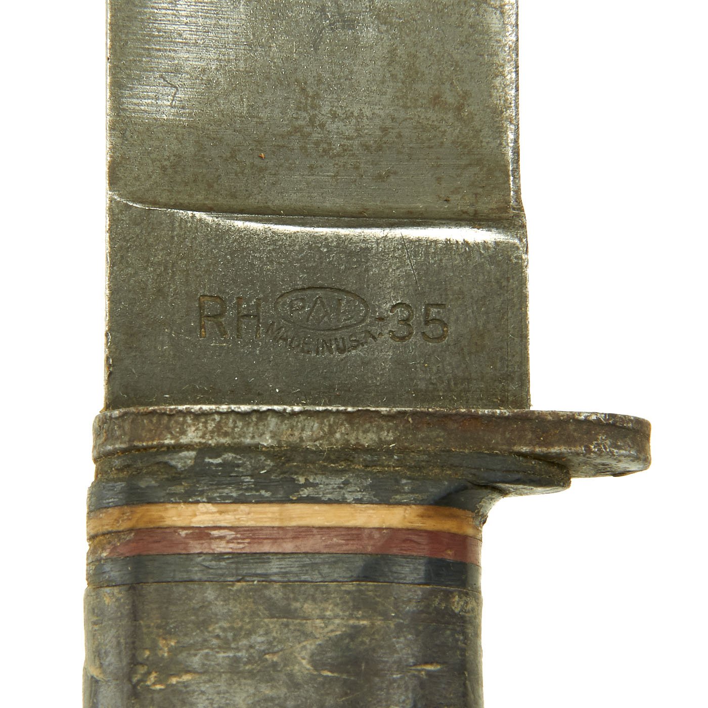 This particular example was manufactured by the PAL Cutlery Company and is clearly marked on the blades ricasso: RH (PAL) -35 / MADE IN USA on one side and U.S.N / MARK 1 on the other side. The knife is in good used condition, though most of the factory finish is worn off. The blade shows only light staining, though it has been sharpened several times, so the blade is slightly shorter than as issued. The hilt is composed of multiple thin leather washers, with the ones closest to the cross guard being of black, red, yellow and black plastic. This same multi-colored washer pattern occurs near the cast aluminum pommel cap as well.