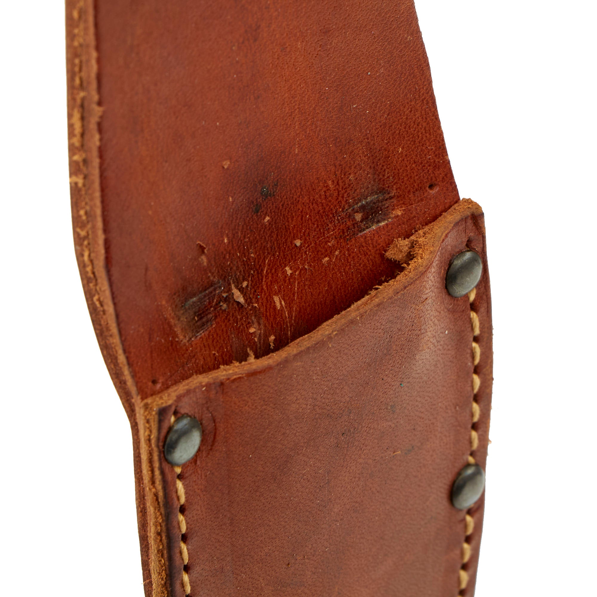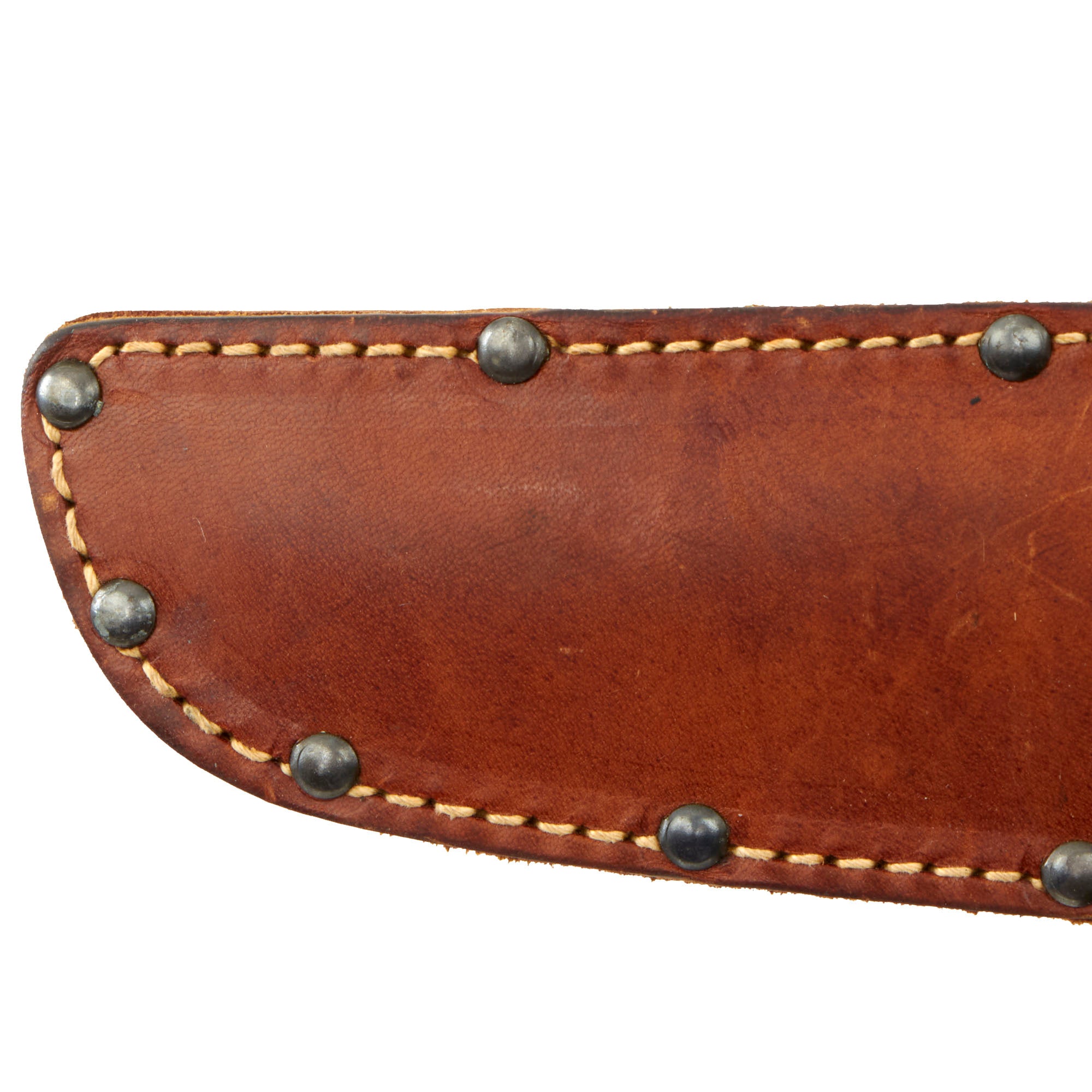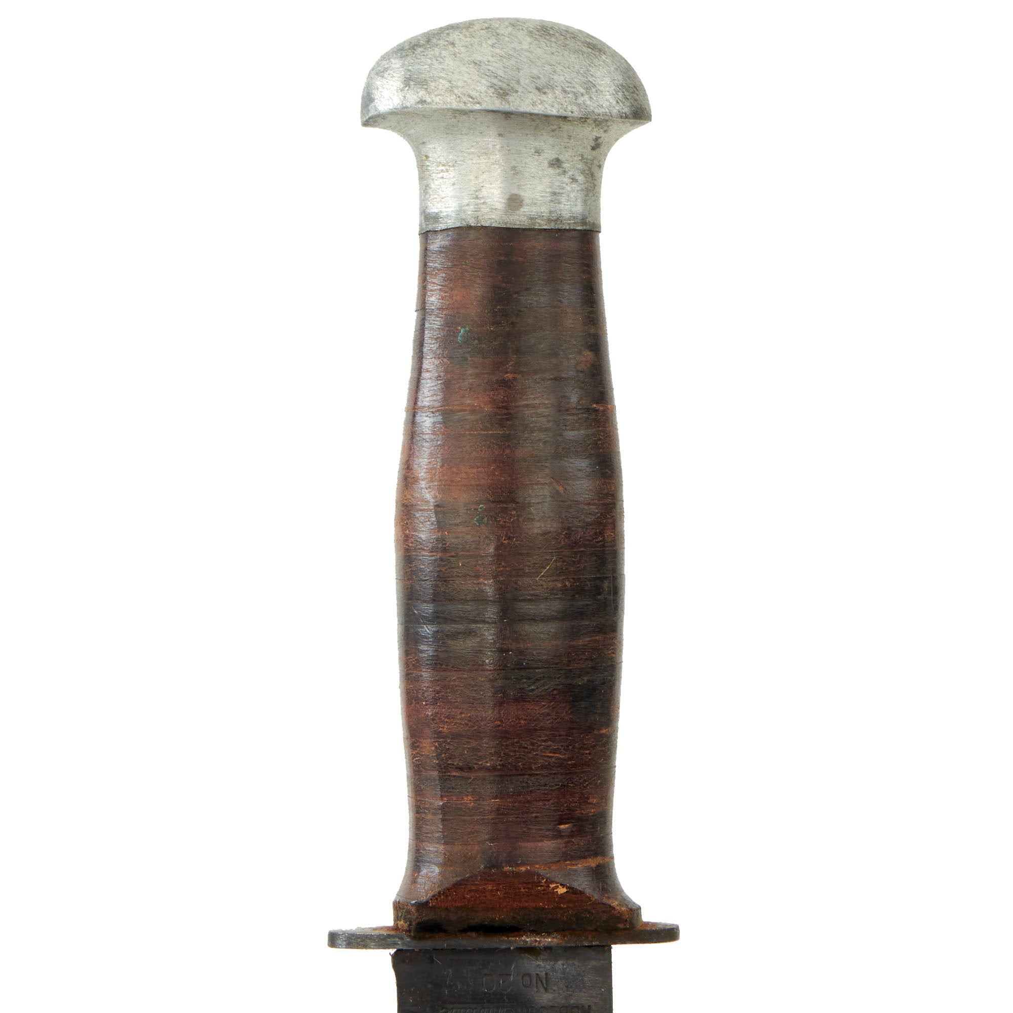 This knife is a nice solid example with all leather grip washers intact and present. The clip-point blade measures 5 1/8" with an overall length of 9 5/8". The blade is nicely marked on the ricasso with U.S.N. M.K.1 on one side, and ROBESON ShurEdge No. 20 on the reverse. Leather sheath present with all stitching intact and in good condition, though the retaining strap is worn. Overall a nice example of an iconic knife used in WWII.