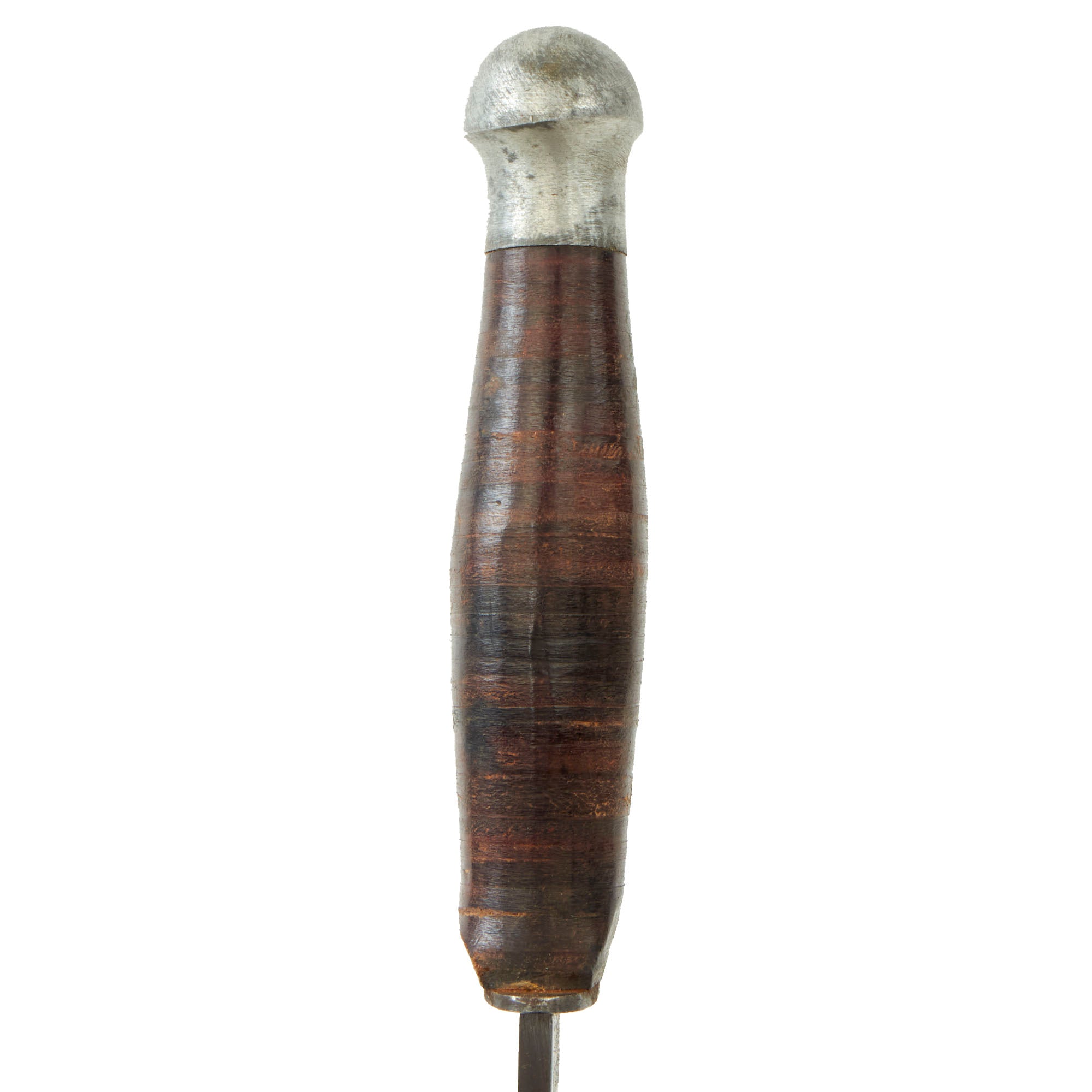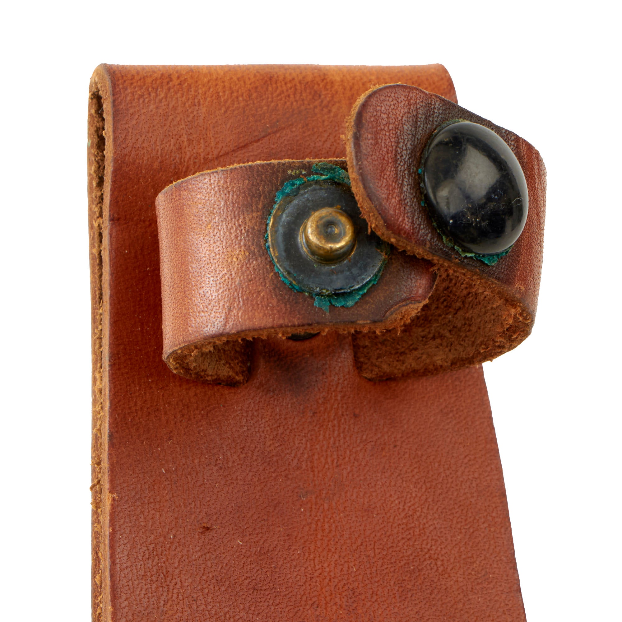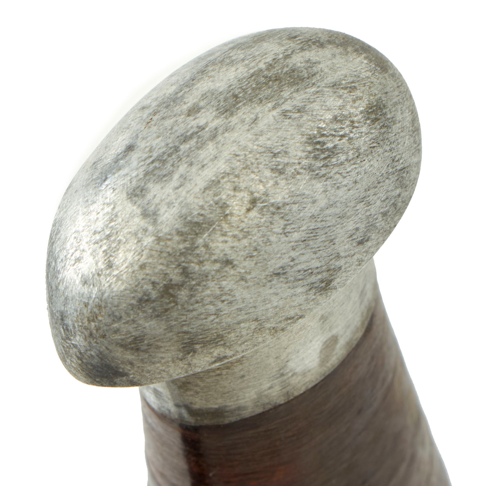 This knife is a nice solid example with all leather grip washers intact and present. The clip-point blade measures 5 1/8" with an overall length of 9 5/8". The blade is nicely marked on the ricasso with U.S.N. M.K.1 on one side, and ROBESON ShurEdge No. 20 on the reverse. Leather sheath present with all stitching intact and in good condition, though the retaining strap is worn. Overall a nice example of an iconic knife used in WWII.