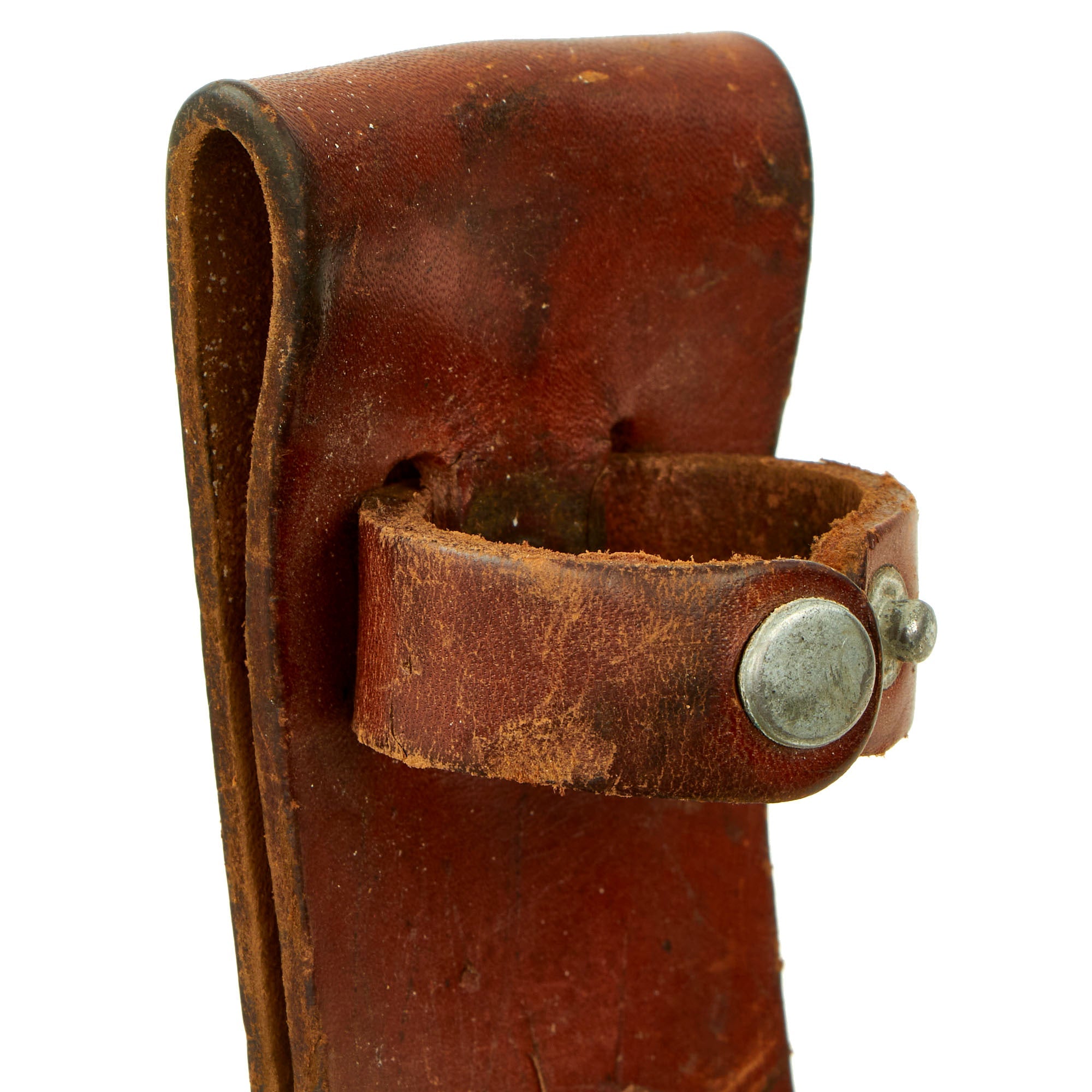 This knife is a nice solid example with all leather grip washers intact and present. The clip-point blade measures 5 1/8" with an overall length of 9 5/8". The blade is nicely marked on the ricasso with U.S.N. on one side, and ROBESON ShurEdge No. 20 on the reverse. Leather sheath present with all stitching intact and in good condition, though the retaining strap is worn. Overall a nice example of an iconic knife used in WWII.