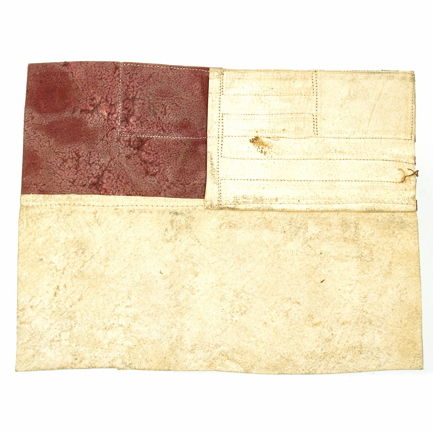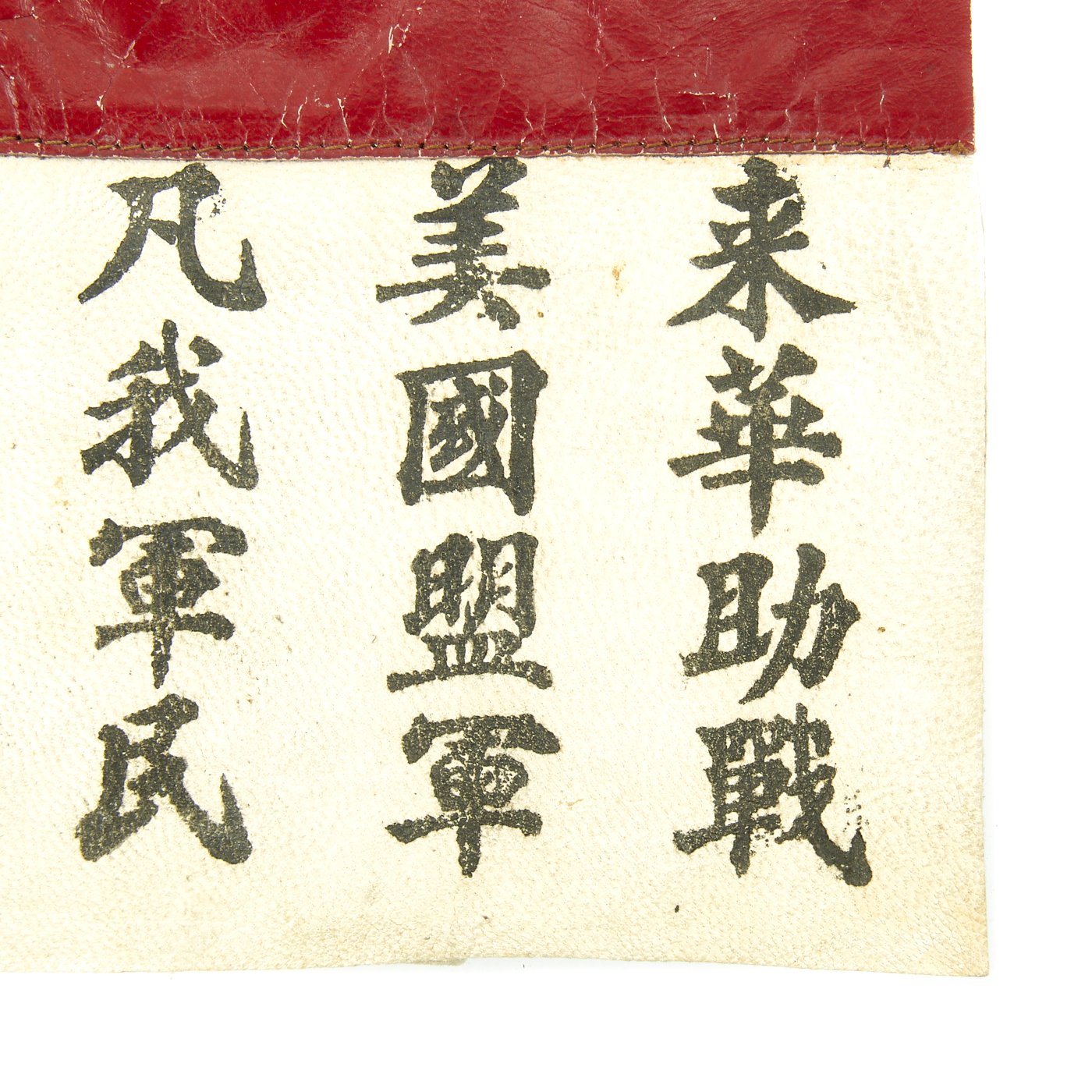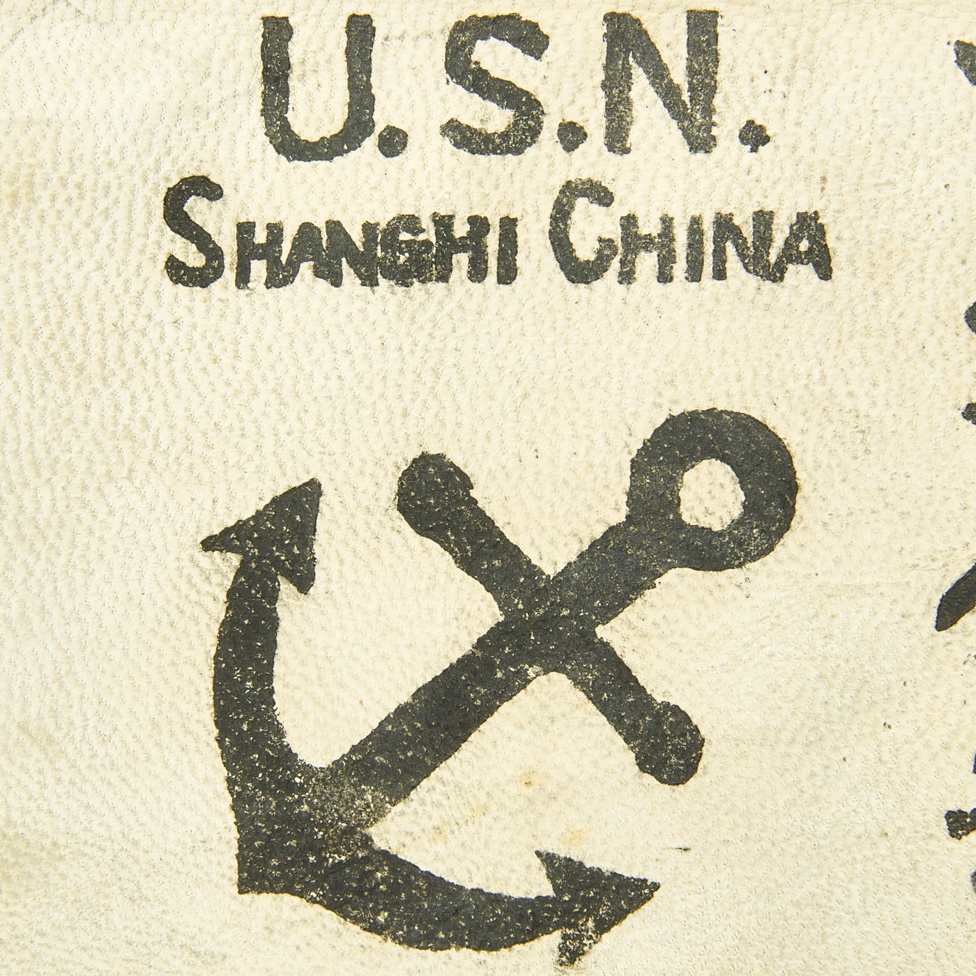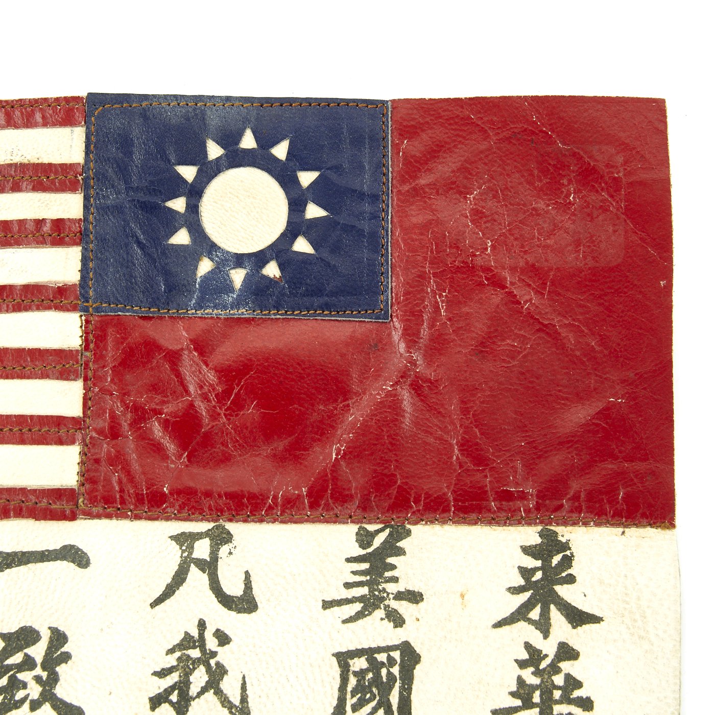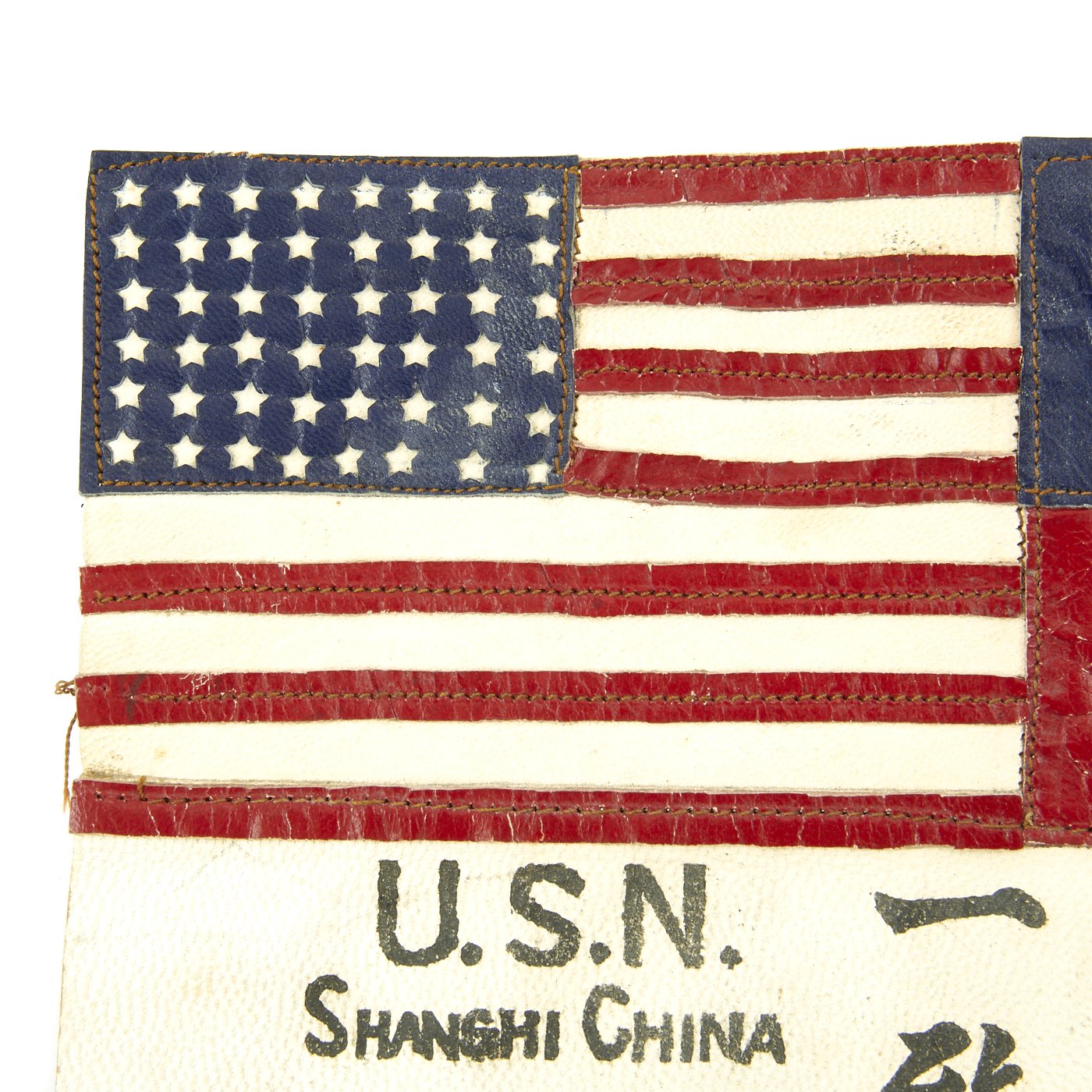 Original Item: Only One Available. This is an excellent condition leather multi-piece blood chit that features a hand painted WWII Chinese National flag, Chinese Characters, an American flag and U.S.N SHANGHI CHINA with anchor. Chit measures 9 1/2 inches by 7 1/4 inches and is multi-layer construction. This would have been stitched to the back or inside lining of a U.S. Naval Aviator flight jacket. A very rare example, in wonderful condition.