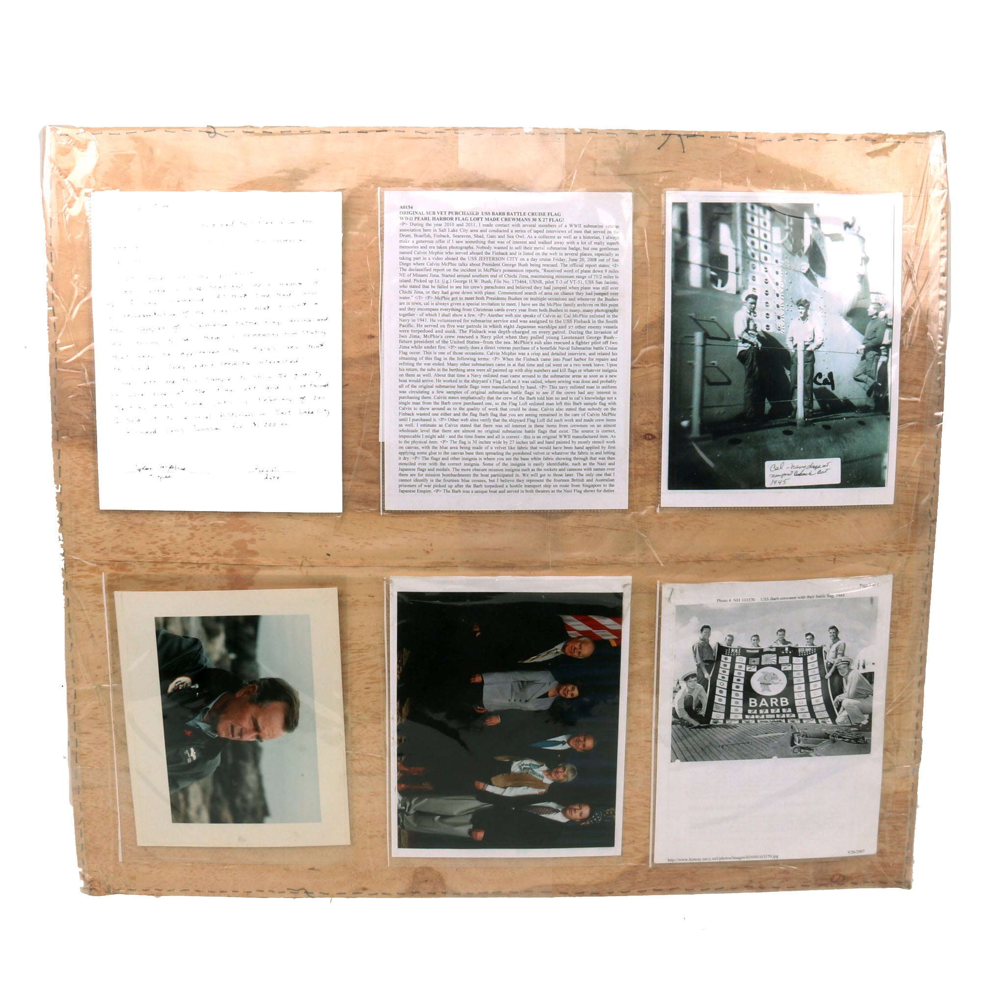 • The back of the flag has several pages of provenance and research on the flag and its previous owner, Calvin McPhie, who served aboard the USS Finback, which is the submarine that saved future president George H. W. Bush. There are photos of McPhie with the Bushes.