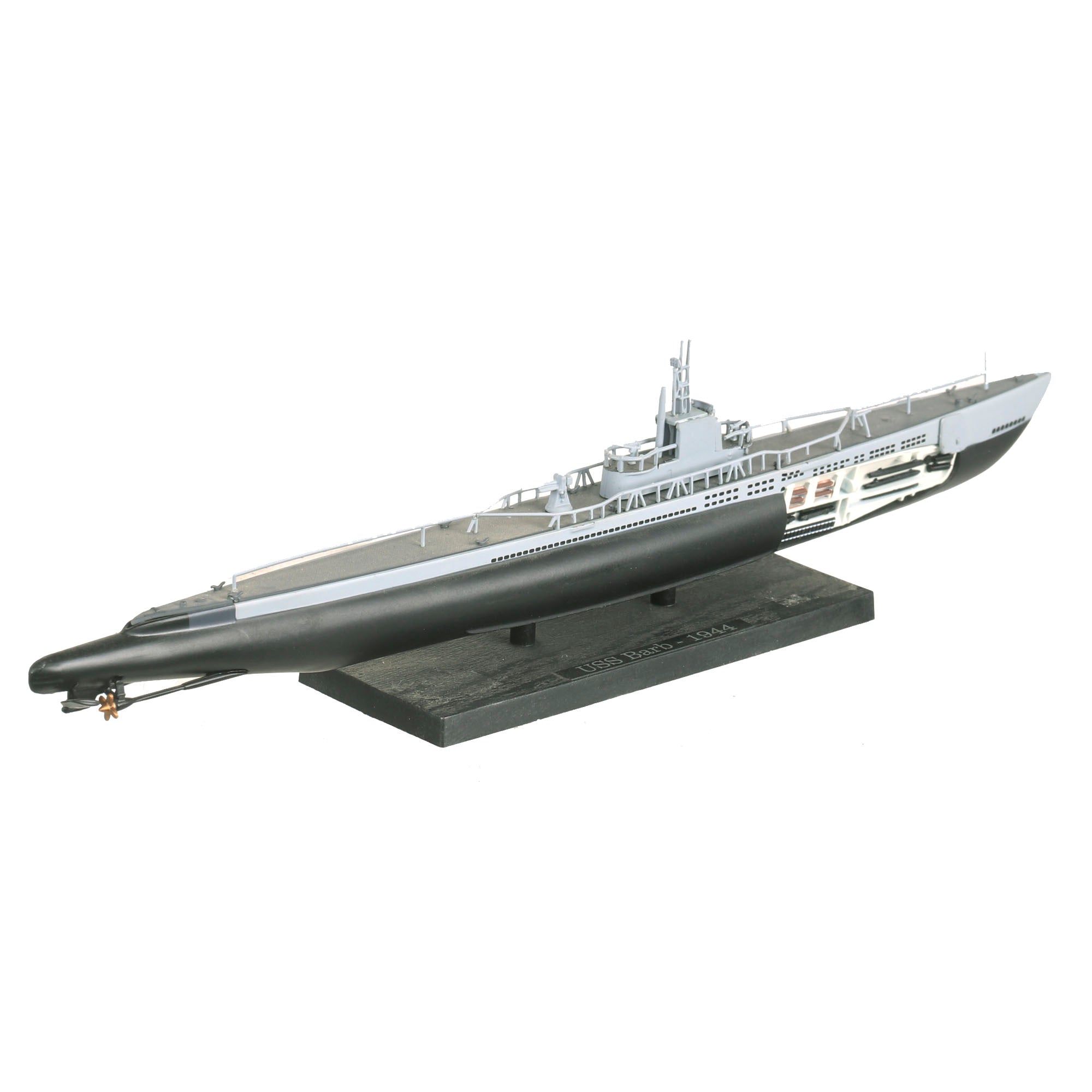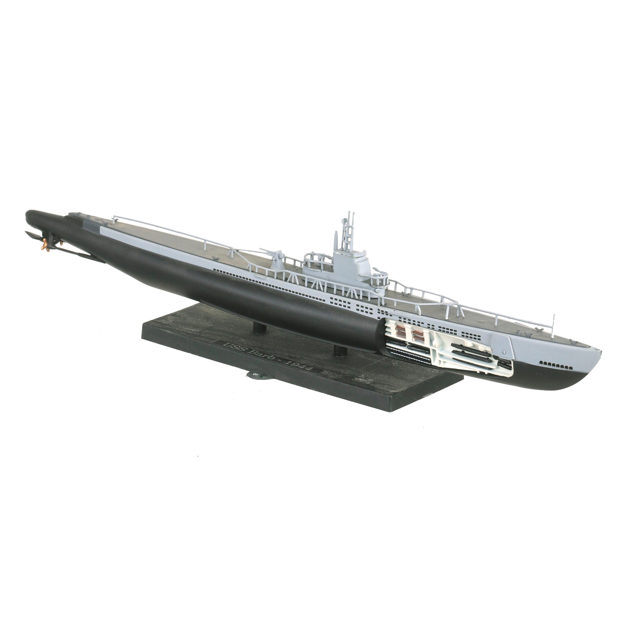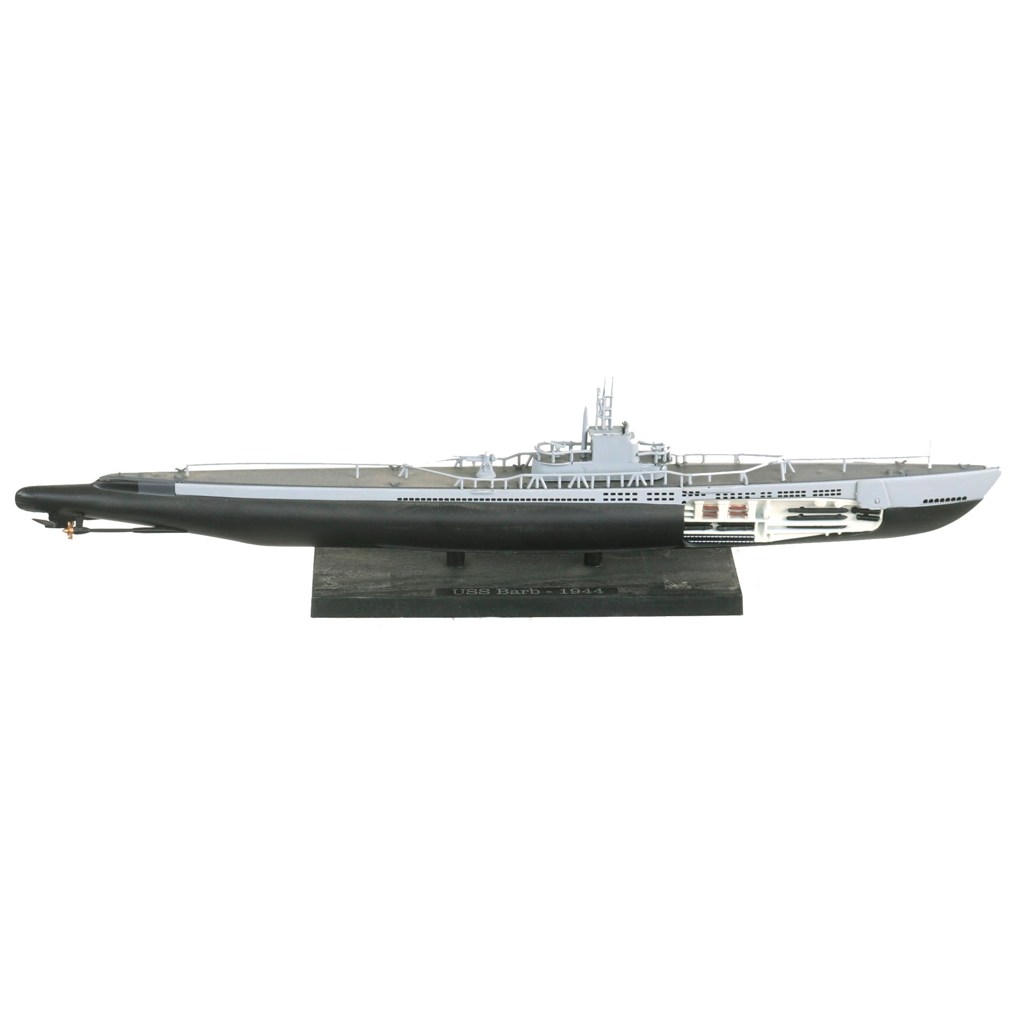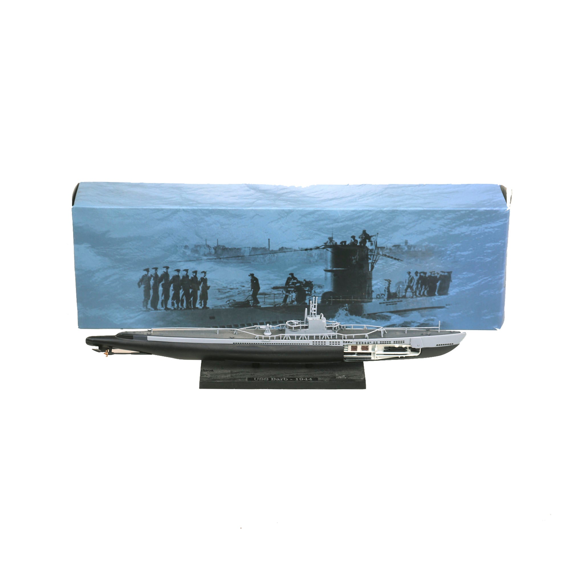 • Small scale model of the USS Barb also showing part of her interior with USS BARB - 1944 on a small plaque. Model is roughly 11” long and is in its original box. From the Editions Atlas Collection.