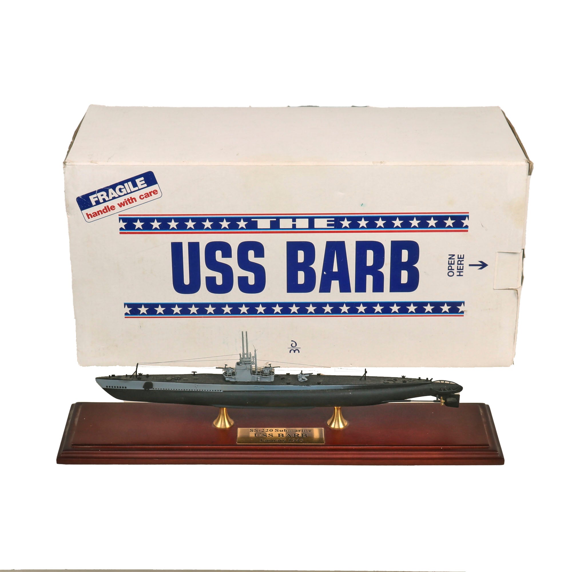 • Larger 1:300 Scale replica of the USS Barb made by the Danbury Mint, comes with a certificate of authenticity, original receipt for the model which cost roughly $300. Comes in its original box and styrofoam packaging. A fantastic model to have displayed with the Battle flag.
