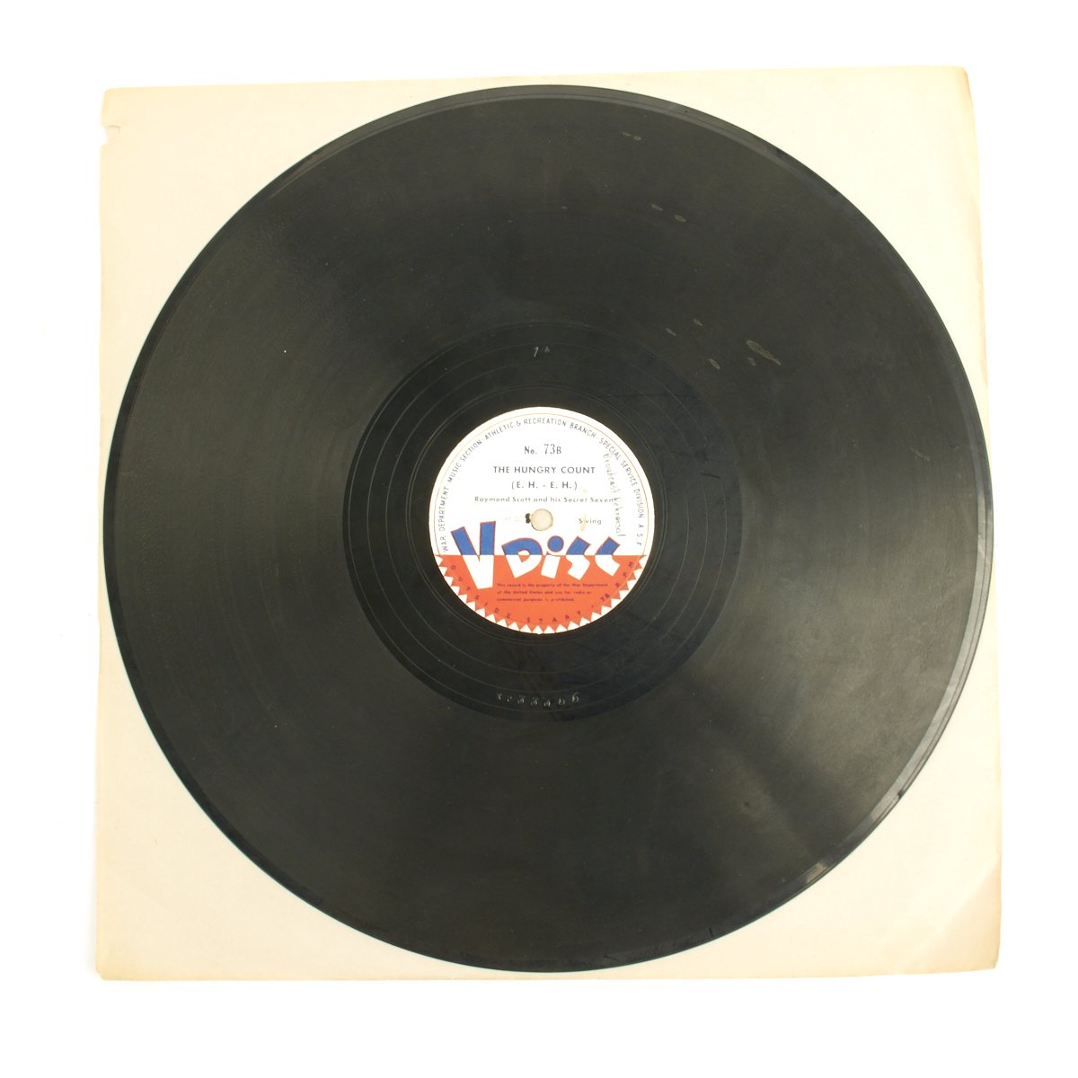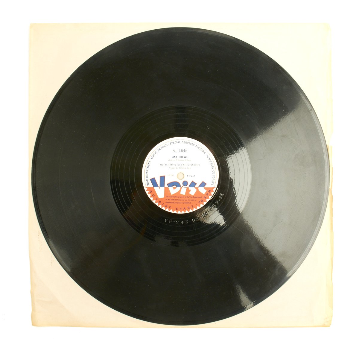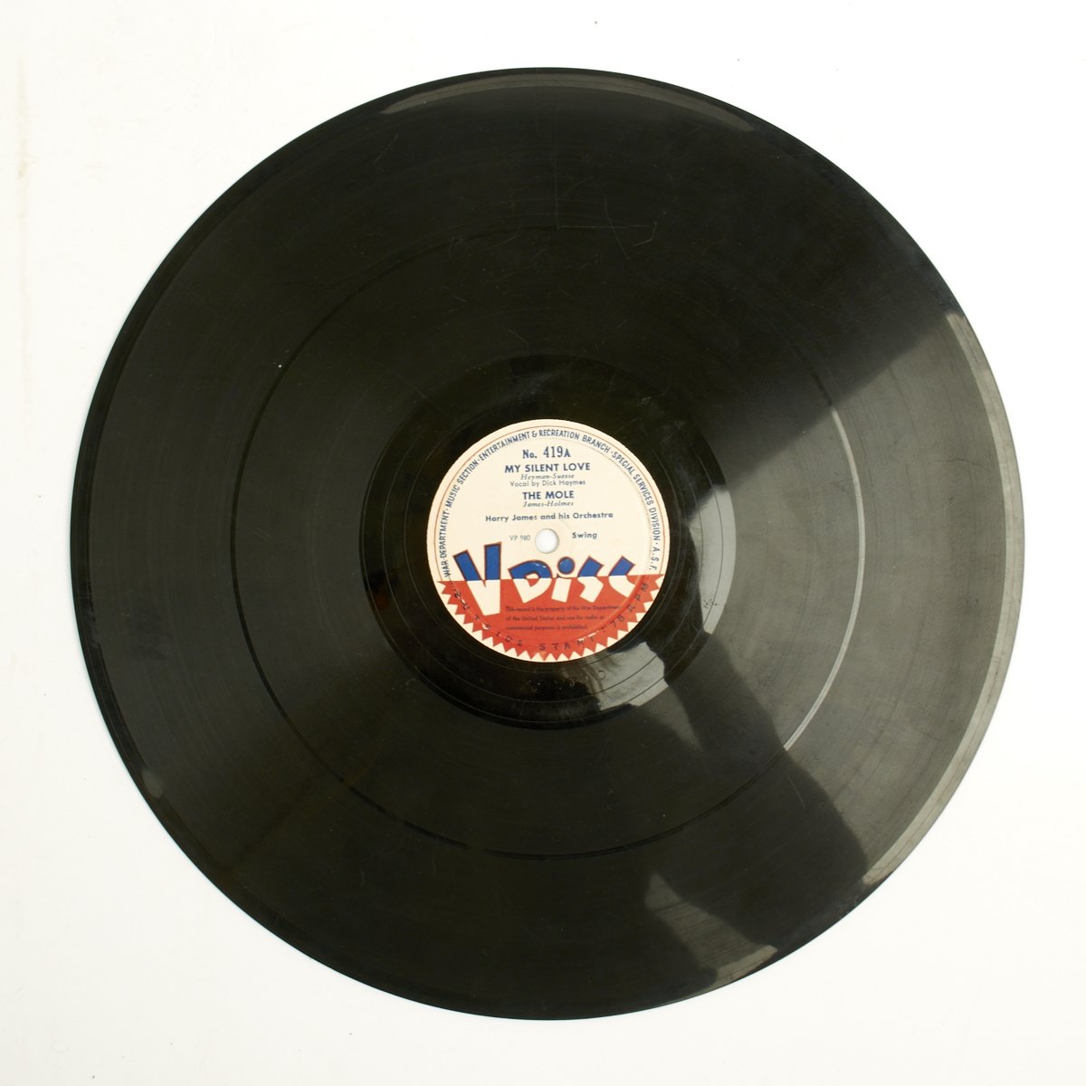 The label was a morale-boosting initiative involving the production of recordings during World War II by arrangement between the U.S. government and record companies. Many popular singers, big bands, and orchestras recorded V-discs. The name referred to both the label and the discs, which were 12-inch vinyl 78s produced from October 1943–May 1949.