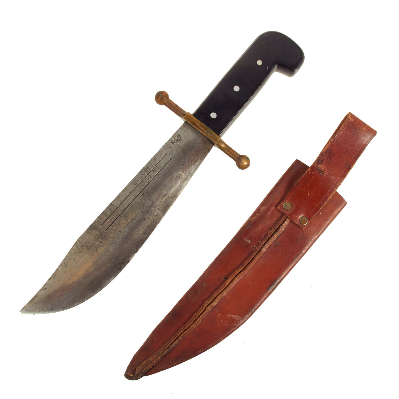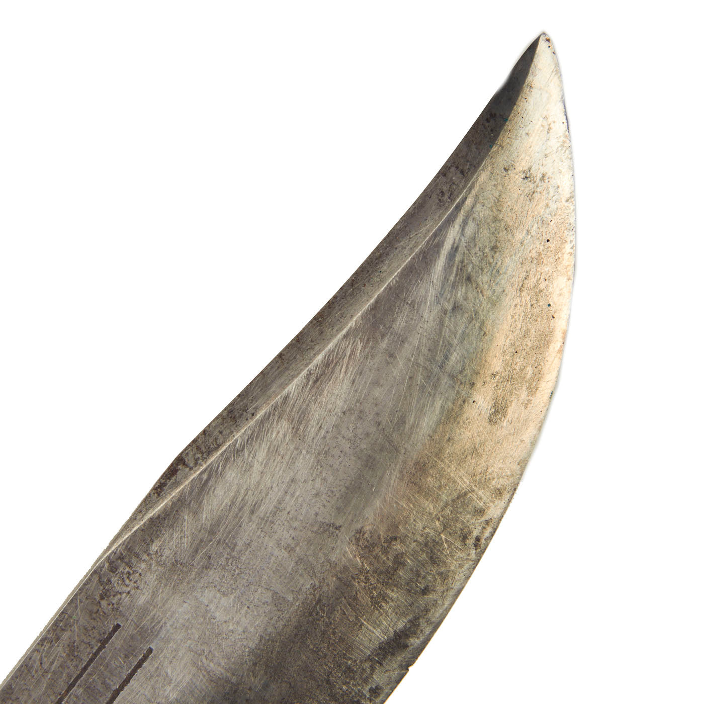 The “V-44” offered here is in very good condition. The knife is 14 ½” in overall length, with a 9 ½” clip point Bowie blade. The blade has a 4 ½” false edge, and a pair of very narrow, 3 5/8” long fullers, near the spine on each side of the blade. The reverse ricasso is marked Kinfolks / INC. near the spine, with a sweeping forward leg of the “K” underscoring the word in an arc. The blade is in lovely condition and is mostly smooth with only some minor staining. The blade shows a moderate amount of freckled surface oxidation. The metal shows some light toning and scattered areas of age discoloration as well, but it is completely free of any real pitting.