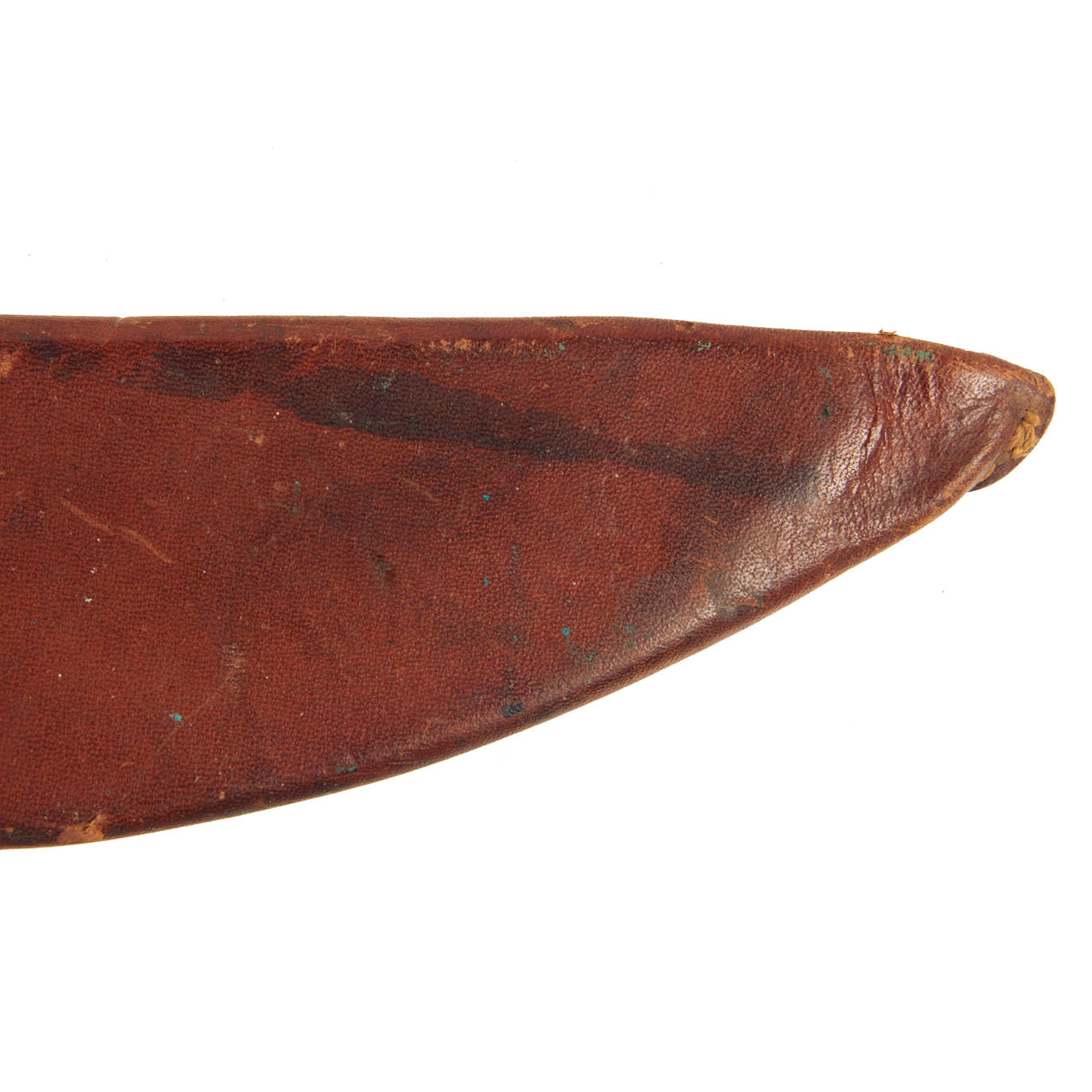 The knife retains its original leather scabbard which is in lovely condition as well. Like all of the scabbards except those delivered with the Western knives, this one has no hilt retaining strap. The scabbard is of the correct pattern and is seamed up the rear with no additional reinforcements or edge stitching. The 4 ½” belt loop is 1 ¼” wide and is secured by a pair of brass rivets that have a deeply oxidized patina and some green surface verdigris. The scabbard is complete and solid, with all of its original stitching tightly in place and no visible loss. The scabbard retains the large majority of its original finish, with only some tiny patches of loss due to surface scuffing, light handling and use. The tip of the scabbard shows the most wear, with some minor creasing at the scabbard tip. The belt loop is solid and intact and remains very crisp, which is uncommon as the design was prone to excessive wear and breakage. Other than some light handling marks and minor wear, the scabbard is really in fantastic condition.