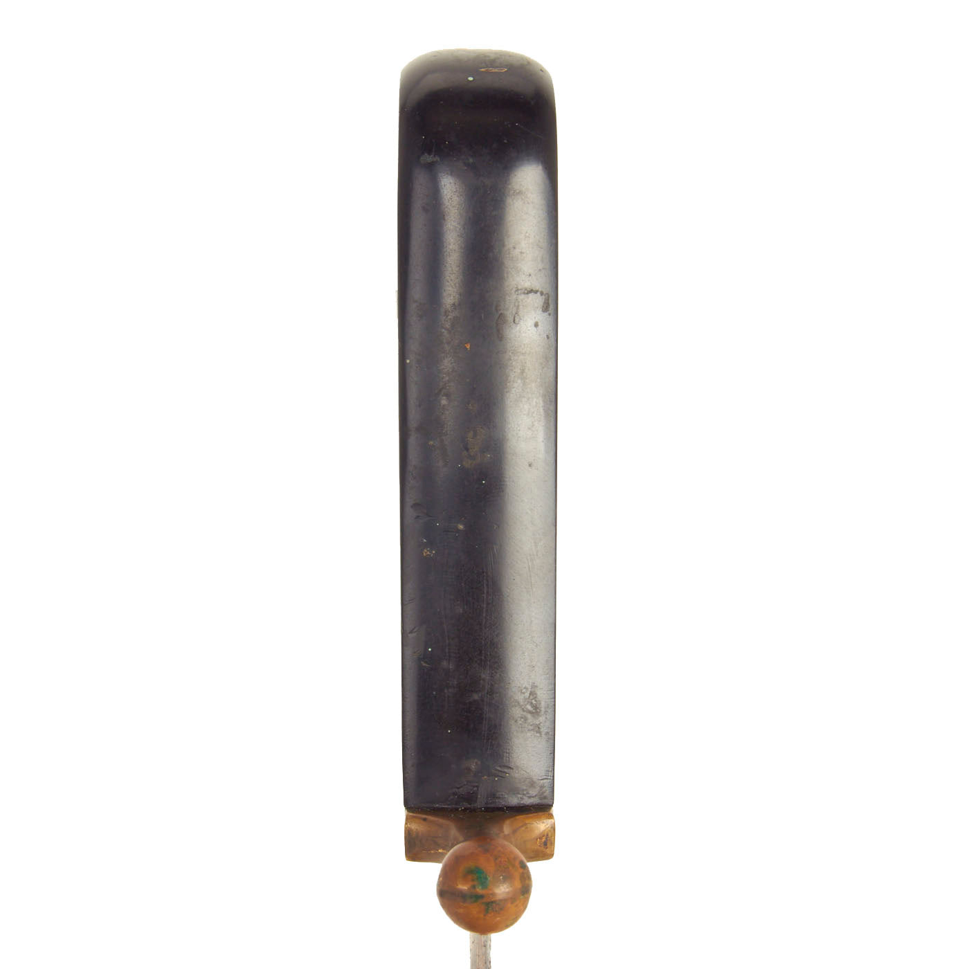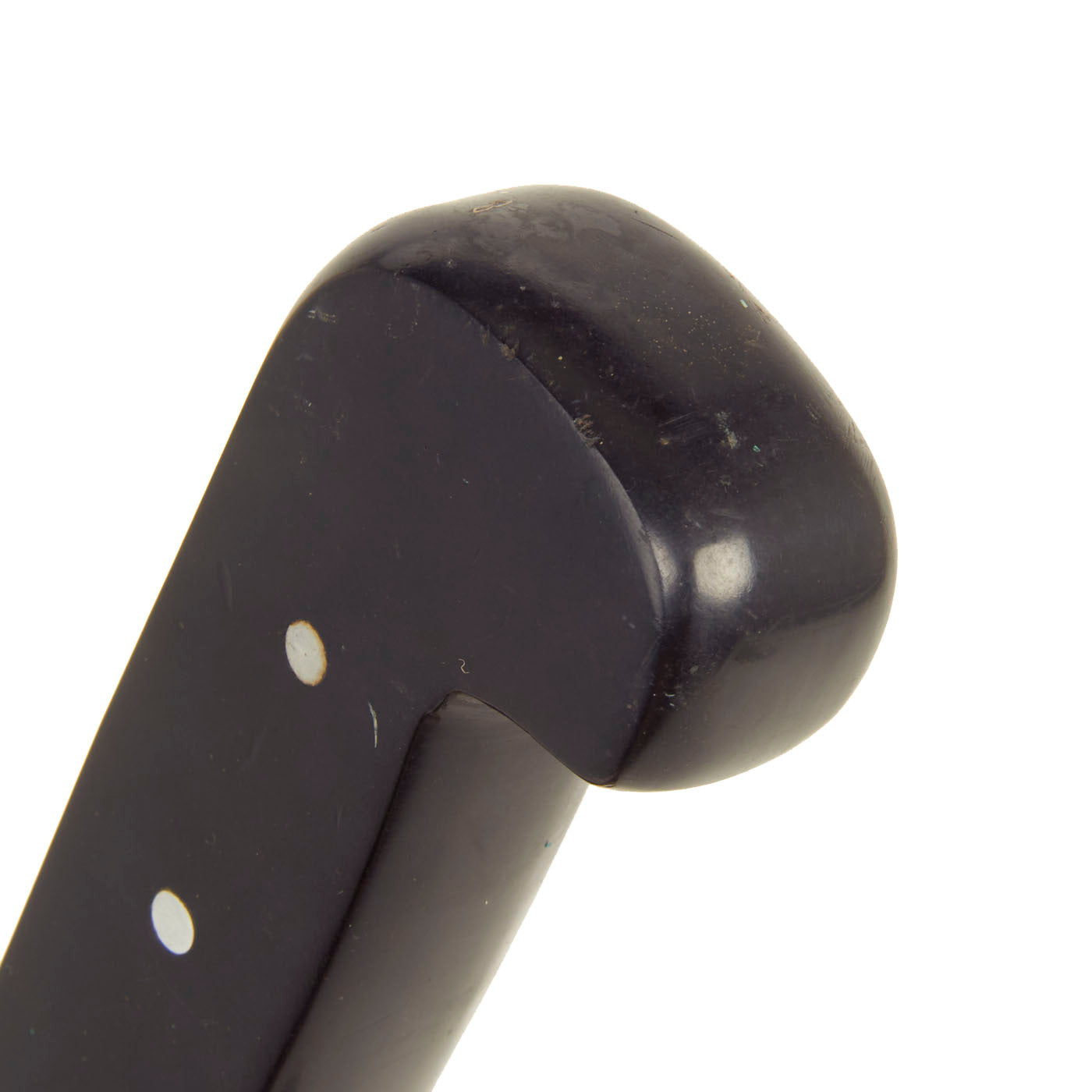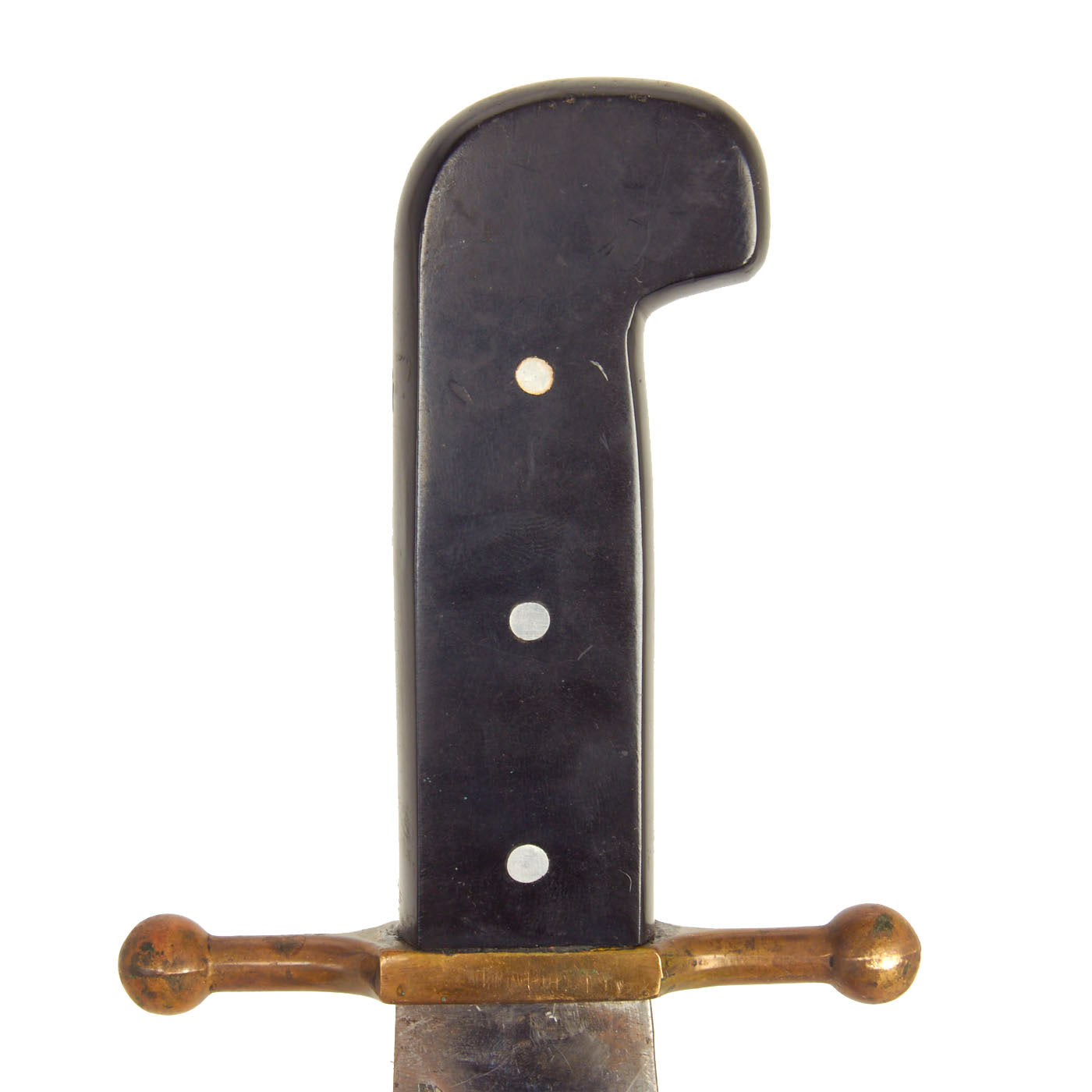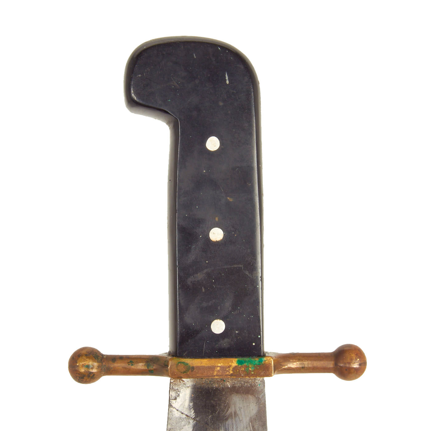 Original Items: Only one available. The very first US Army Air Corps survival knife was adopted in 1934 for use in the “bail out” kit of flyers stationed in tropical climates like Hawaii, Panama and the Pacific Islands. The original knife was the No 18 Machete, which was manufactured by Collins & Company. The original variant had an overall length of around 14 ¼”, with a clip point Bowie style blade that varied between about 9 ¼” to 9 ½” in length. The Collins made variant was initially produced with horn grip scales that were secured by brass rivets and had a brass crossguard with lobe shaped finials at the end that almost resembled a barbell. During the production run of the Collins V-44, four variations were produced. The first two used the horn grip scales, initially secure by brass rivets as noted and the only difference between them was the type of blade stamping identifying the knife and the maker. The third and fourth versions replaced the horn grip with Bakelite, initially secured with brass rivets and with the final variant secured with steel rivets.